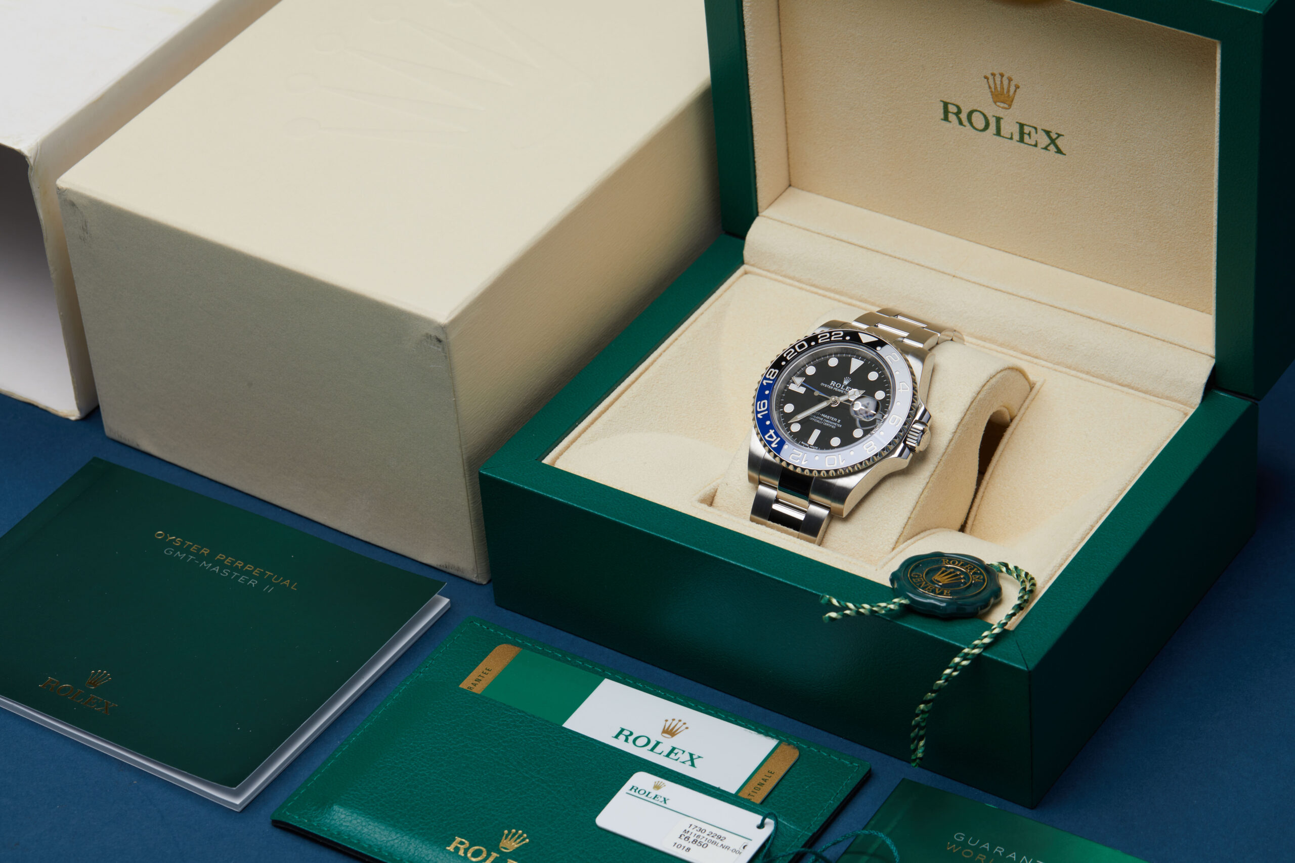 Presented in excellent condition is this stunning example of a 2018 Rolex GMT-Master II 116710BLNR ‘Batman’. The watch features a 40mm stainless steel case, black dial with white luminescent hour markers, stainless steel bezel with black/blue ceramic insert and is coupled to a stainless steel Oyster bracelet. Having been professionally tested for condition and accuracy, it’s deemed to be running perfectly and is showing only very limited signs of wear.
