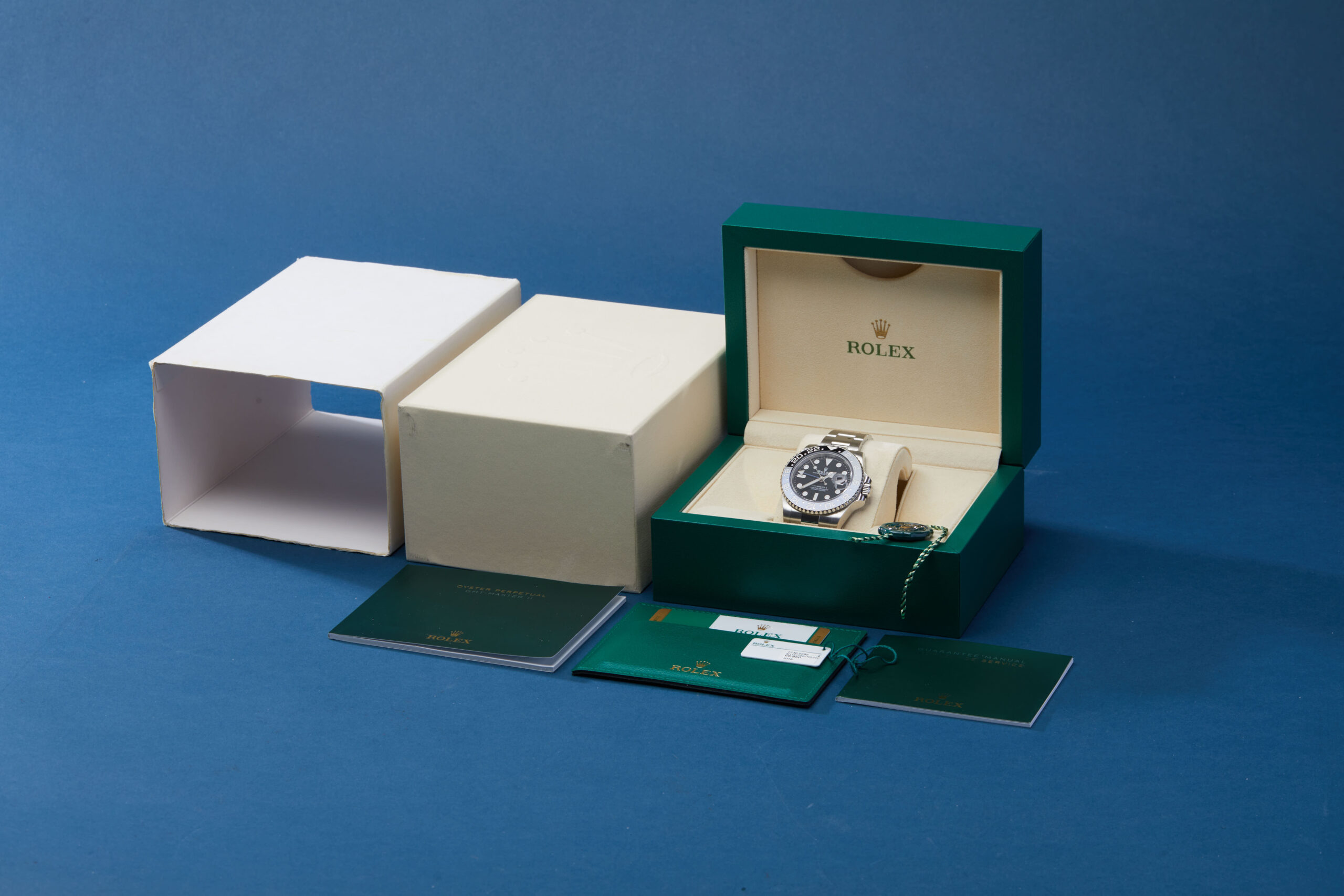 The watch is supplied with its original Rolex box, green leather wallet, green swing tag and warranty card dated Q2 2018.