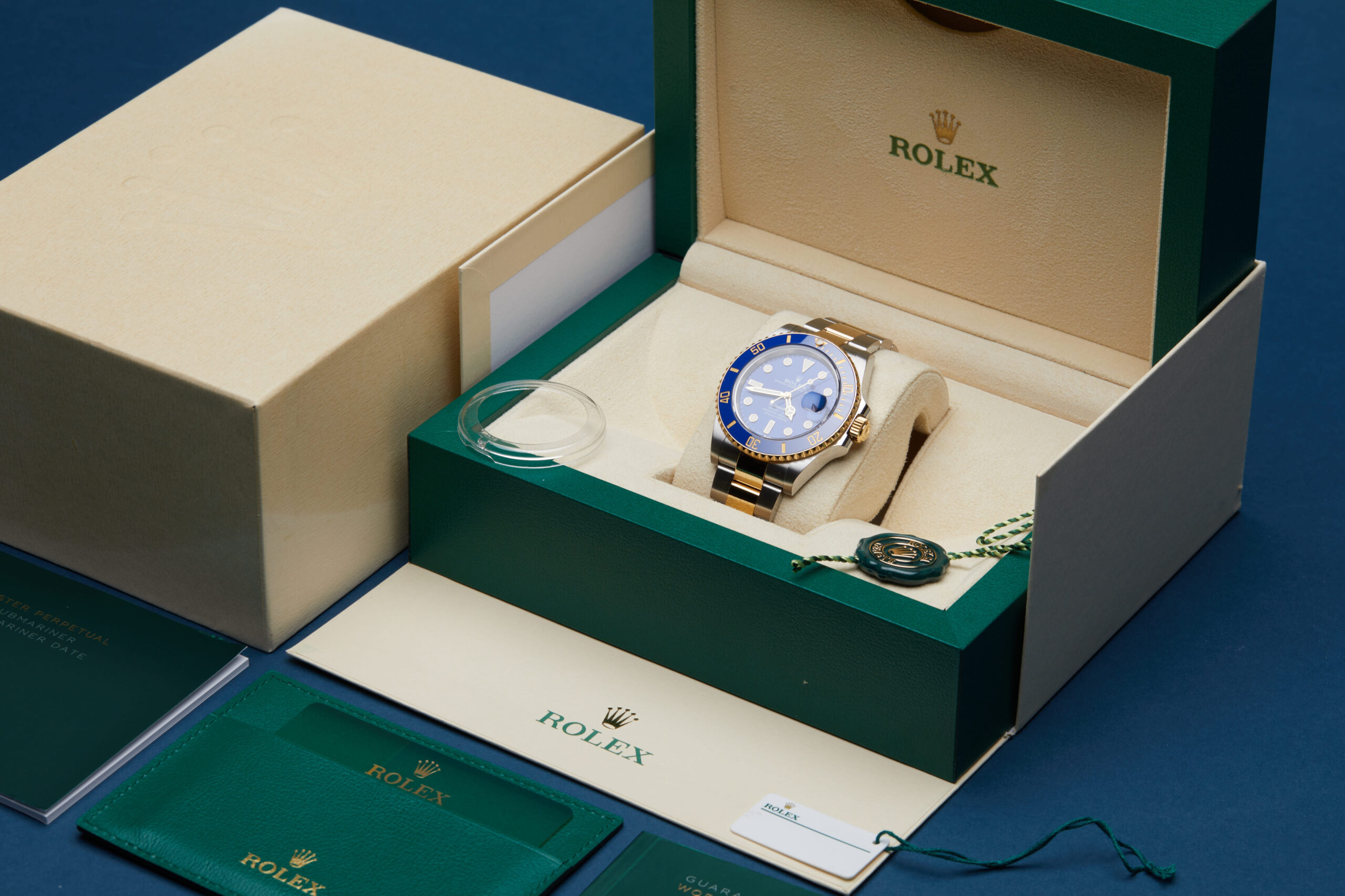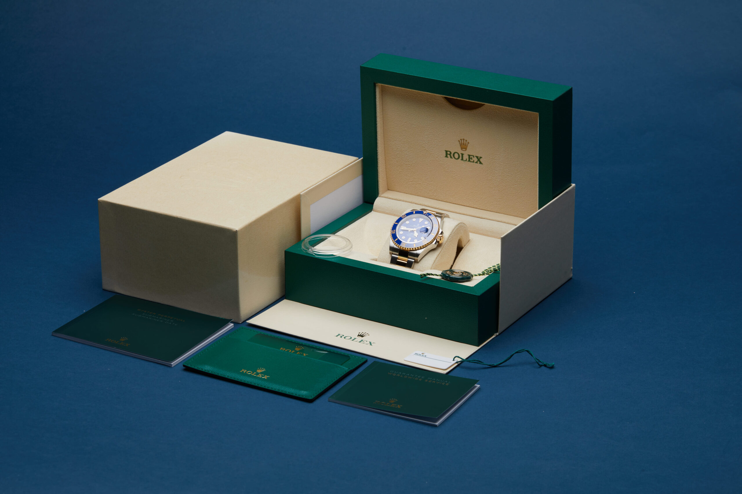 The watch is supplied with its original Rolex box, green leather wallet, manuals, 2x swing tags and warranty card dated Q3 2024.