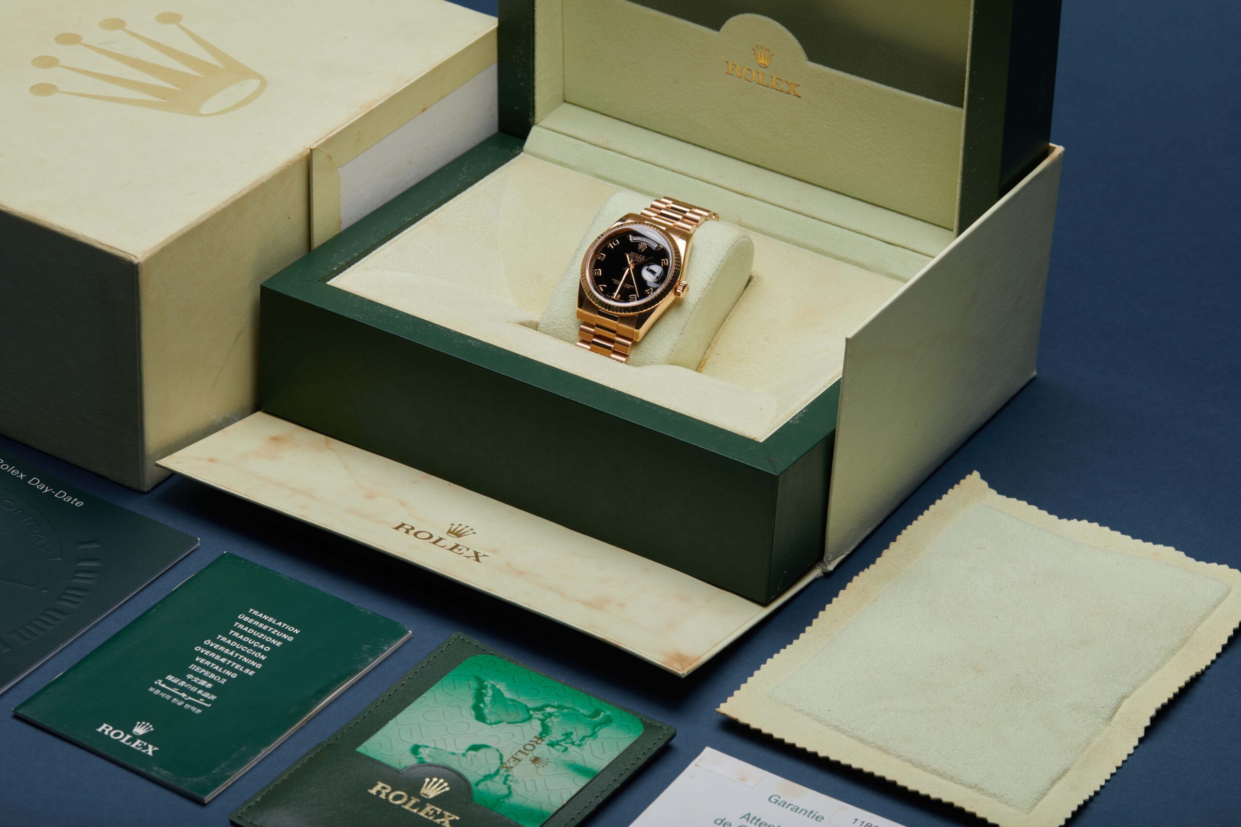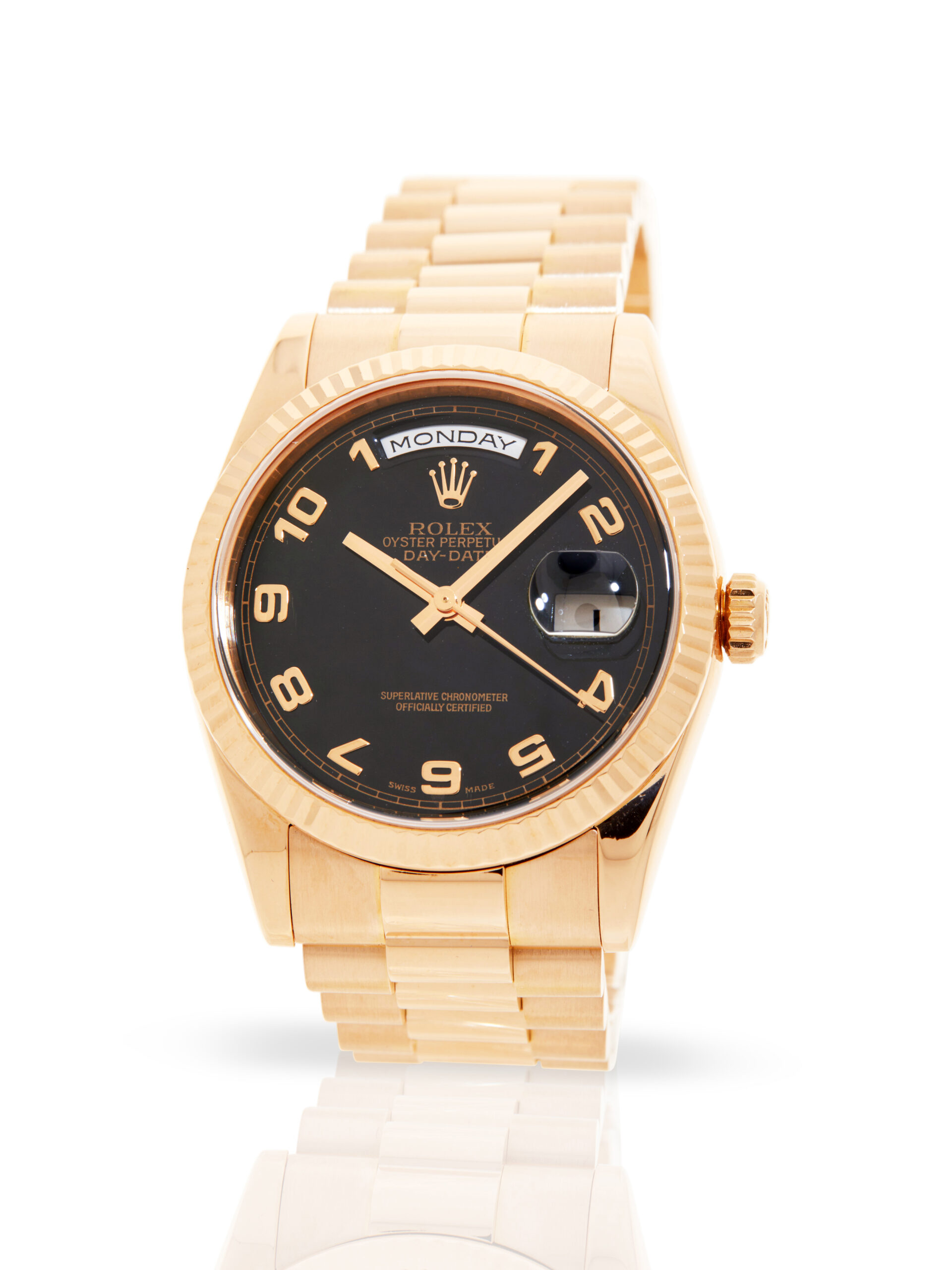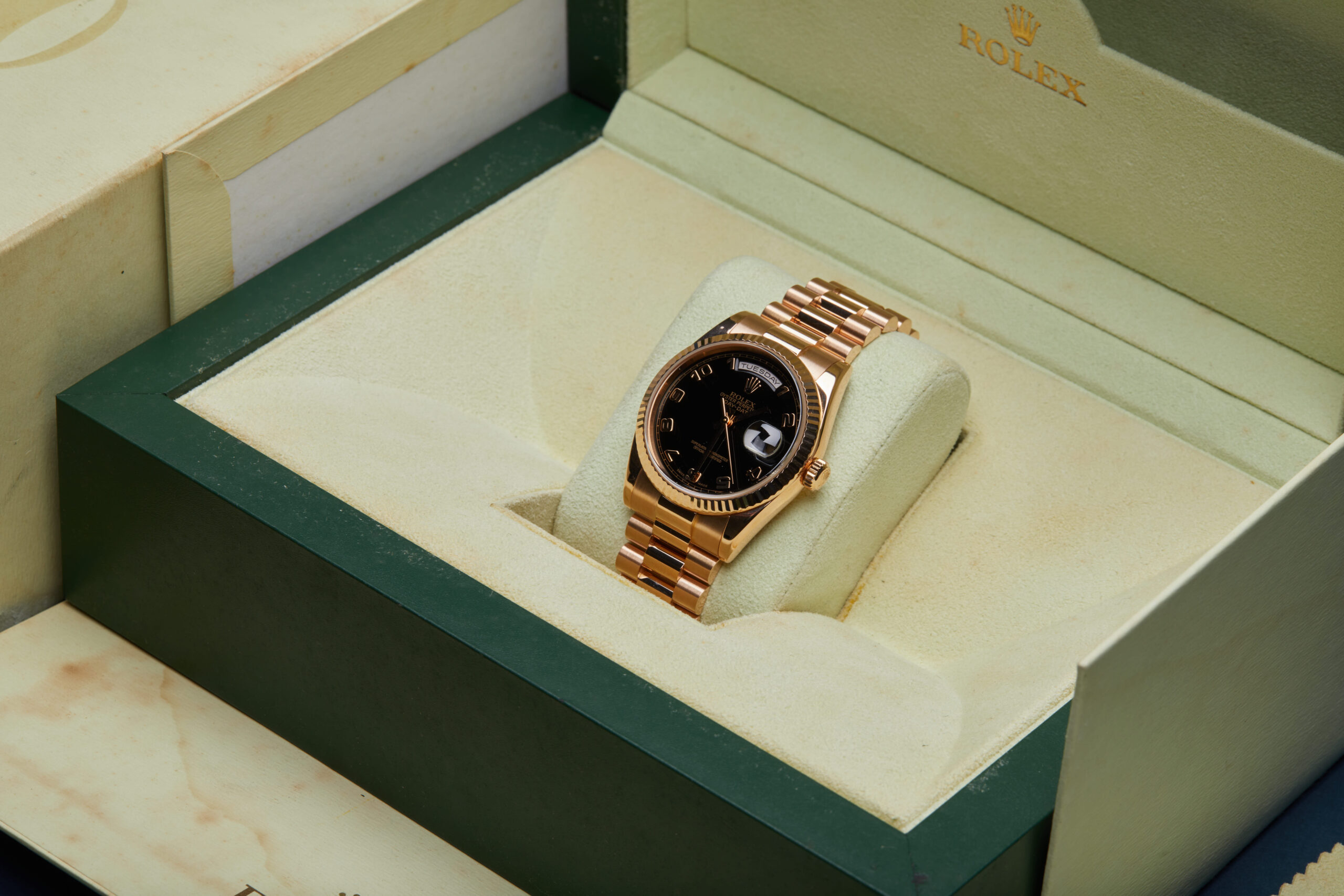 Presented in fantastic condition is this beautiful example of a 2006 Rolex Day-Date 36 118235. The watch features a 36mm 18K rose gold case, black dial with Arabic numerals, 18K rose gold fluted bezel and is coupled to an 18K rose gold President bracelet. Having been professionally tested for condition and accuracy, it’s deemed to be running very well and is showing only minor signs of wear.