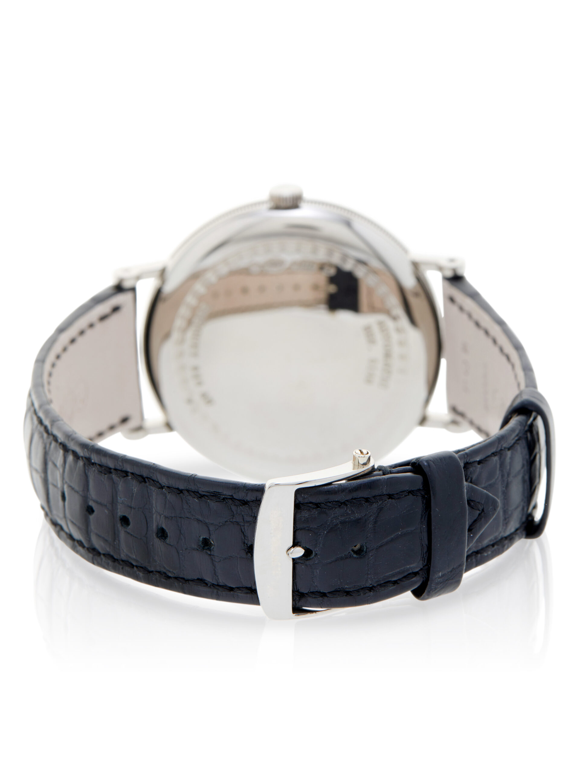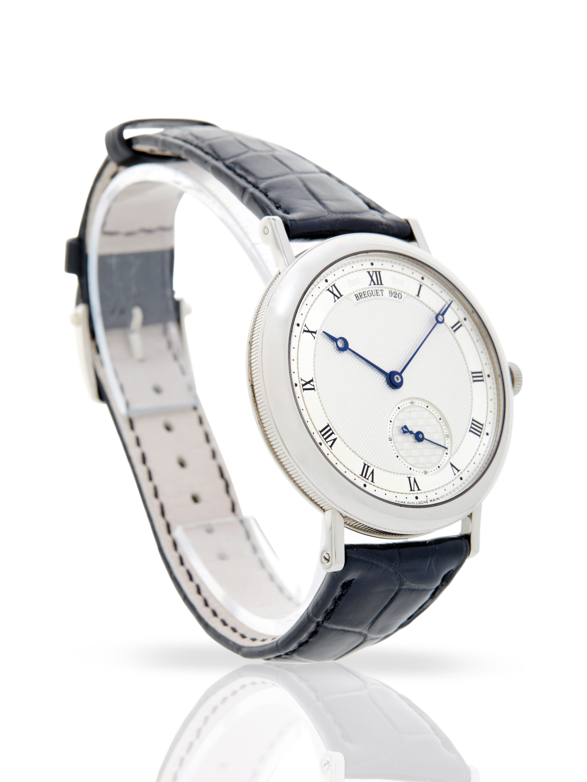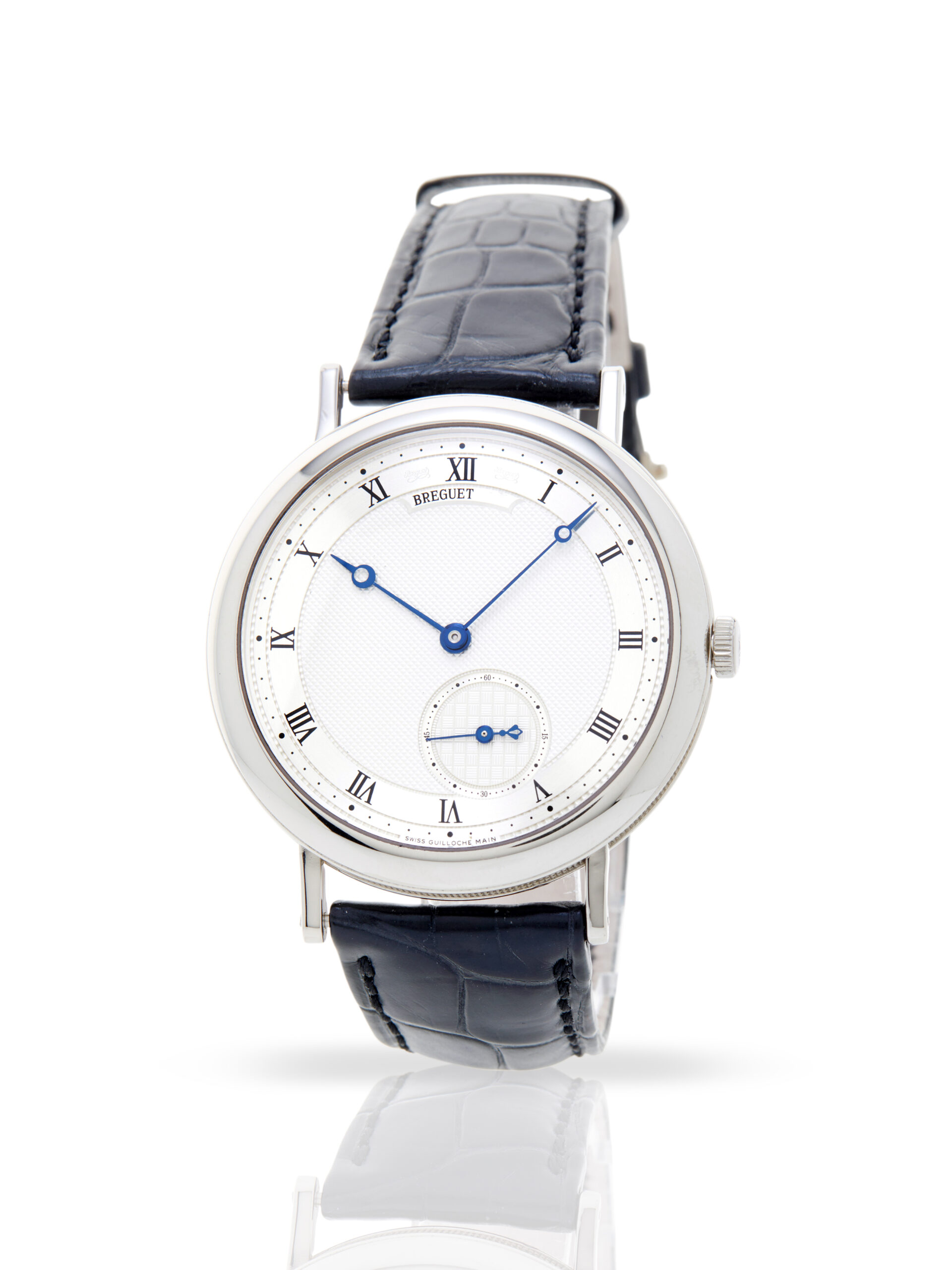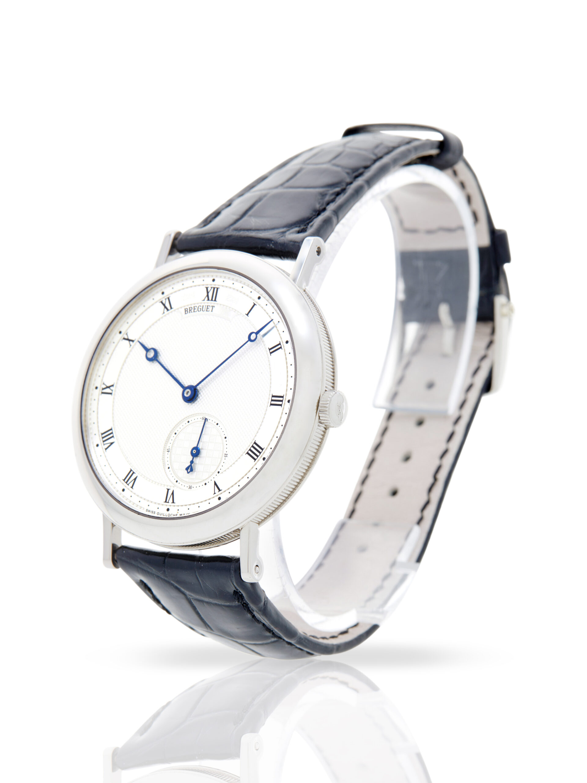 Presented in excellent condition is this elegant example of a Breguet Classique 5140BB/12/9W6. The watch features a 40mm 18K white gold, silver dial with small seconds, black Arabic numerals, smooth 18K white gold bezel and is coupled to an alligator strap with an 18K white gold pin buckle. Having been professionally tested for condition and accuracy, it’s deemed to be running very well and is showing only limited signs of wear.