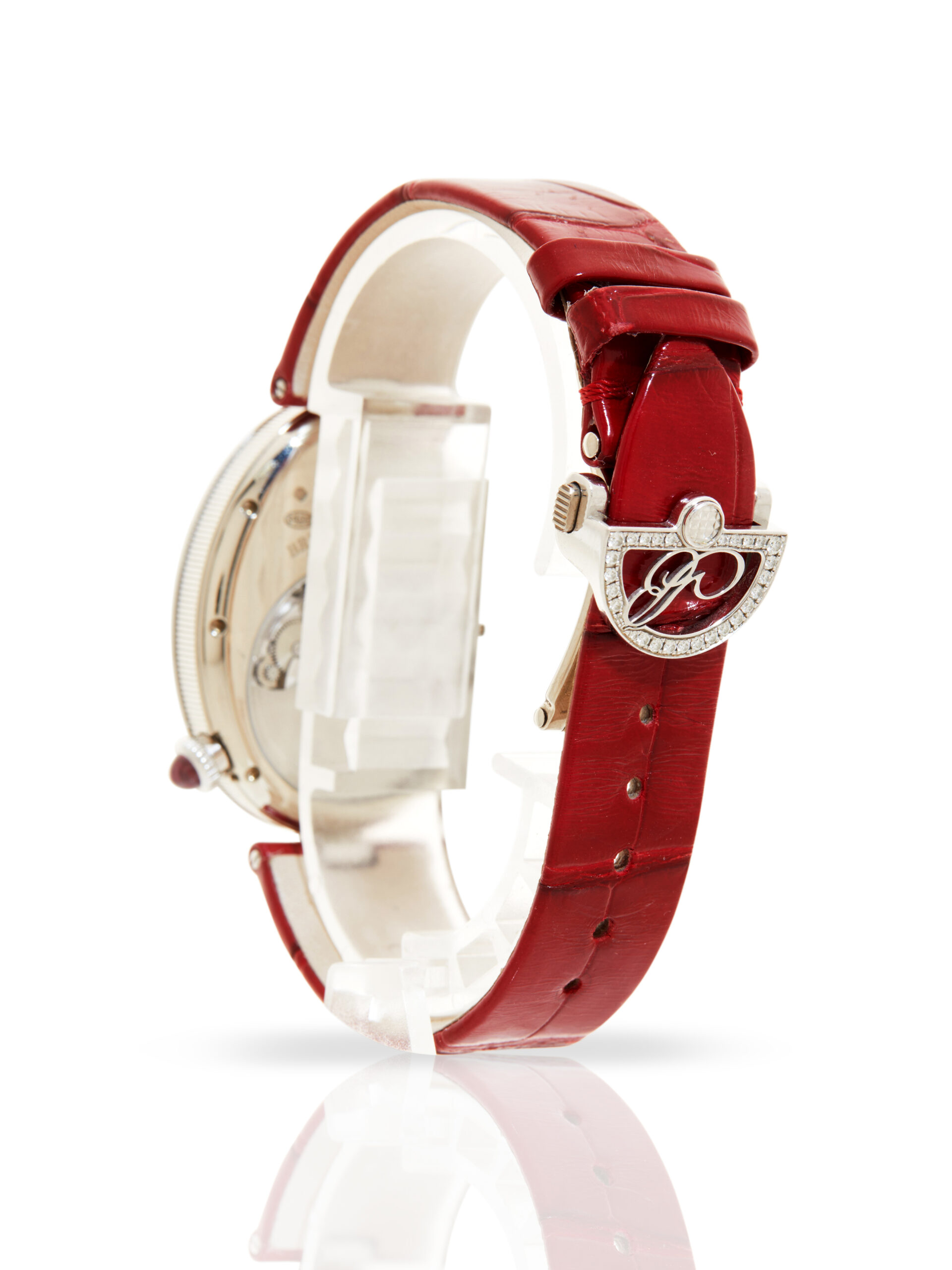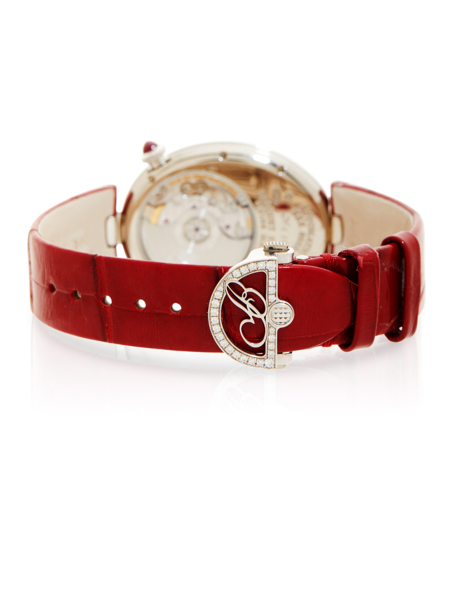 Presented in fantastic condition is this lovely example of a 2022 Breguet Reine de Naples Phase de Lune 8905BB/52/964. The watch features a 28mm 18K white gold case, diamond set 18K white gold bezel, mother-of-pearl dial with off-centred 12-hour time display, small seconds, power reserve, moon phases and is coupled to a red alligator strap with a diamond set 18K white gold folding clasp. Having been professionally tested for condition and accuracy, it’s deemed to be running very well and is showing only very limited signs of wear.