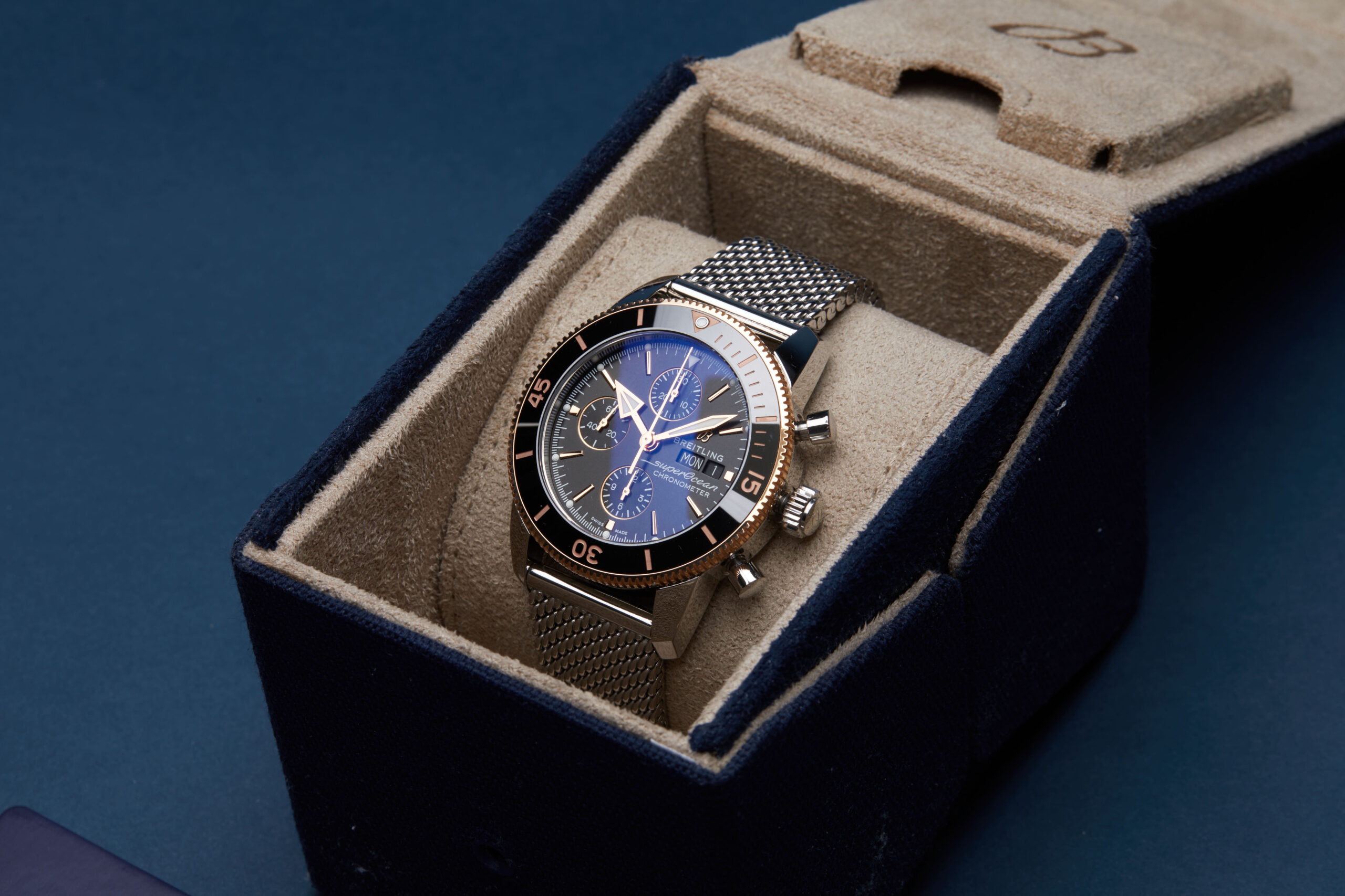 Presented in excellent condition is this outstanding example of a 2023 Breitling Superocean Heritage II U13313121B1A1. The watch features a 44mm stainless steel case, 18K rose gold bezel with black ceramic insert, black chronograph dial with day/date functions, rose gold hour markers and is coupled to a stainless steel mesh bracelet with a folding clasp. Having been professionally tested for condition and accuracy, it’s deemed to be running perfectly and is showing only very limited signs of wear.