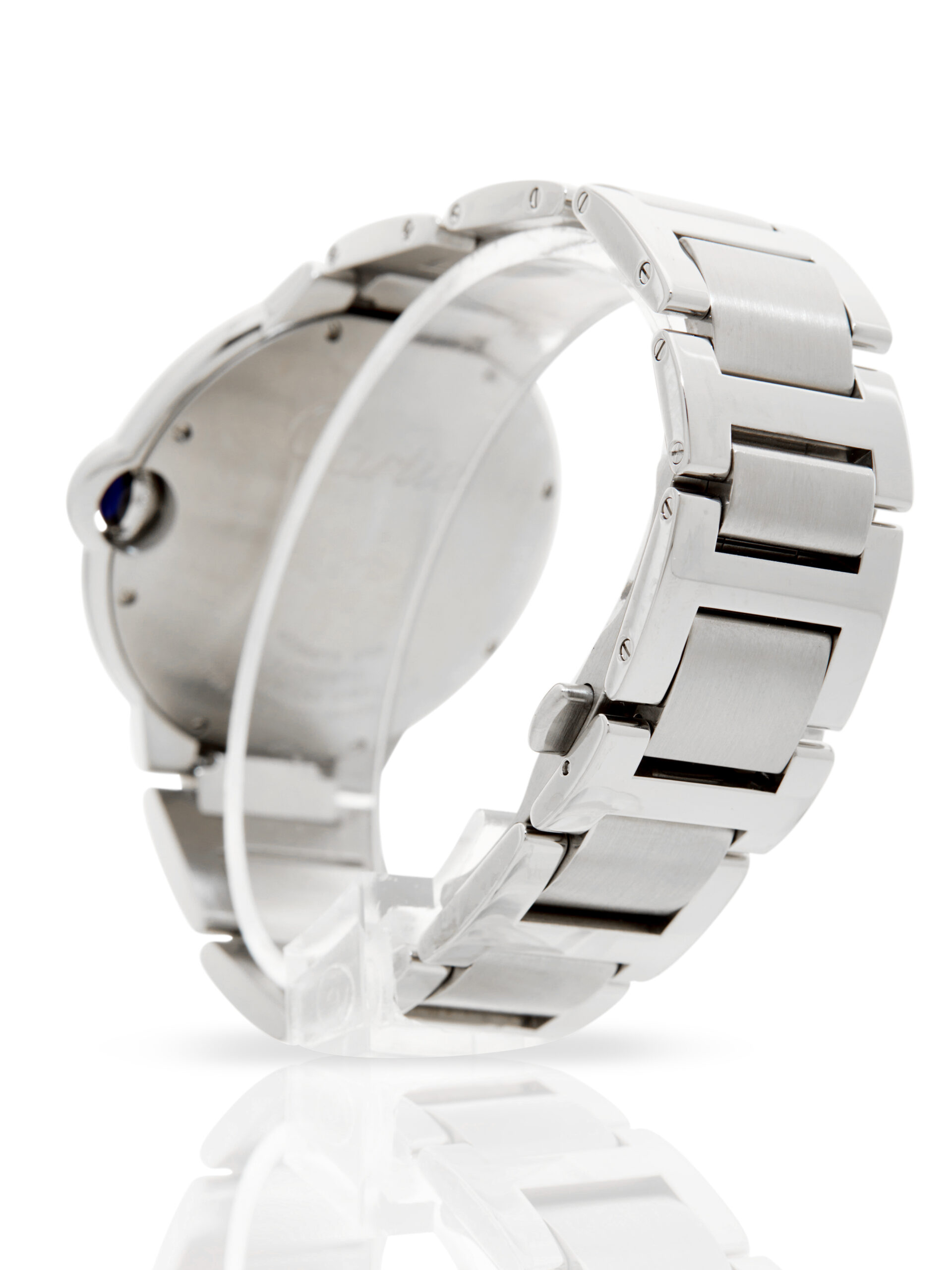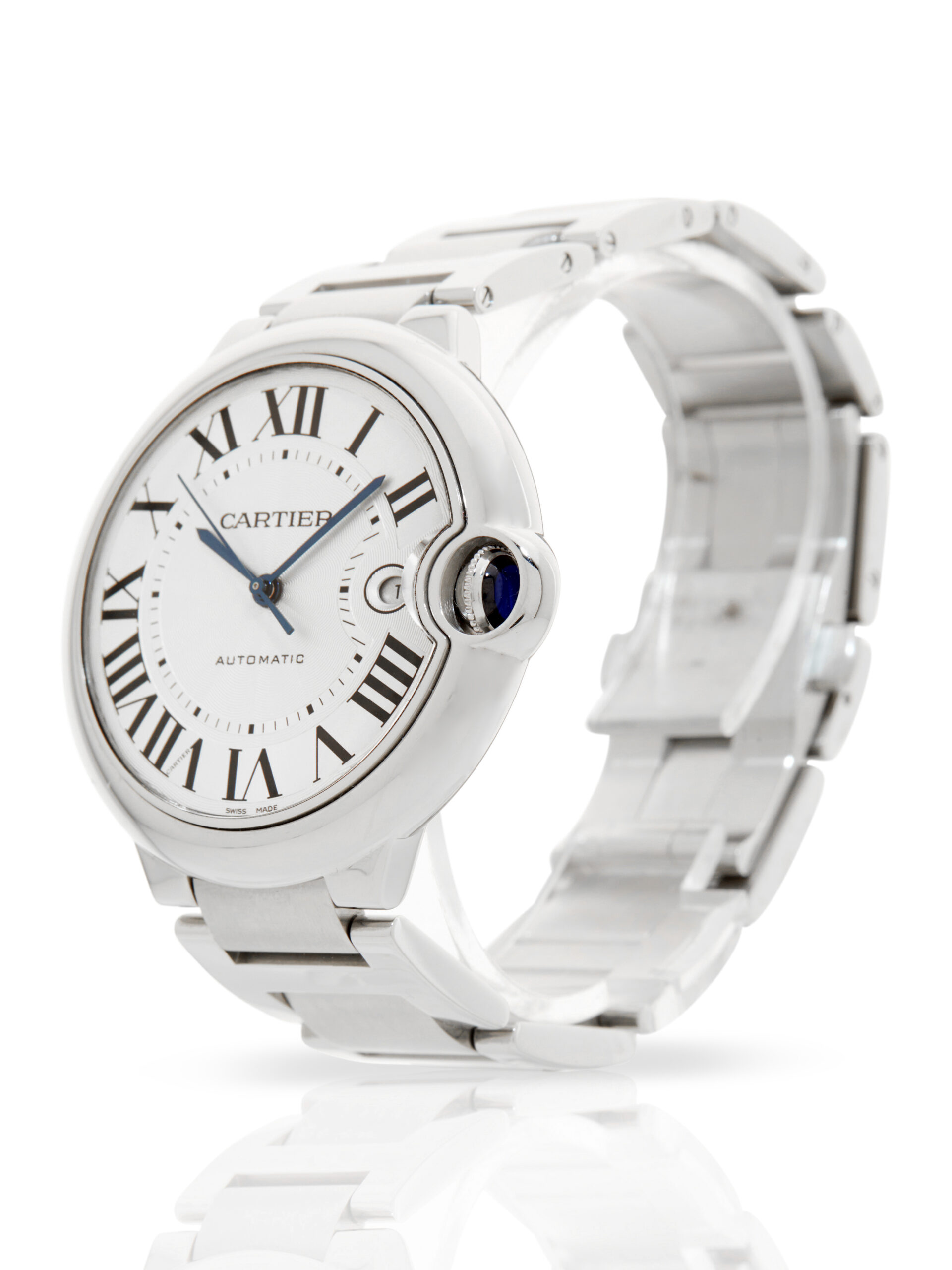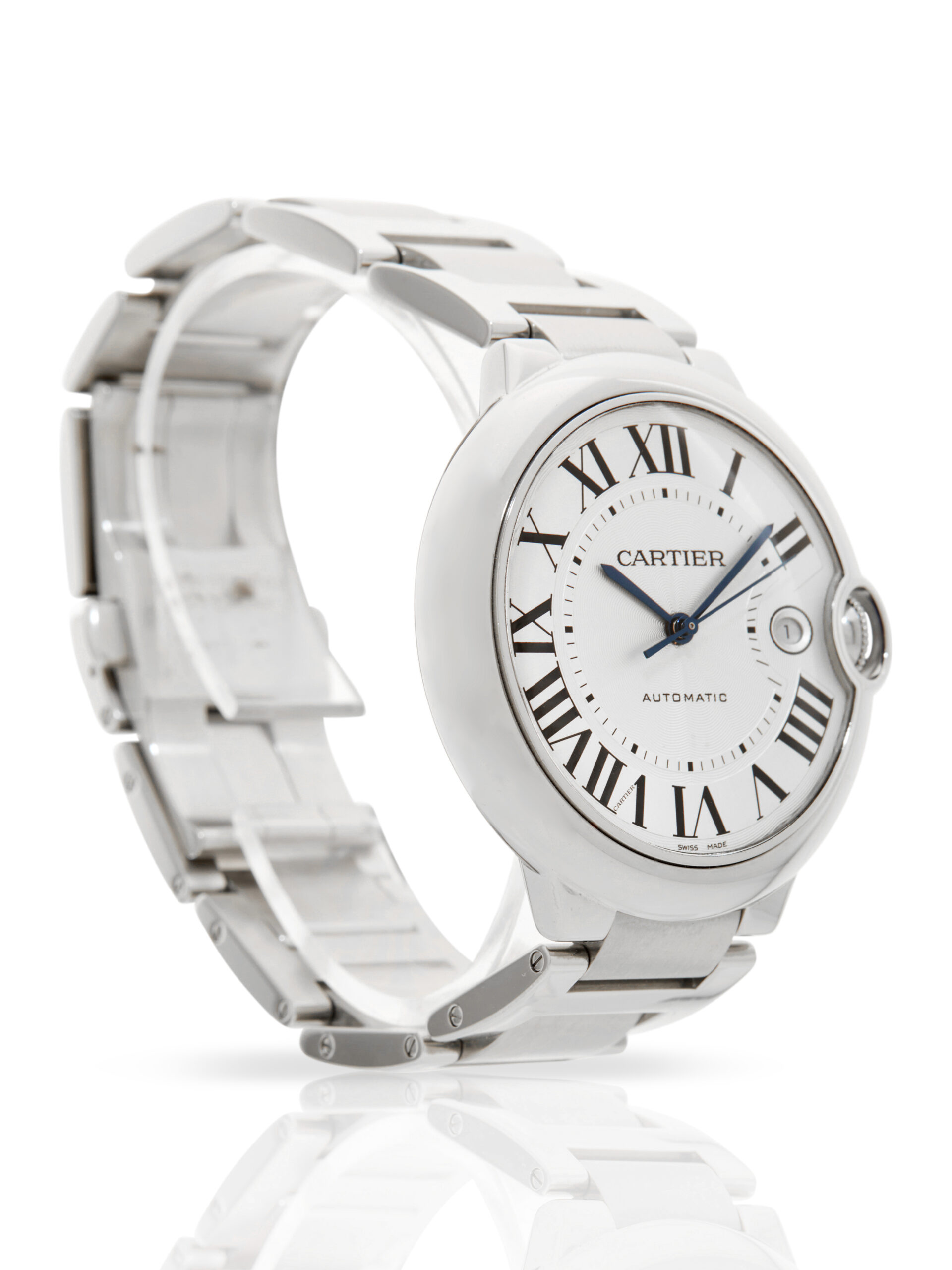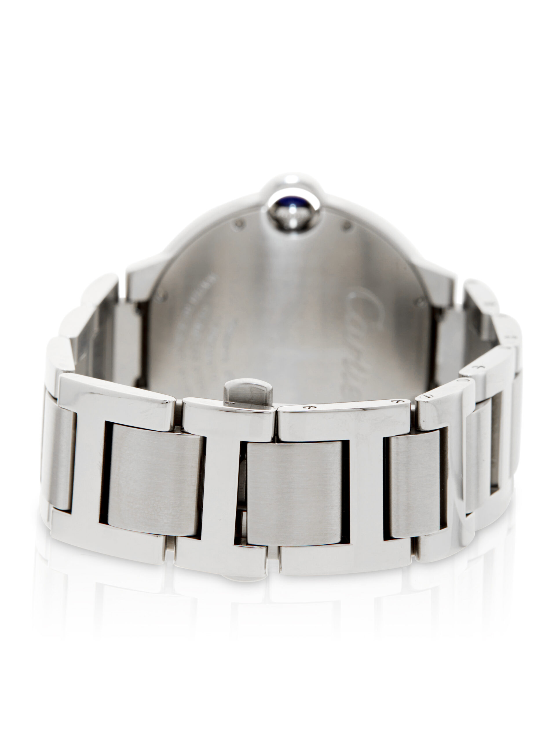 Presented in excellent condition is this stunning example of a 42mm Cartier Ballon Bleu W69012Z4. The watch features a 42mm stainless steel case, a white dial with Roman numerals and blued‑steel sword hands, a date display at 3 o’clock, and a smooth stainless steel bezel. It is coupled to a stainless steel bracelet with a hidden folding clasp. Having been professionally tested for condition, it is deemed to be running very well and shows only light signs of wear.