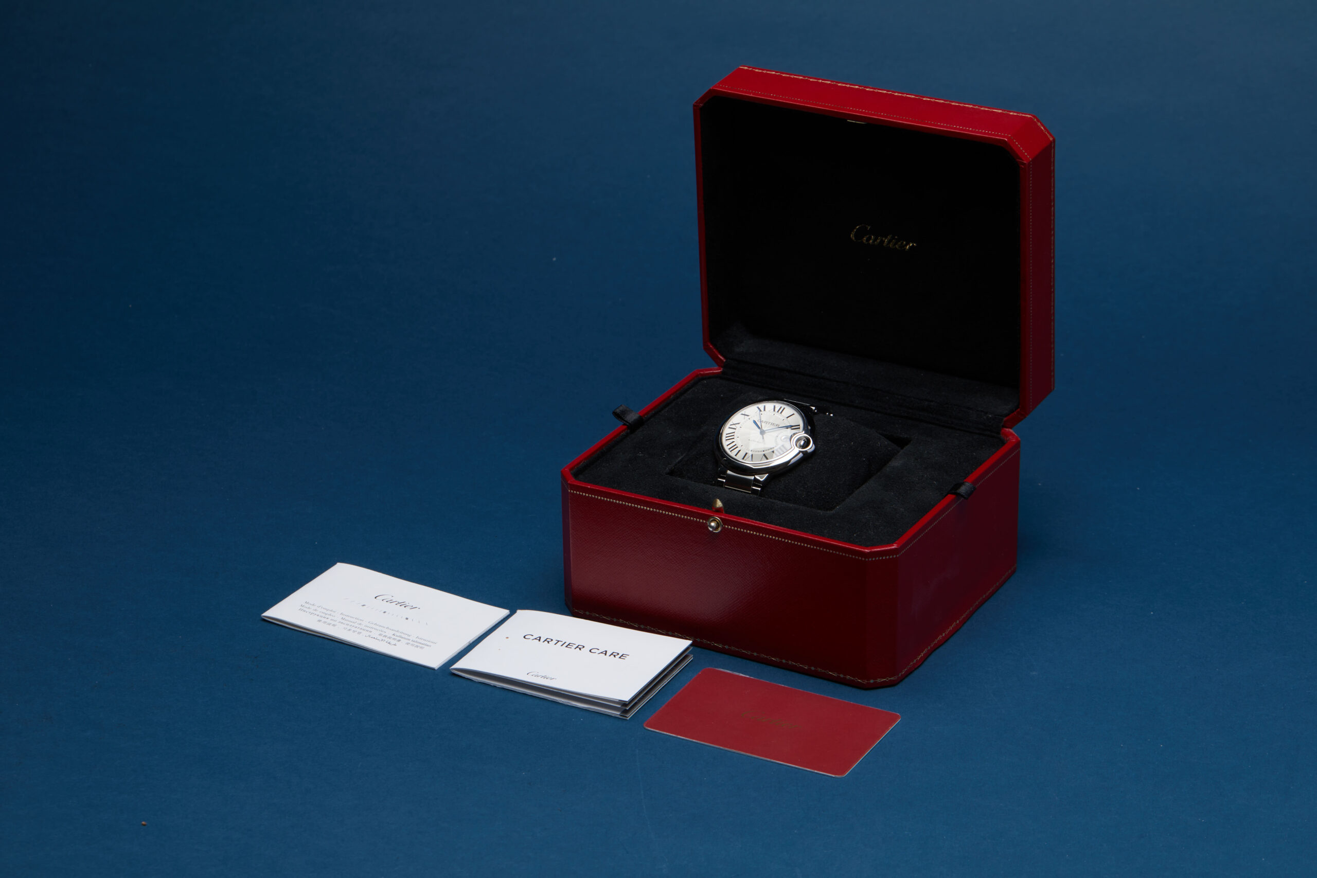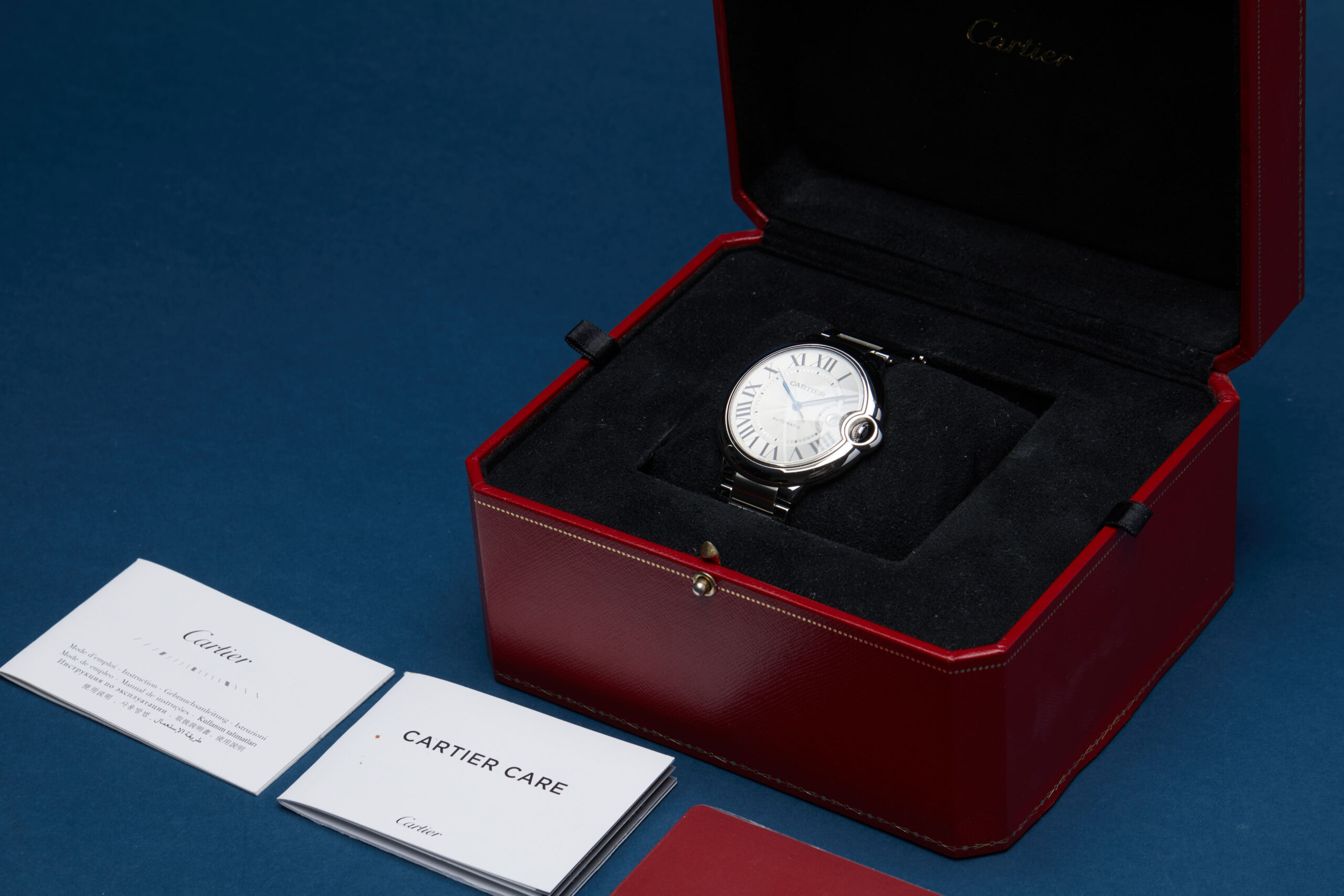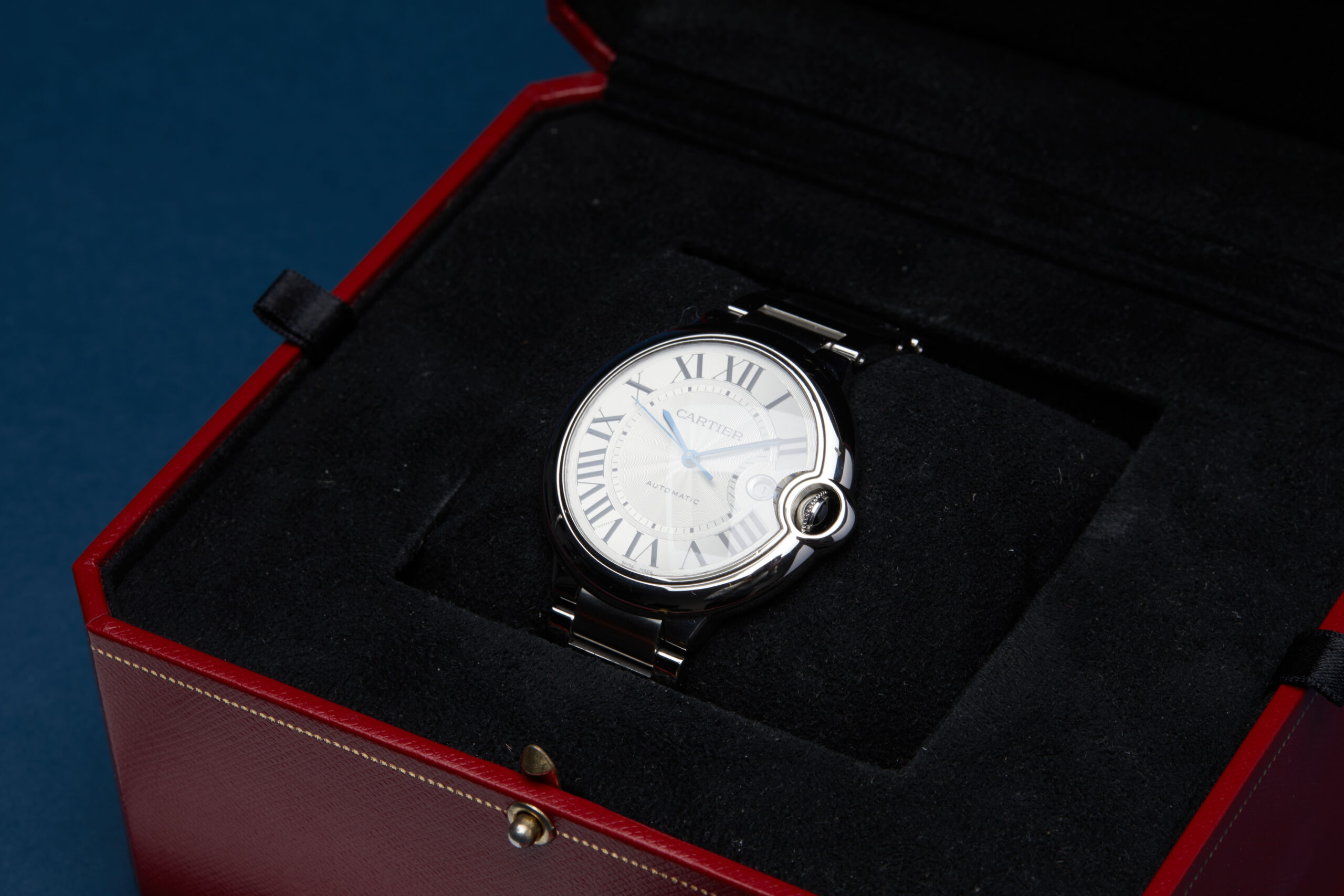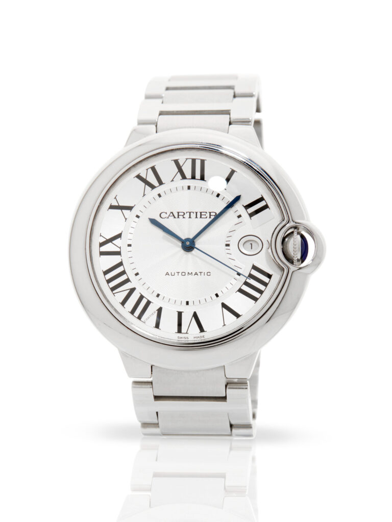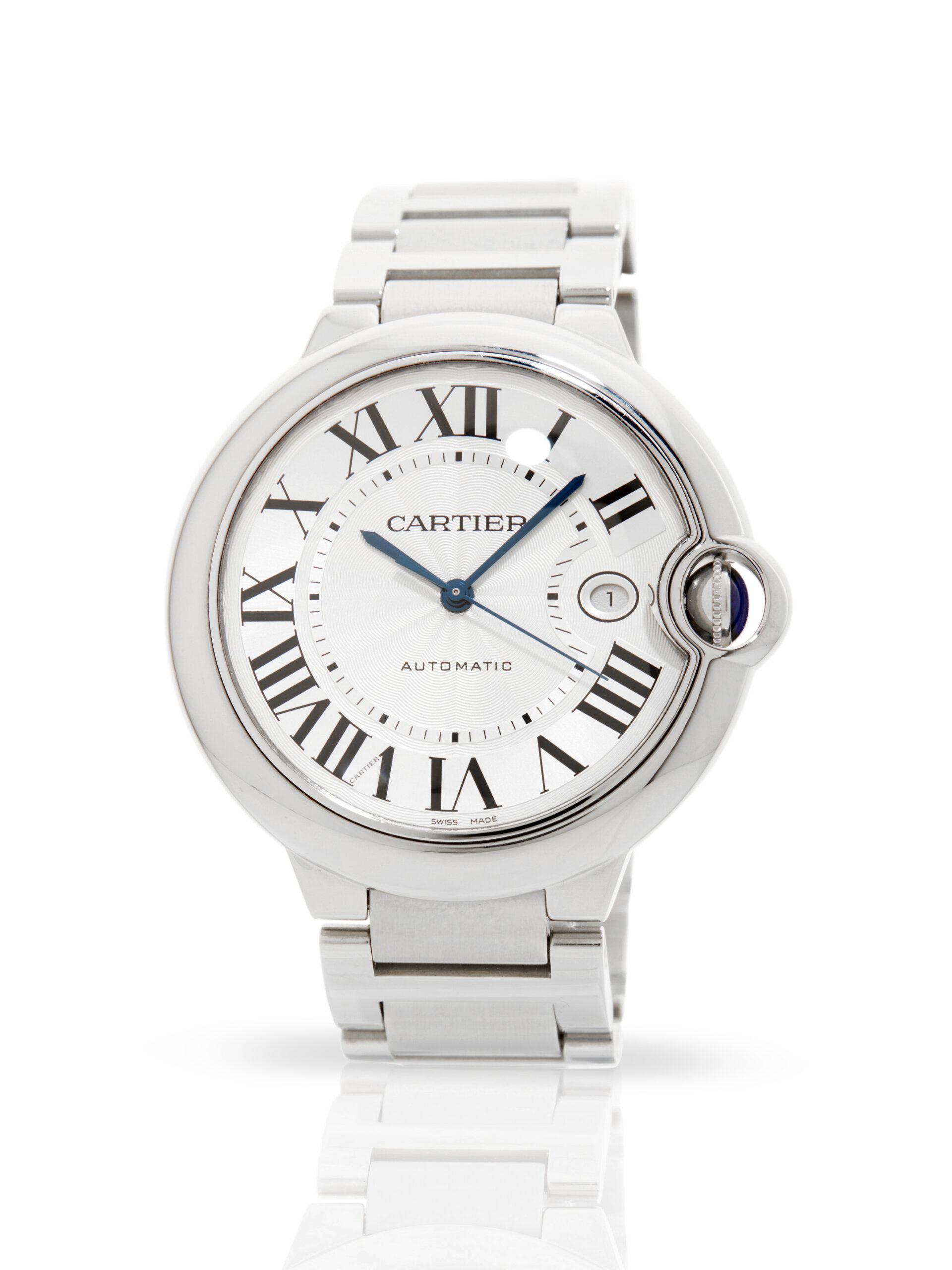 Presented in excellent condition is this stunning example of a 42mm Cartier Ballon Bleu W69012Z4. The watch features a 42mm stainless steel case, a white dial with Roman numerals and blued‑steel sword hands, a date display at 3 o’clock, and a smooth stainless steel bezel. It is coupled to a stainless steel bracelet with a hidden folding clasp. Having been professionally tested for condition, it is deemed to be running very well and shows only light signs of wear.