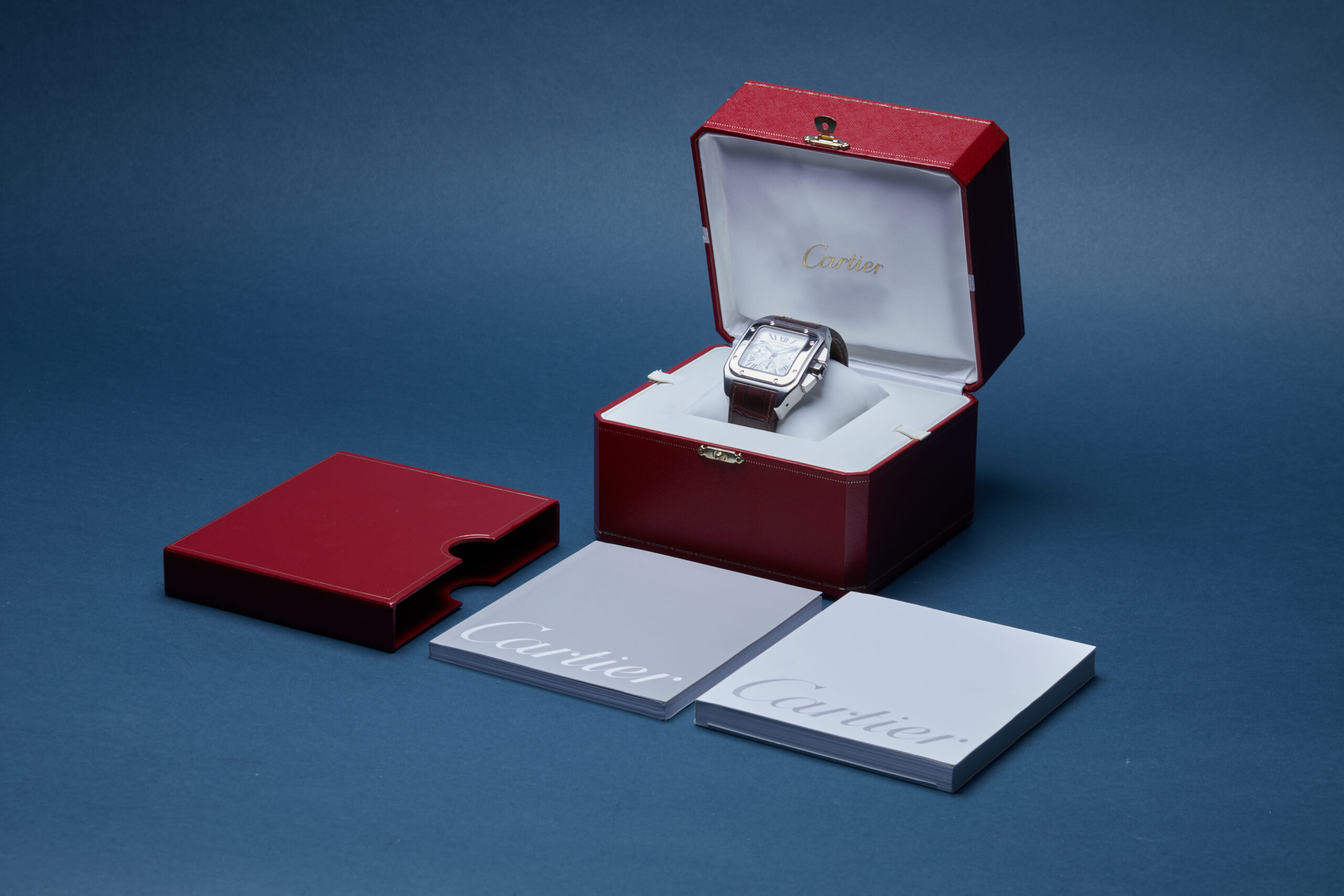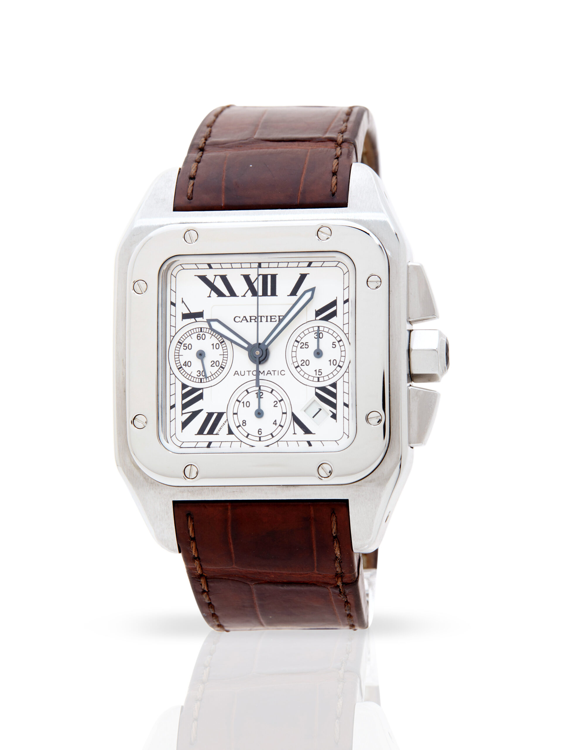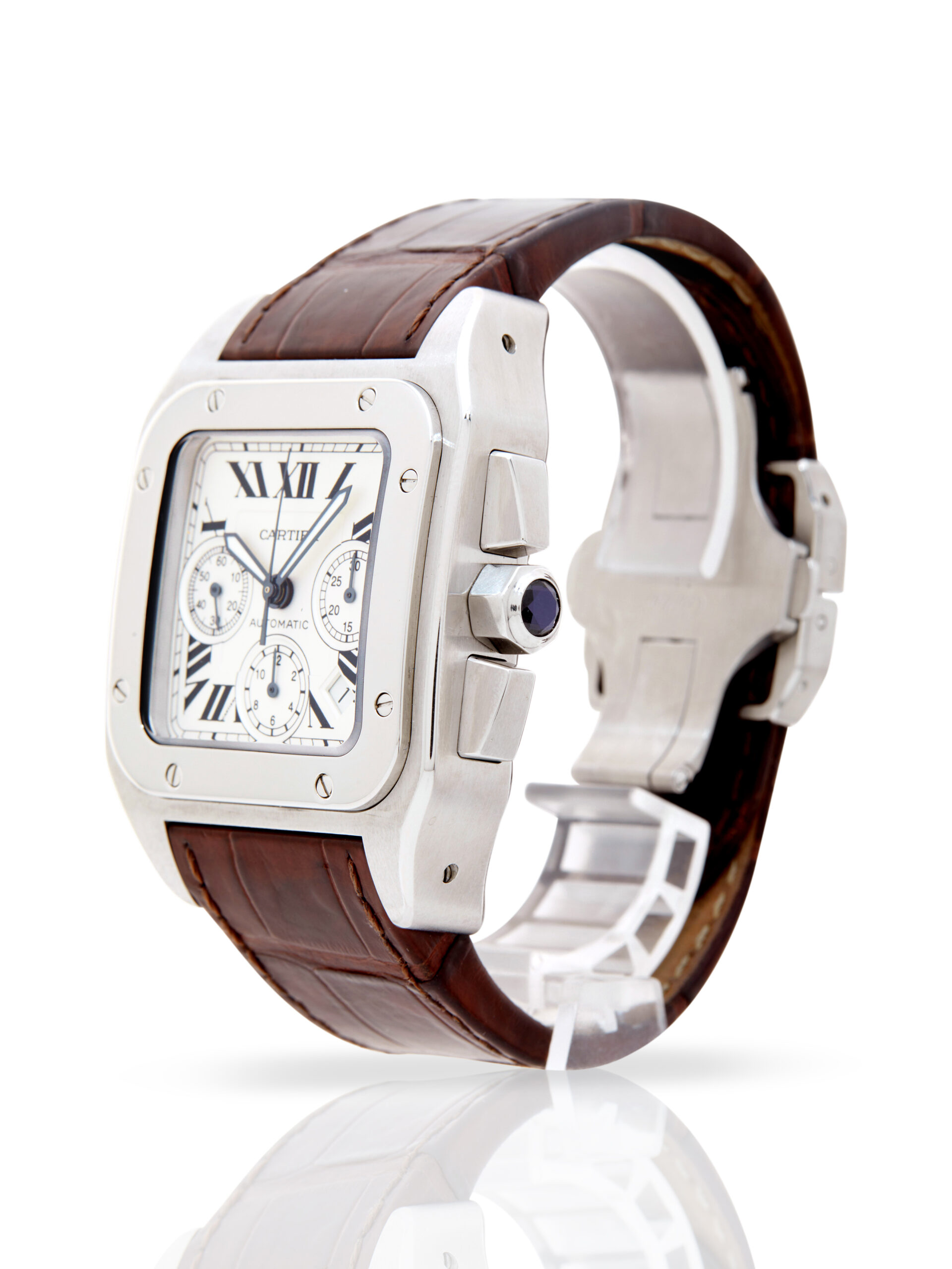 Presented in fantastic condition is this stunning example of a 2006 Cartier Santos 100 XL 2740. The watch features a 41 x 55mm stainless steel case, white chronograph dial with black Roman numerals, date display, mirror polished stainless steel bezel and is coupled to a brown alligator strap with a double folding clasp. Having been professionally tested for condition and accuracy, it’s deemed to be running very well and is showing only minor signs of wear.