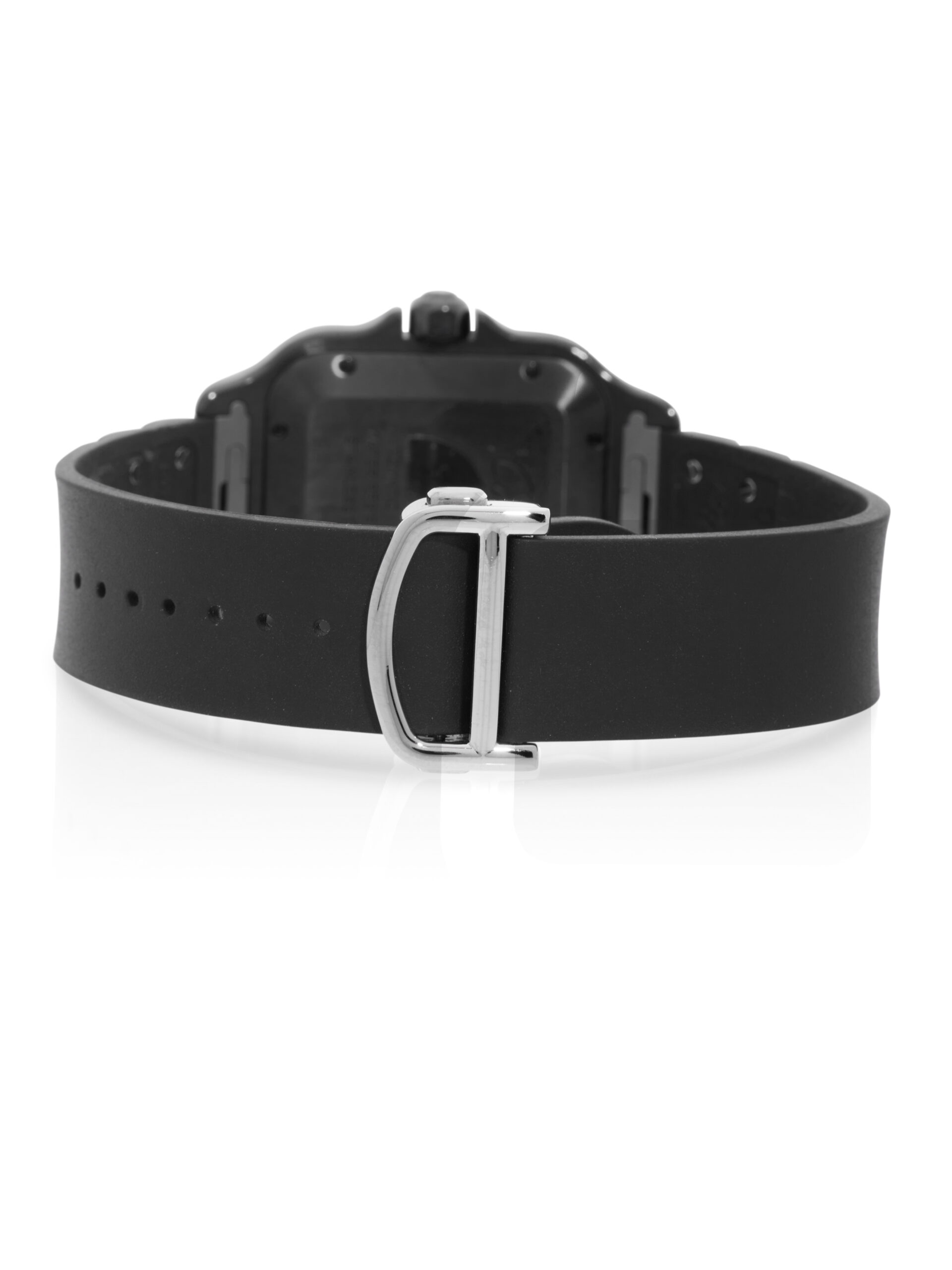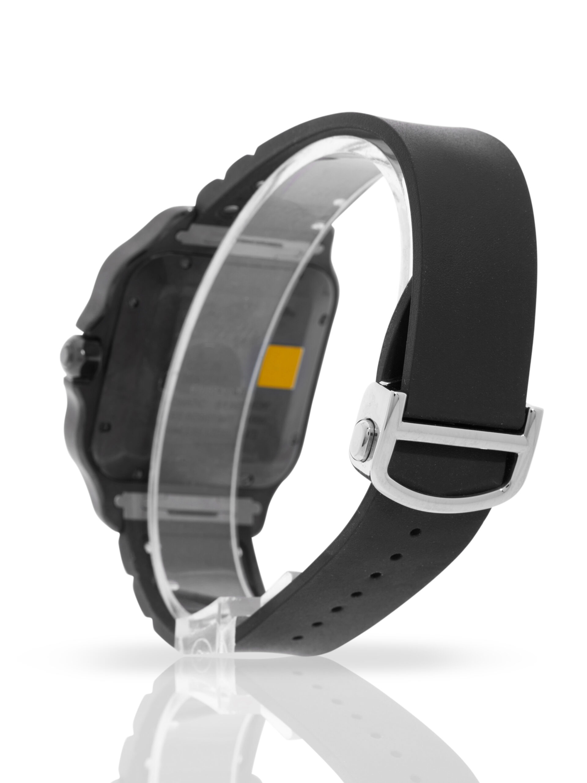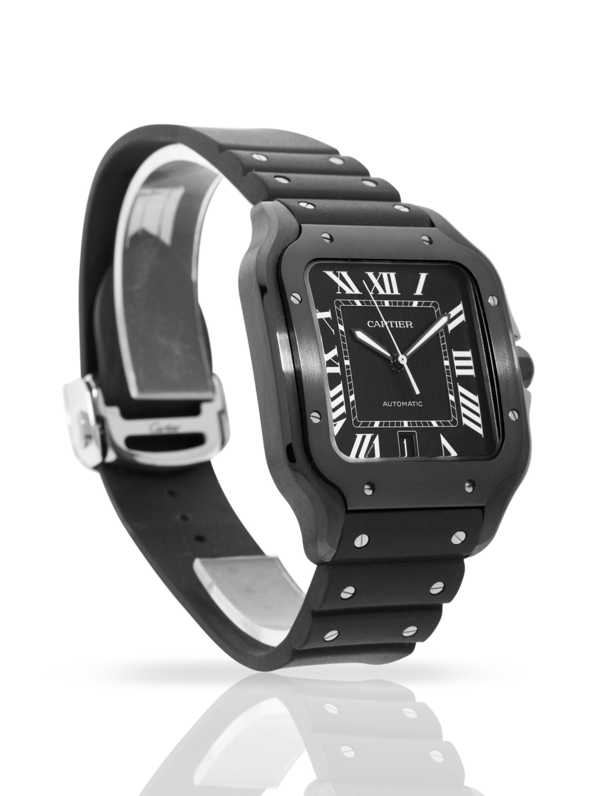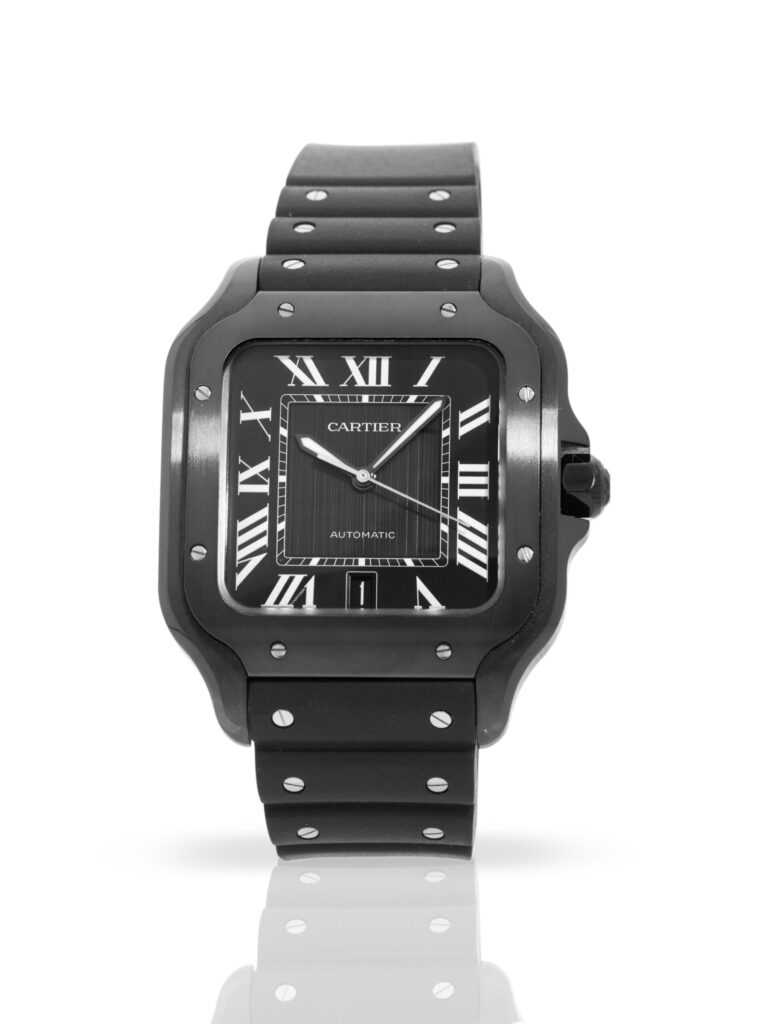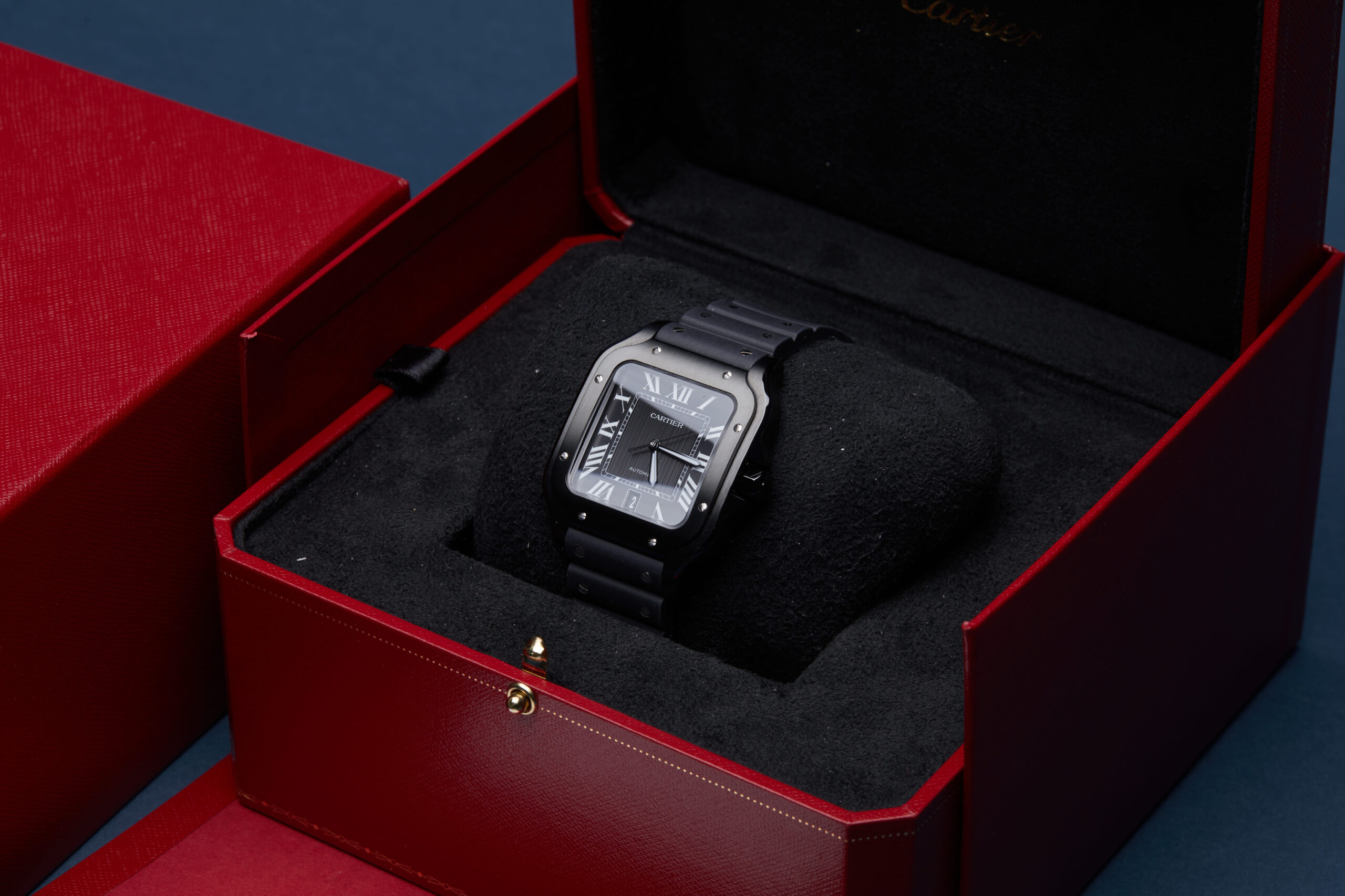 Presented in excellent condition is this stealthy example of a 2024 Cartier Santos de Cartier WSSA0039. The watch features a 40mm black DLC stainless steel case, black dial with white Roman numerals, black DLC stainless steel bezel and is coupled to a black rubber strap with a folding clasp. Having been professionally tested for condition and accuracy, it’s deemed to be running perfectly, ready for its new, lucky owner.