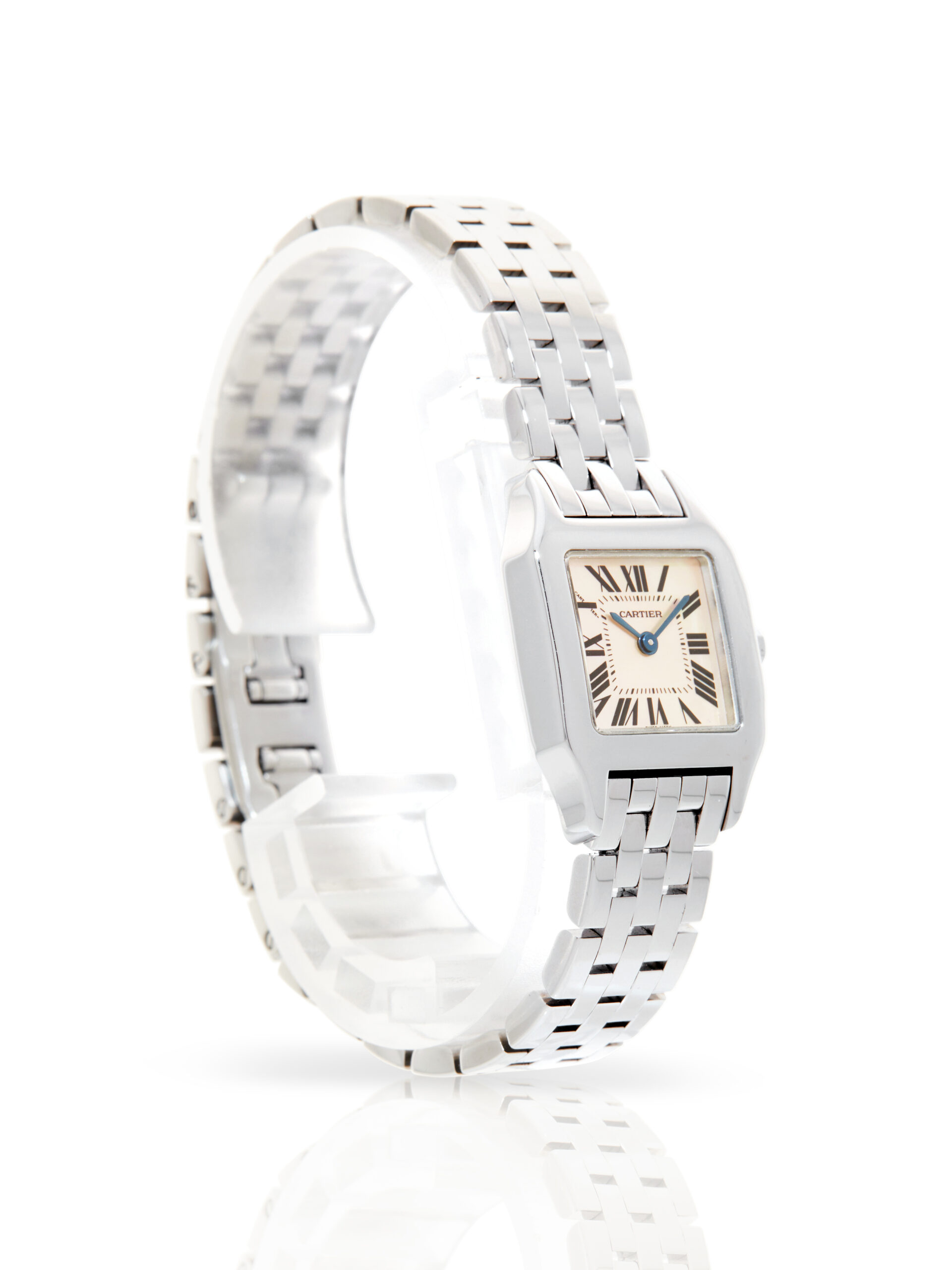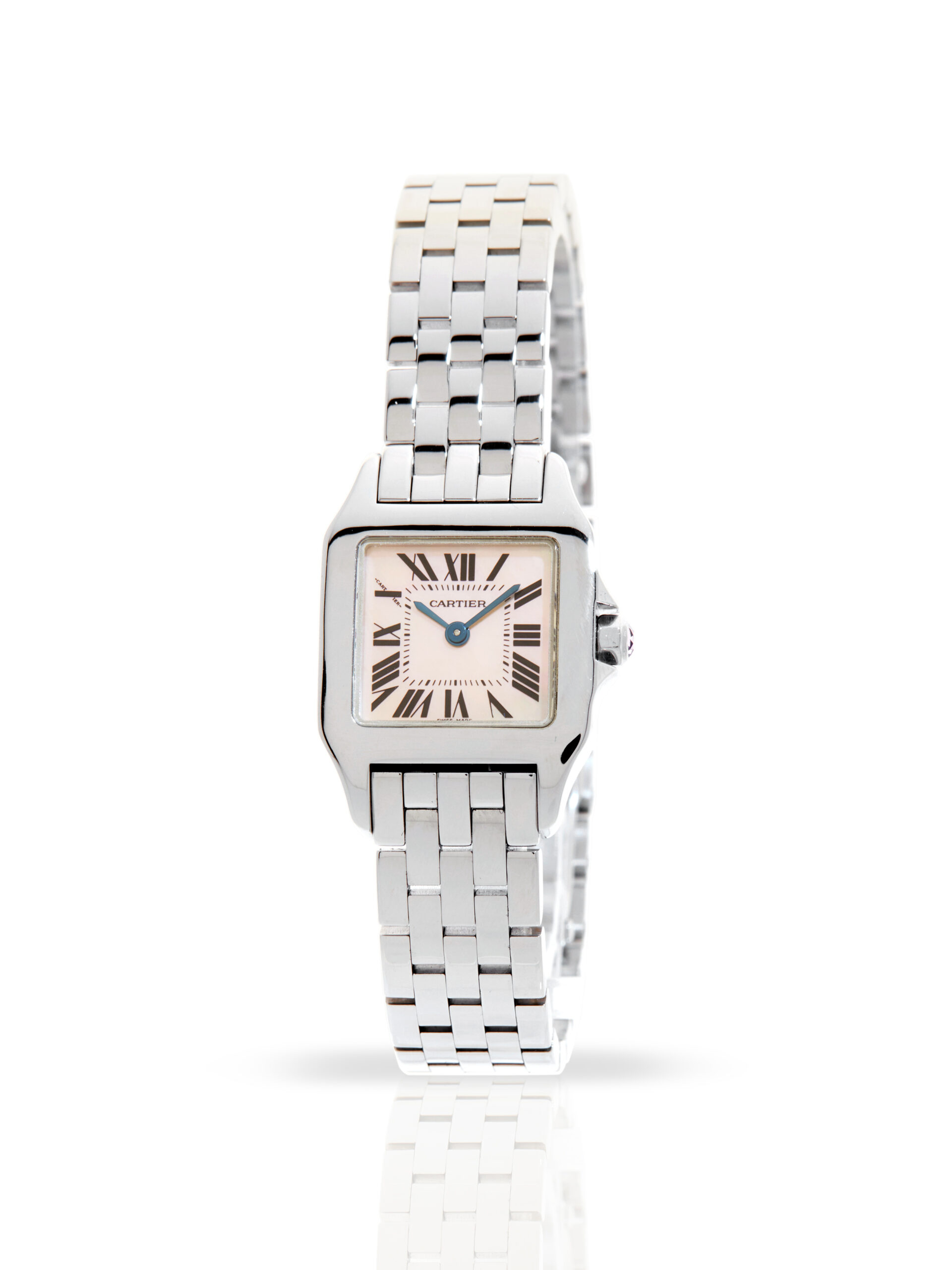 Presented in fantastic condition is this lovely example of a 2005 Cartier Santos Demoiselle W25075Z5. The watch features a 20mm stainless steel case, mother-of-pearl dial with black Roman numerals and is coupled to a stainless steel bracelet with a double folding clasp. Having been professionally tested for condition, it’s deemed to be running very well and is showing only minor signs of wear.
