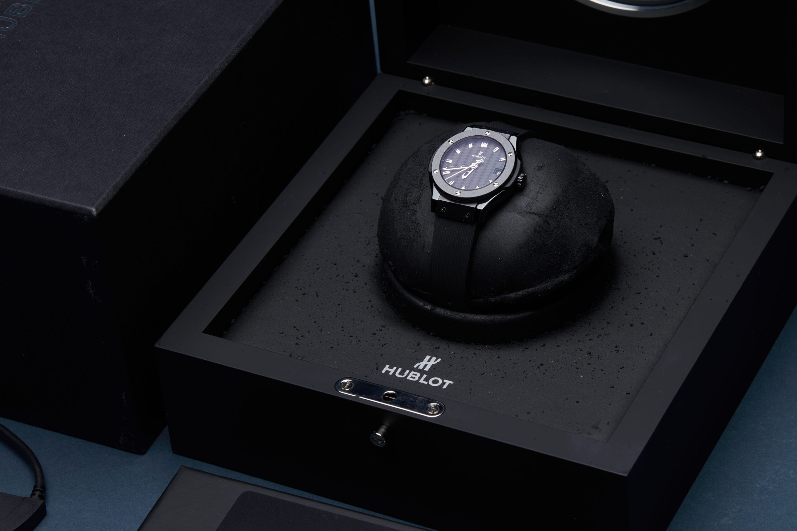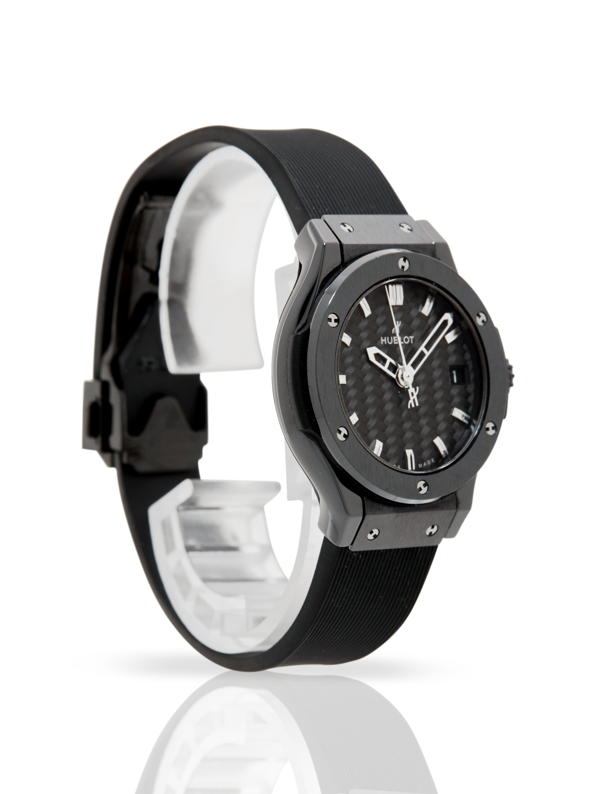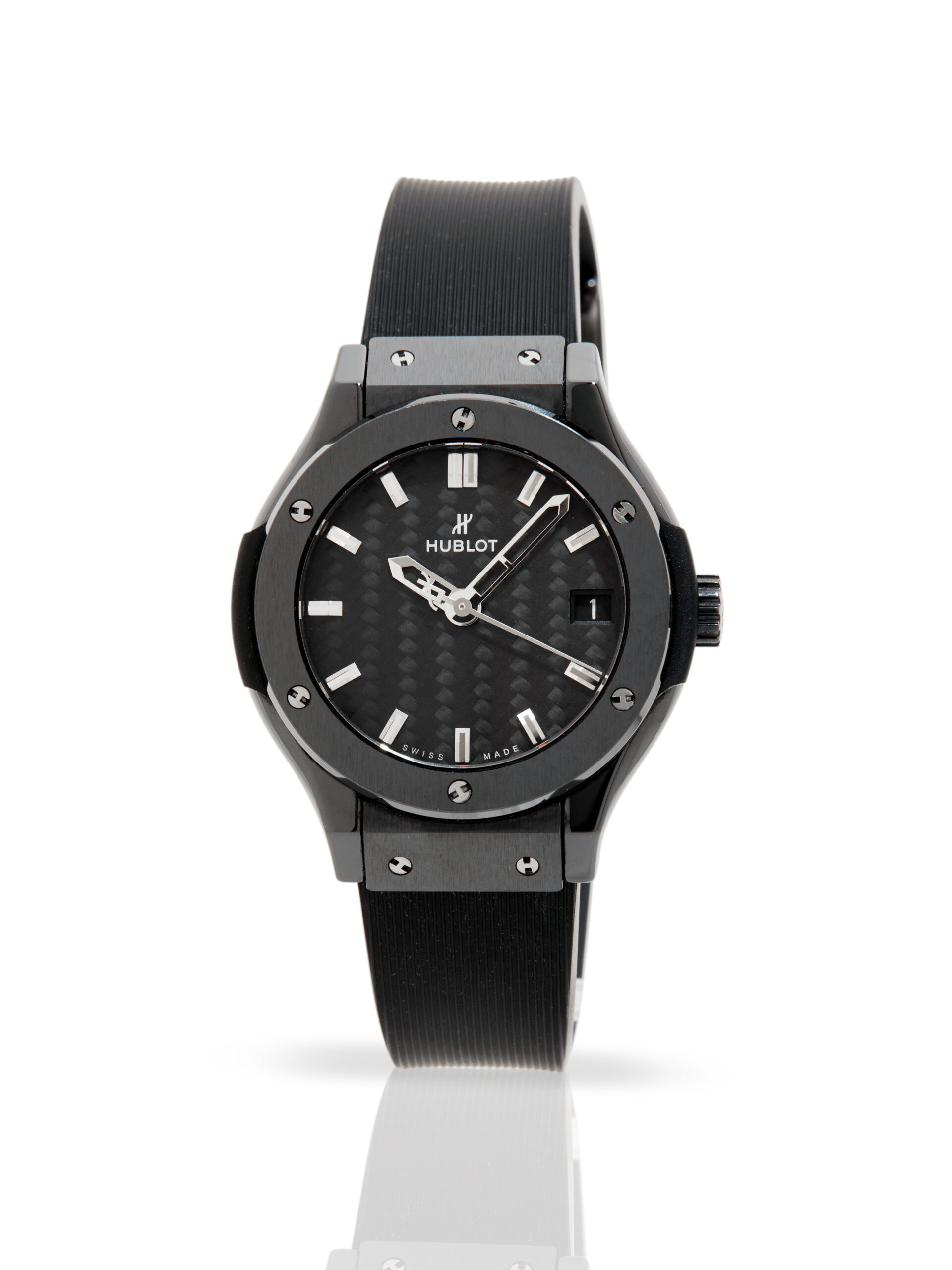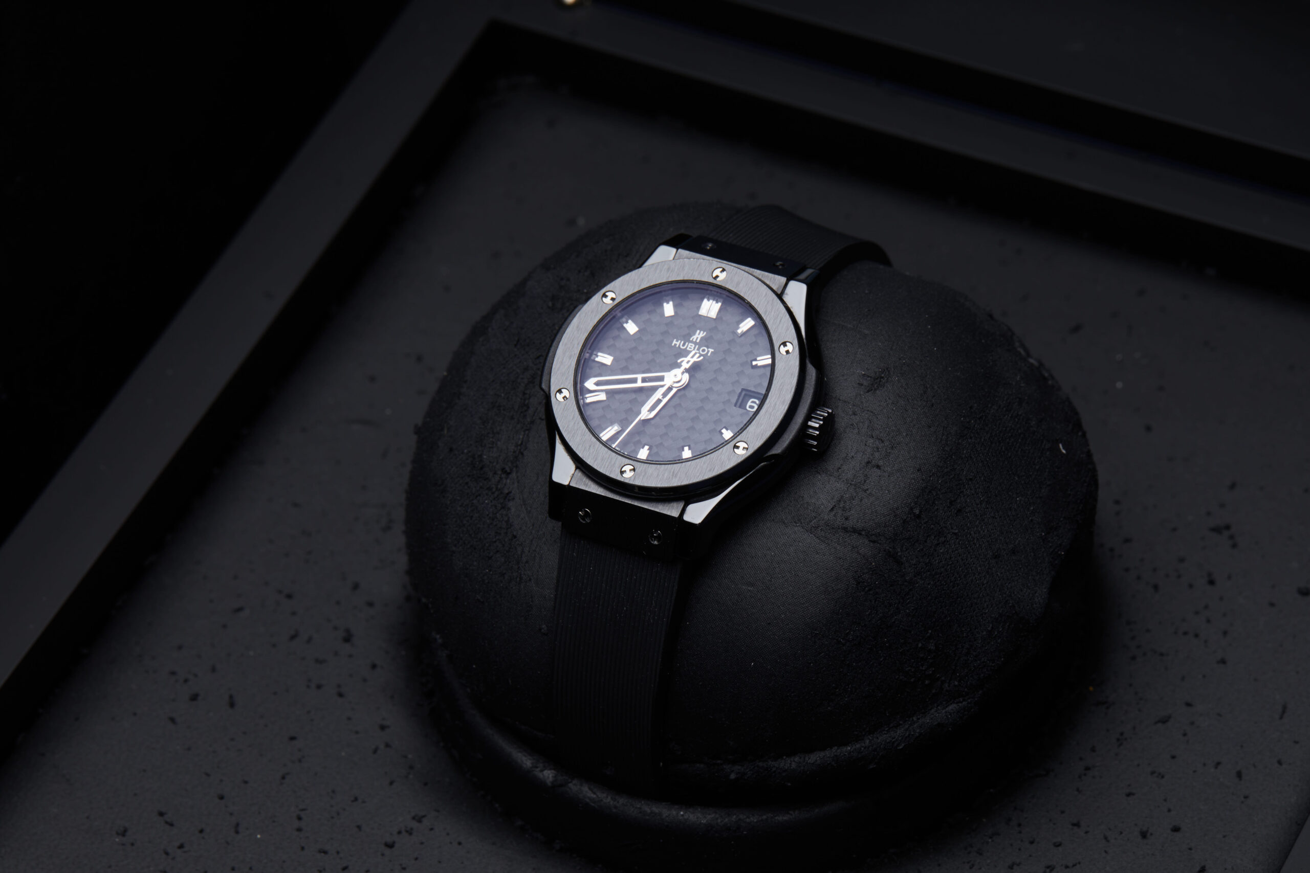Presented in fantastic condition is this lovely example of a 2015 Hublot Classic Fusion 581.CM.1770.RX. The watch features a 33mm black ceramic case, carbon fibre baton dial with a date function, black ceramic bezel and is coupled to a black rubber strap with a folding clasp. Having been professionally tested for condition, it’s deemed to be running very well and is showing only minor signs of wear.