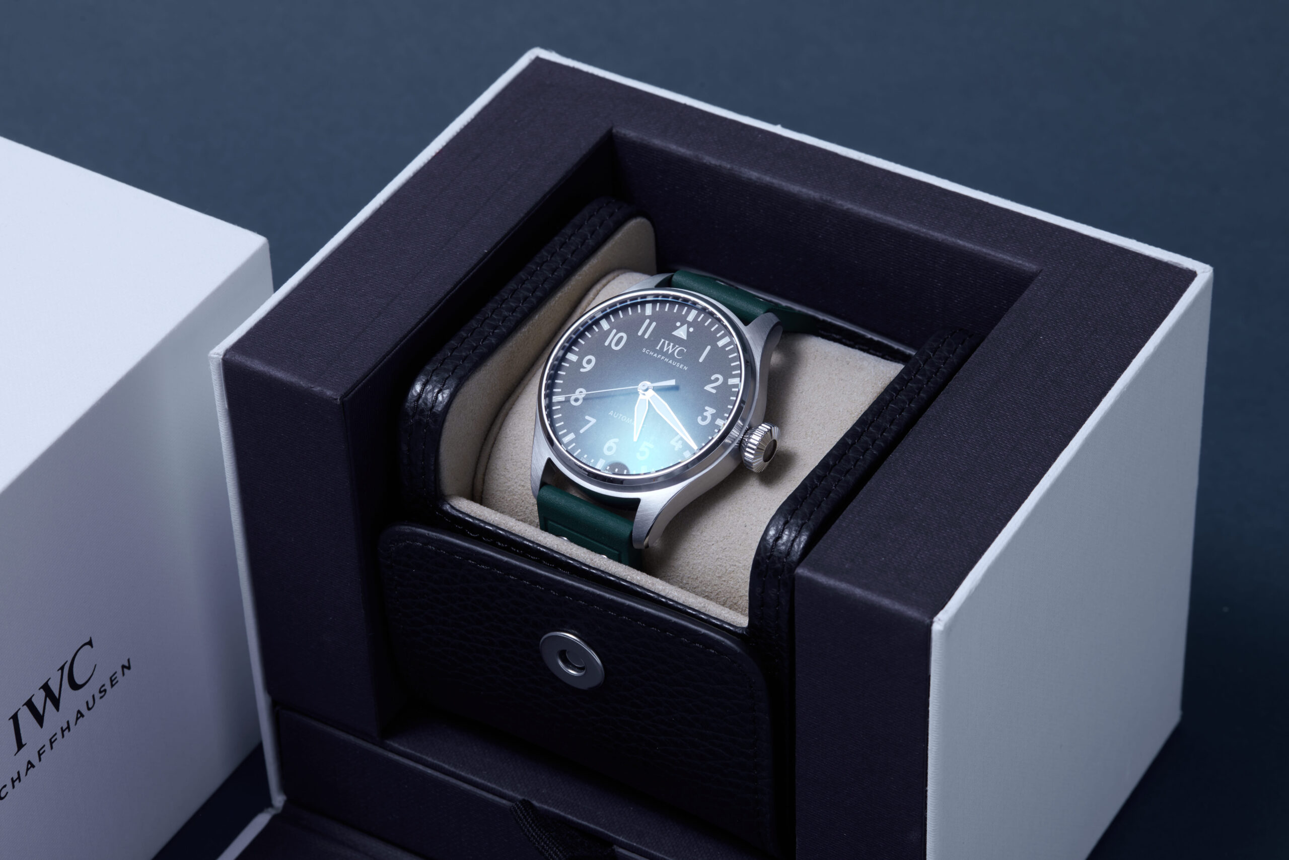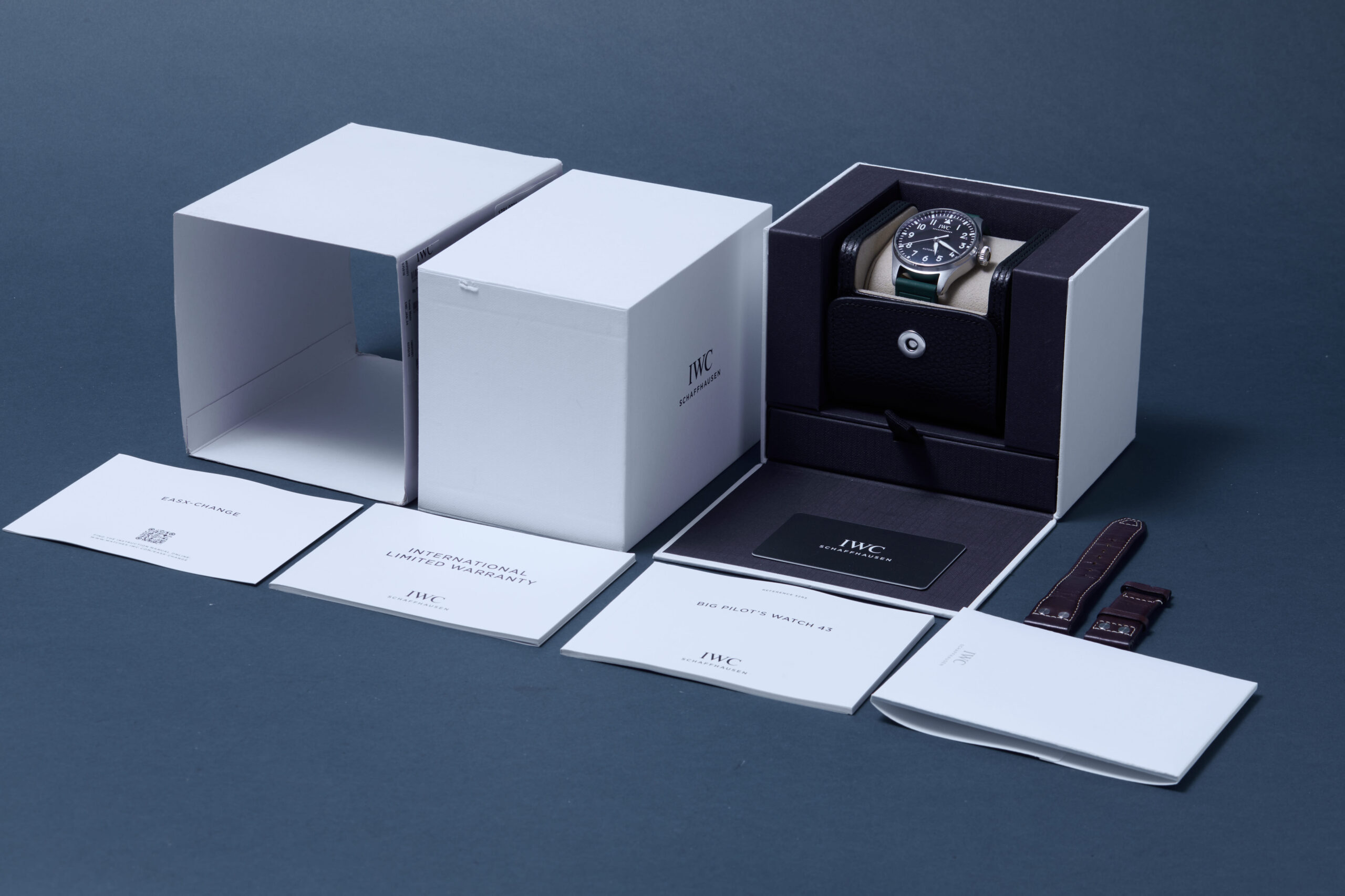 The watch is supplied with its original IWC box, manual booklet, polishing cloth, spare strap and warranty card.