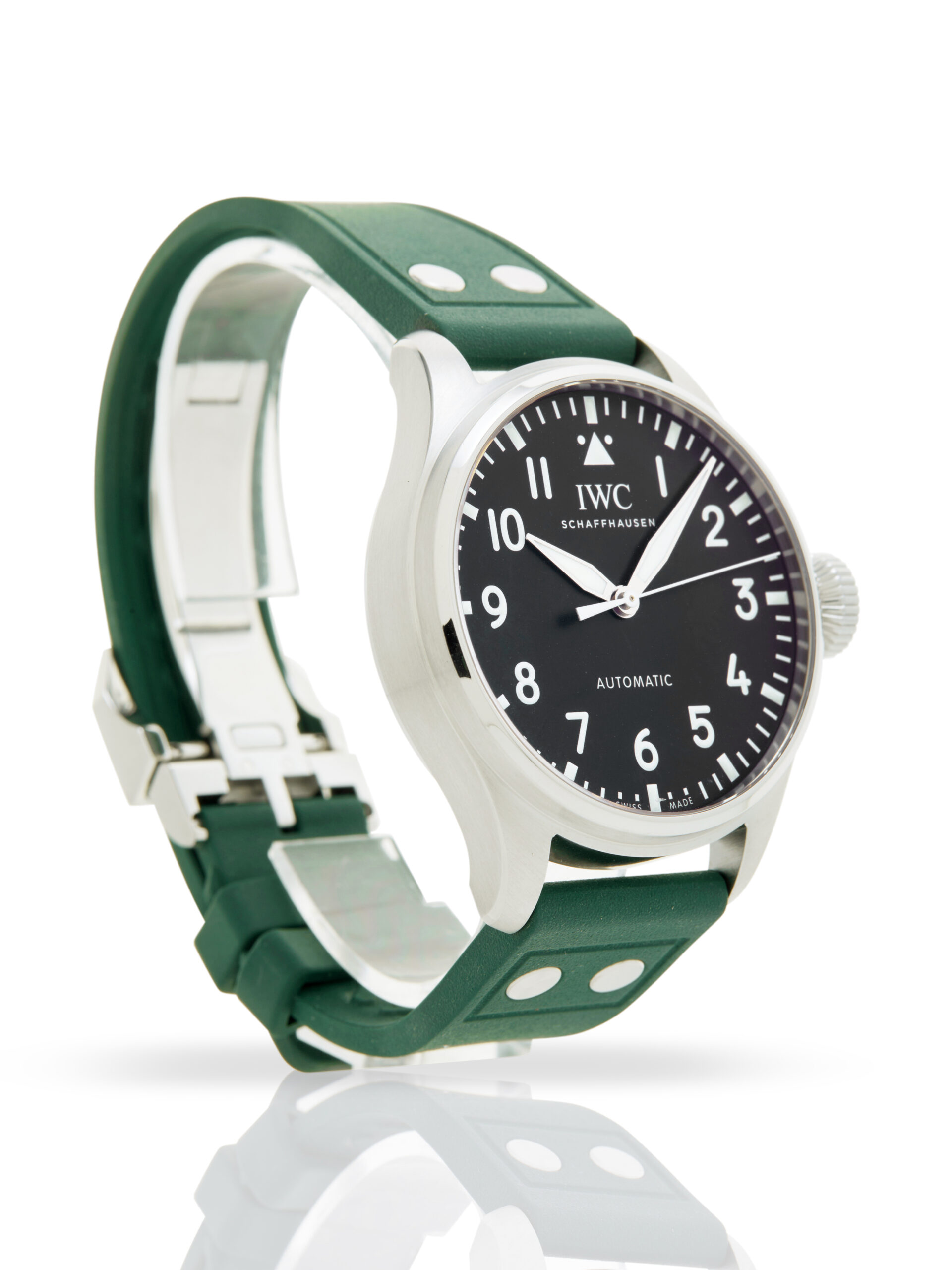 Presented in excellent condition is this stunning example of a 2022 IWC Big Pilot 43 IW329301. The watch features a 43mm stainless steel case, black dial with luminescent Arabic numerals, stainless steel bezel and is coupled to a green rubber strap with a folding clasp. Having been professionally tested for condition and accuracy, it’s deemed to be running perfectly and is showing only very limited signs of wear.
