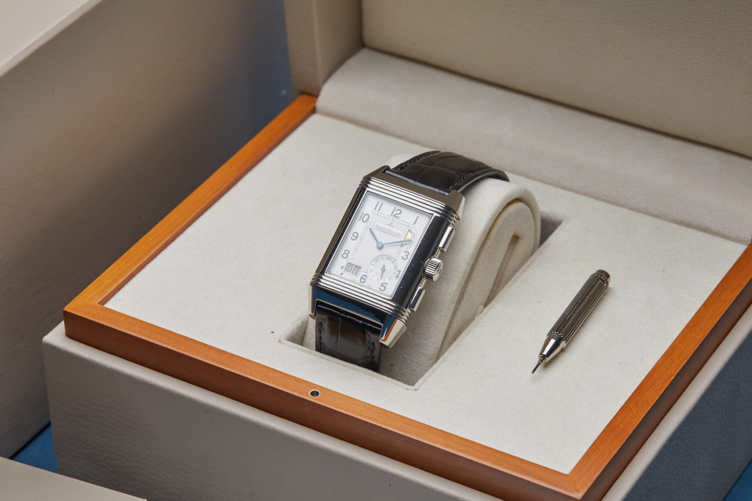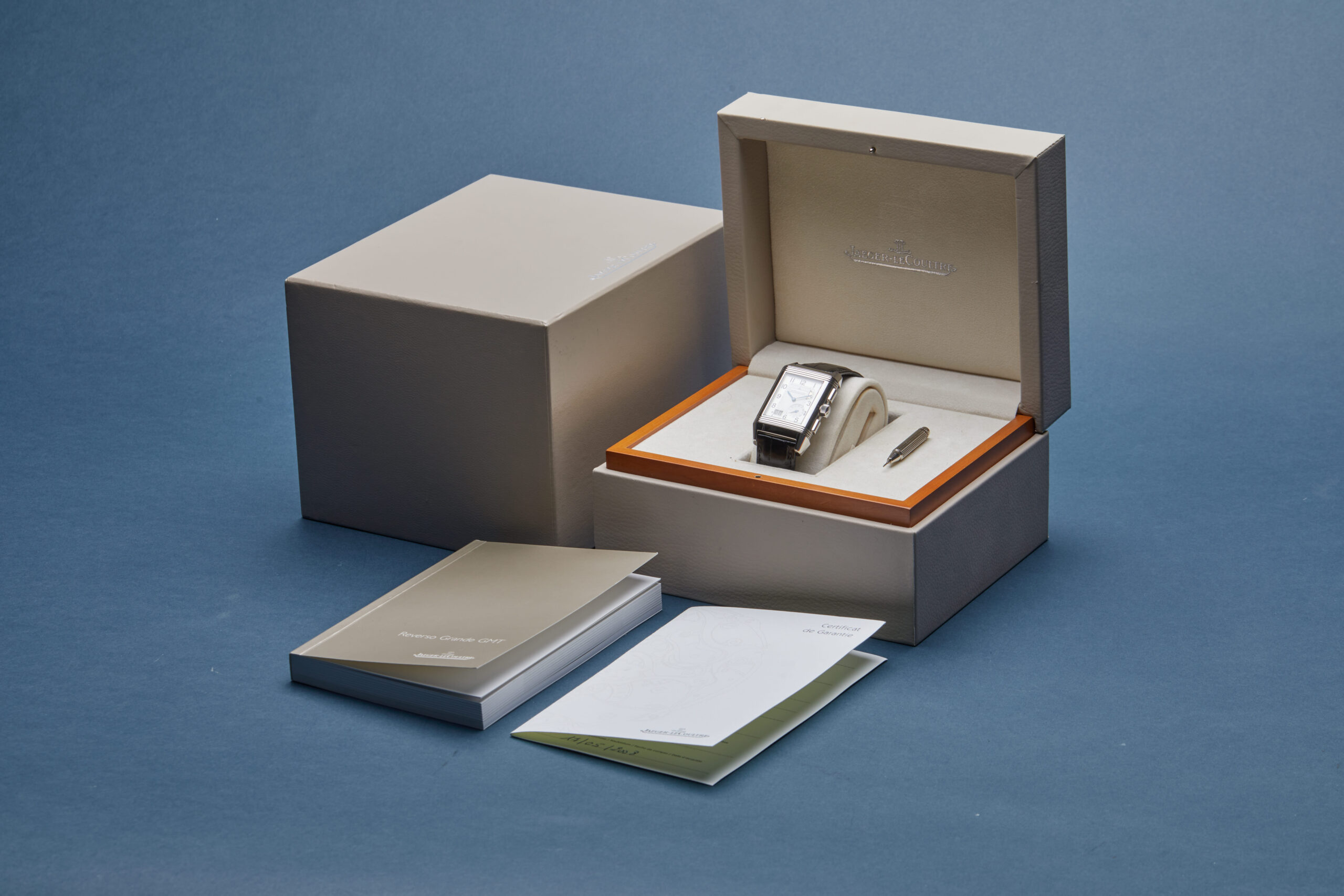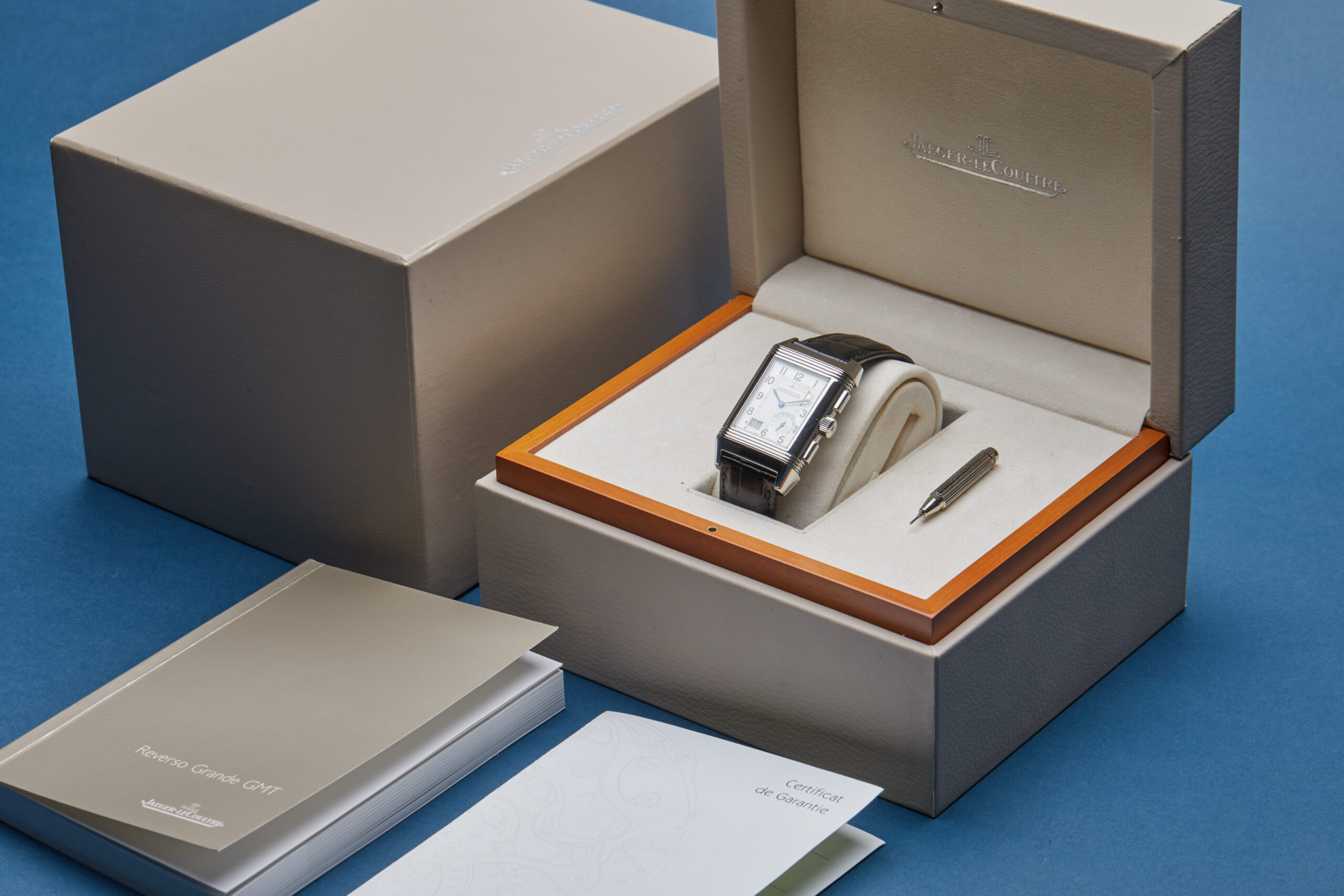 The watch is supplied with its original JLC box, manual booklet, complication stylus and warranty certificate.