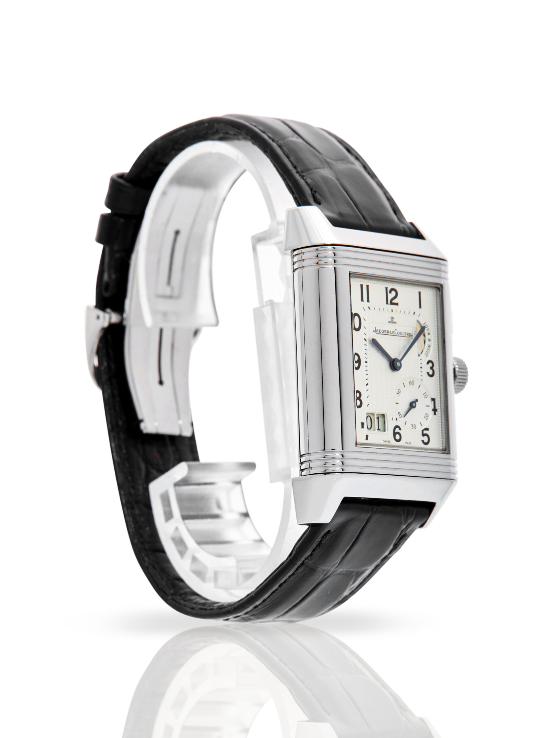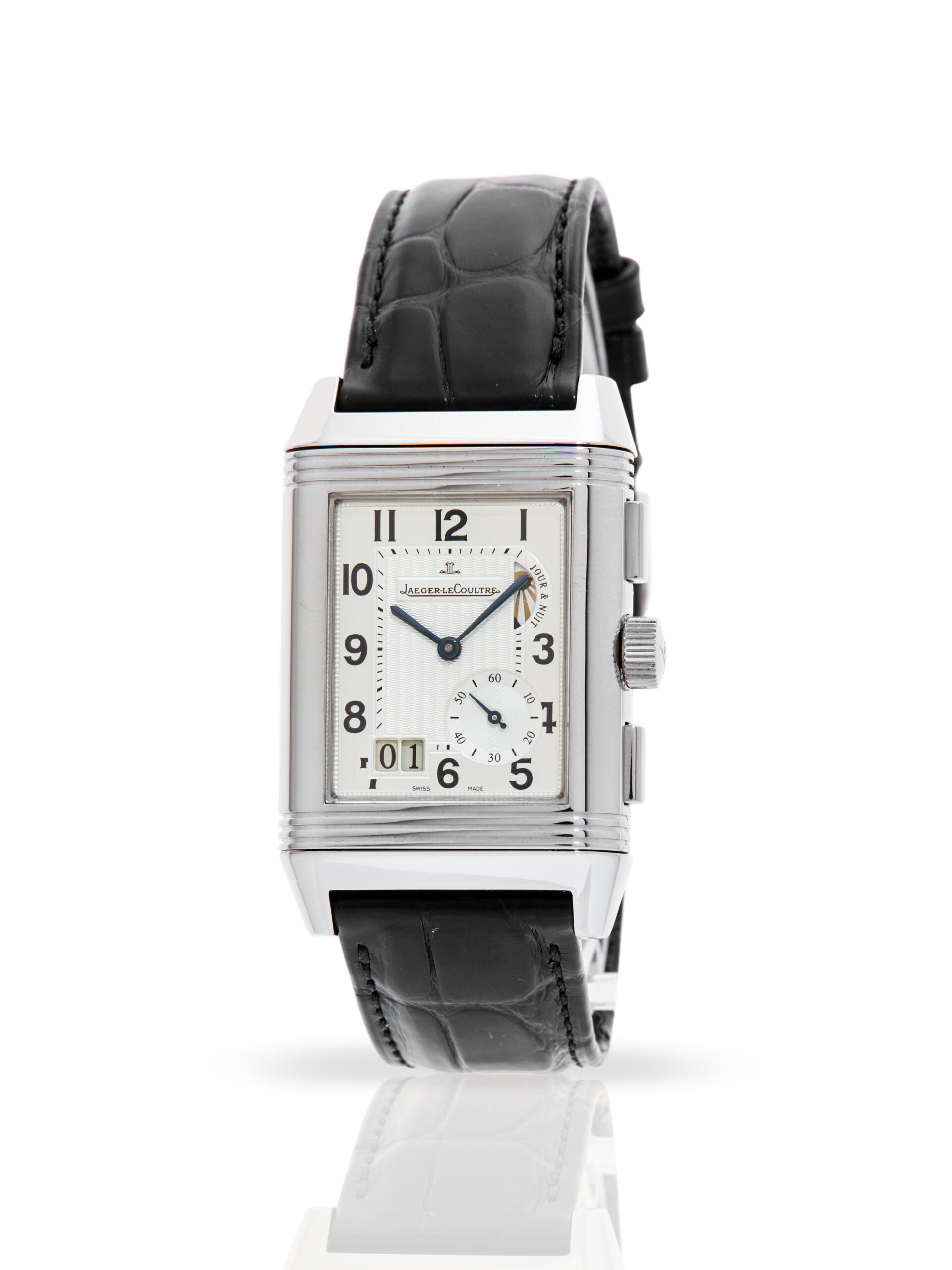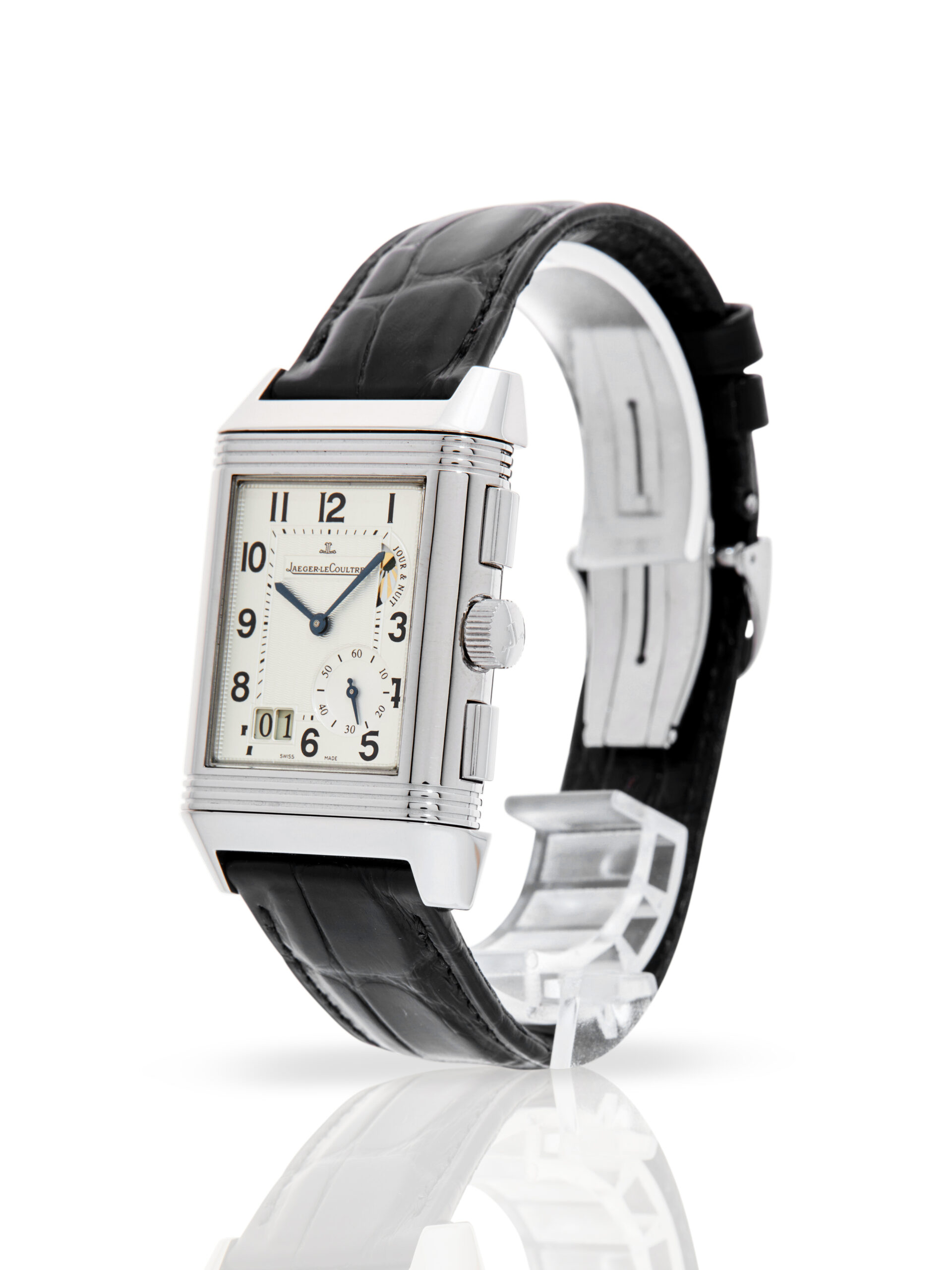 With a signature flip of the case, the watch reveals its darker side: a sophisticated black dial featuring a second time zone (GMT), a power reserve indicator, and a secondary day/night display. Professionally tested for accuracy and showing only minor signs of wear, this timepiece comes paired with a black alligator strap and a secure folding clasp. It is a rare blend of Art Deco elegance and modern mechanical prowess.
