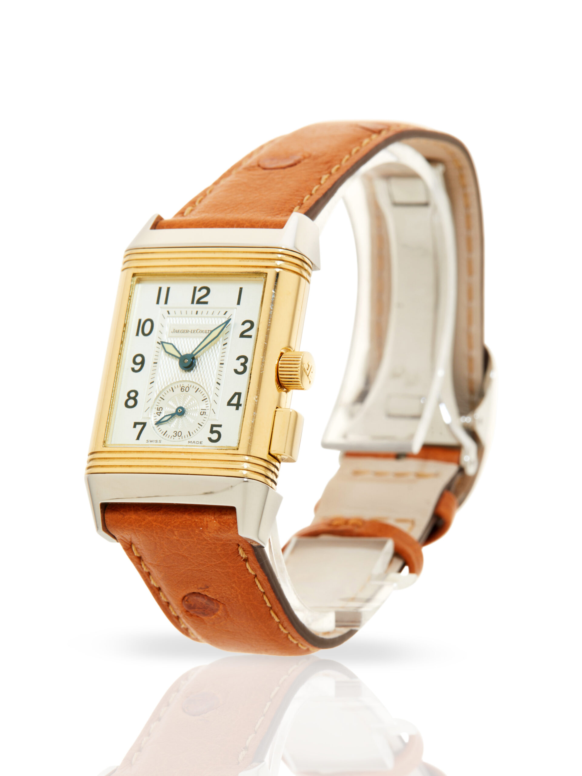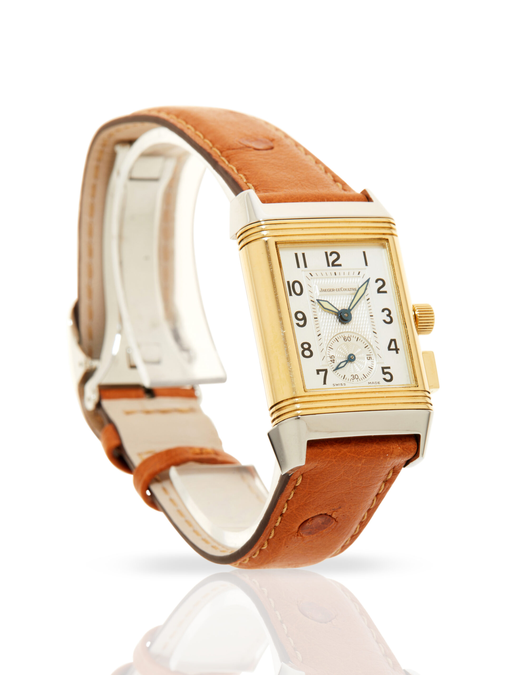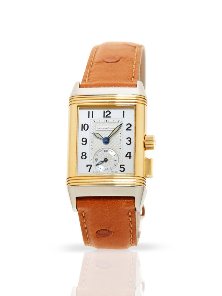 Presented in very good condition is this elegant example of a Jaeger-LeCoultre Reverso Duoface Memory 255.5.82. The watch features an 18K yellow gold & stainless steel swivelling case, silver guilloché dial with Arabic numerals, small seconds (primary face) and a black dial with luminous markers, ‘memory’ function, and is coupled to a brand new brown ostrich leather strap with a folding clasp. Having been professionally tested for condition and accuracy, it’s deemed to be running well and is showing minor signs of wear.