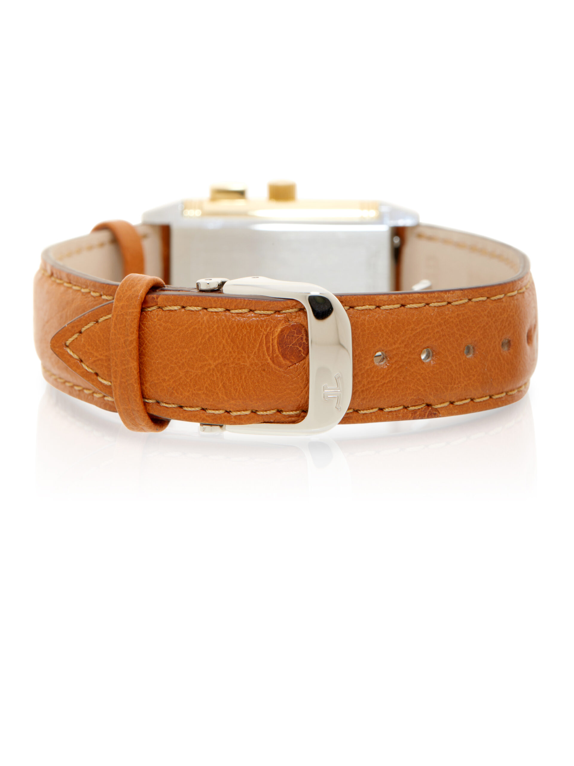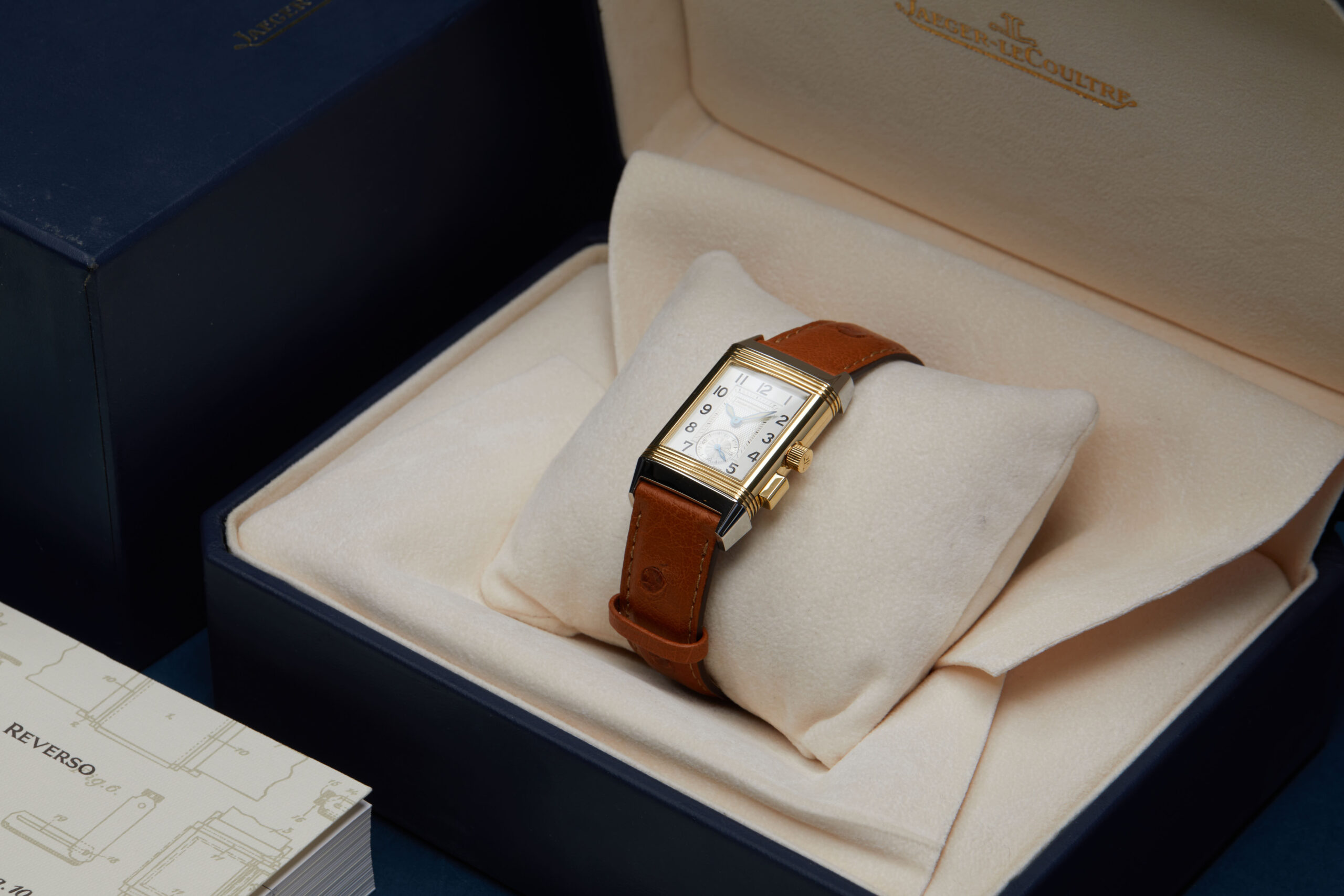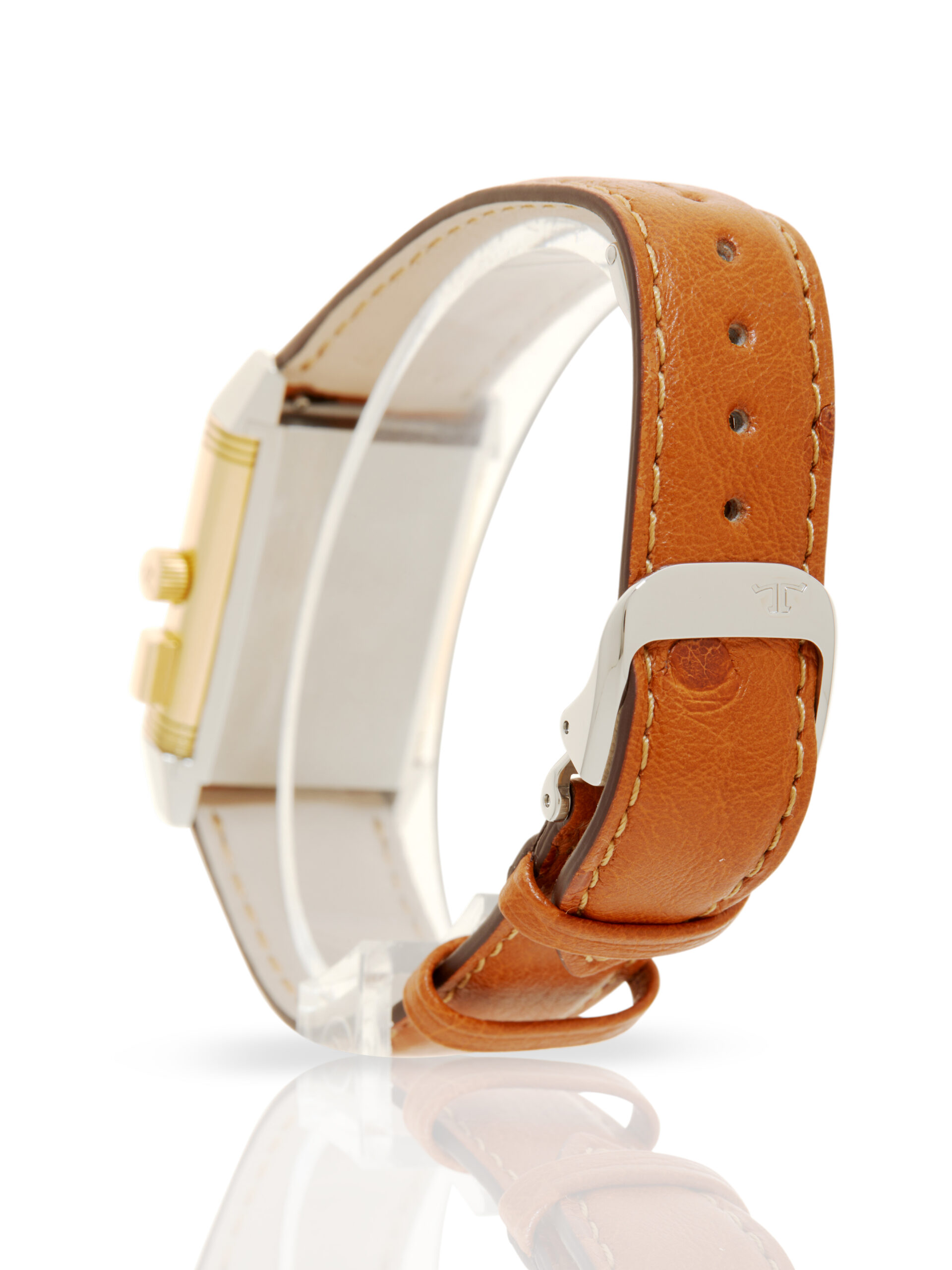 Presented in very good condition is this elegant example of a Jaeger-LeCoultre Reverso Duoface Memory 255.5.82. The watch features an 18K yellow gold & stainless steel swivelling case, silver guilloché dial with Arabic numerals, small seconds (primary face) and a black dial with luminous markers, ‘memory’ function, and is coupled to a brand new brown ostrich leather strap with a folding clasp. Having been professionally tested for condition and accuracy, it’s deemed to be running well and is showing minor signs of wear.