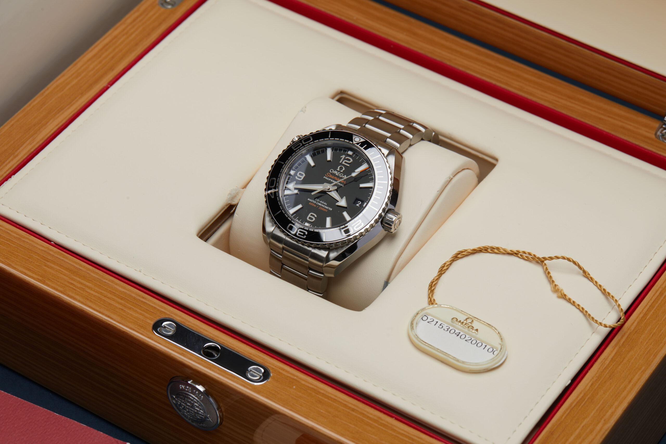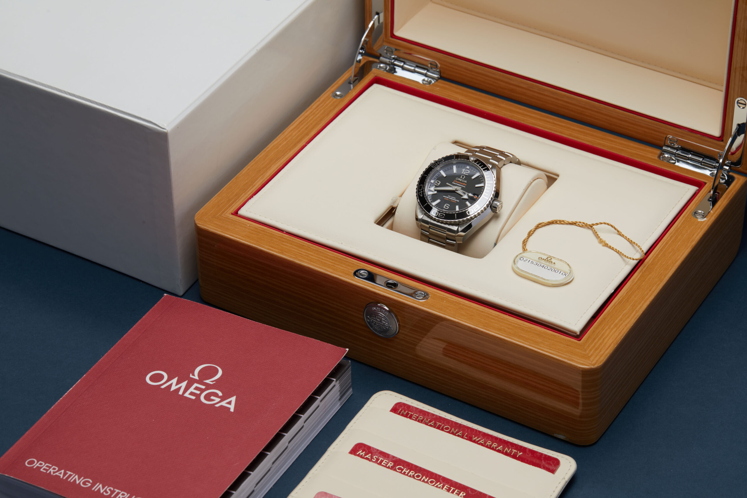 The watch is supplied with its outer box, inner presentation case, manual booklet, swing tag, cream card holder, and three cards: International Warranty, Master Chronometer, and Pictograms.