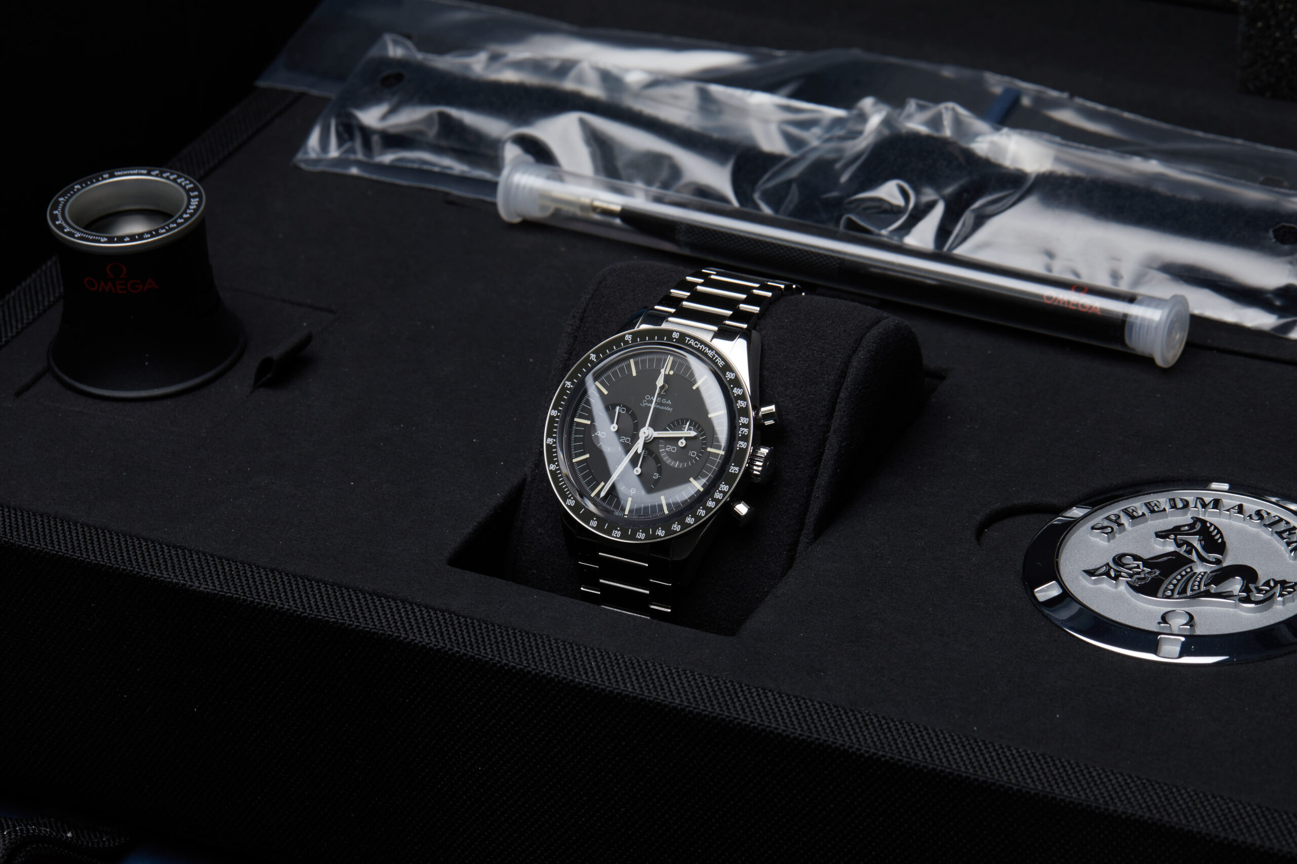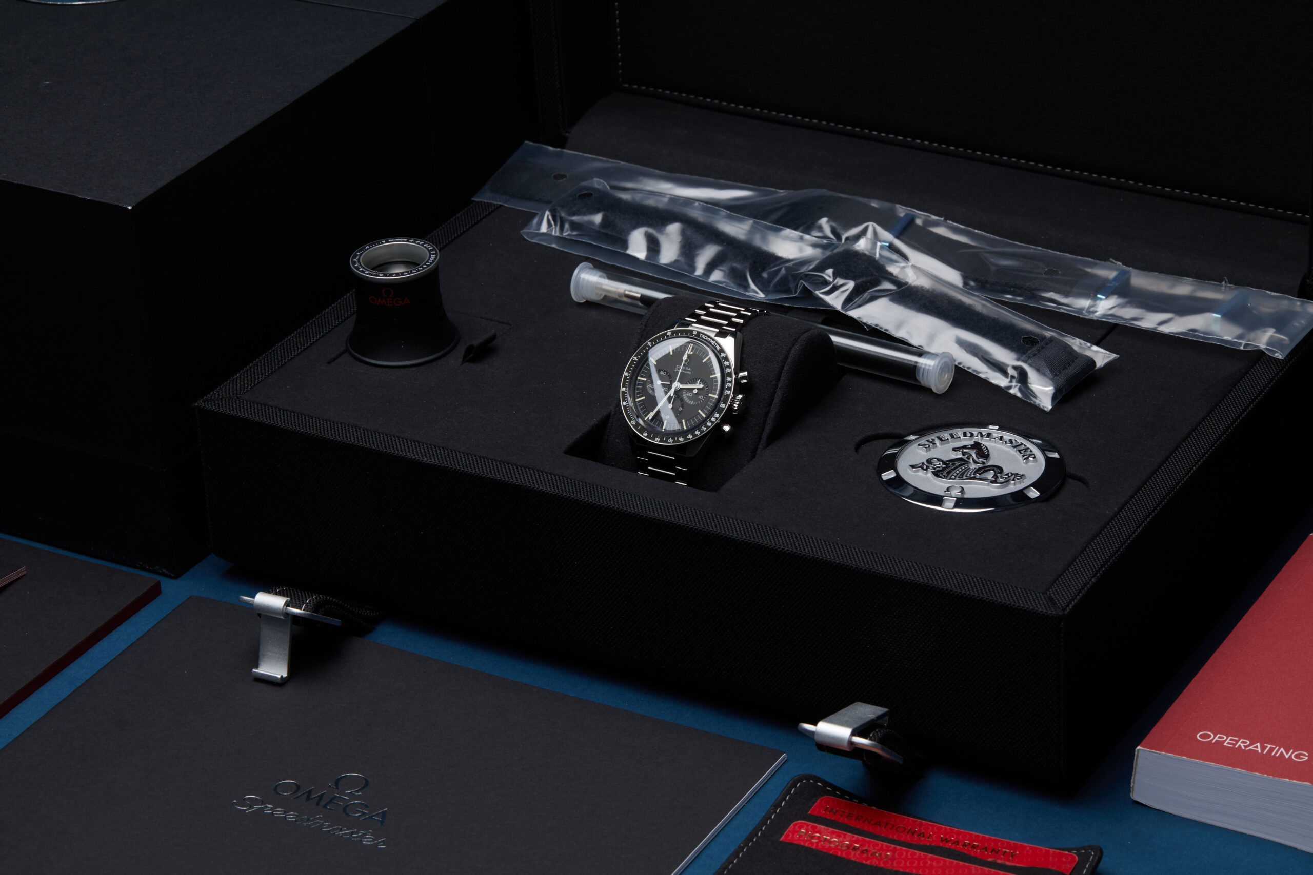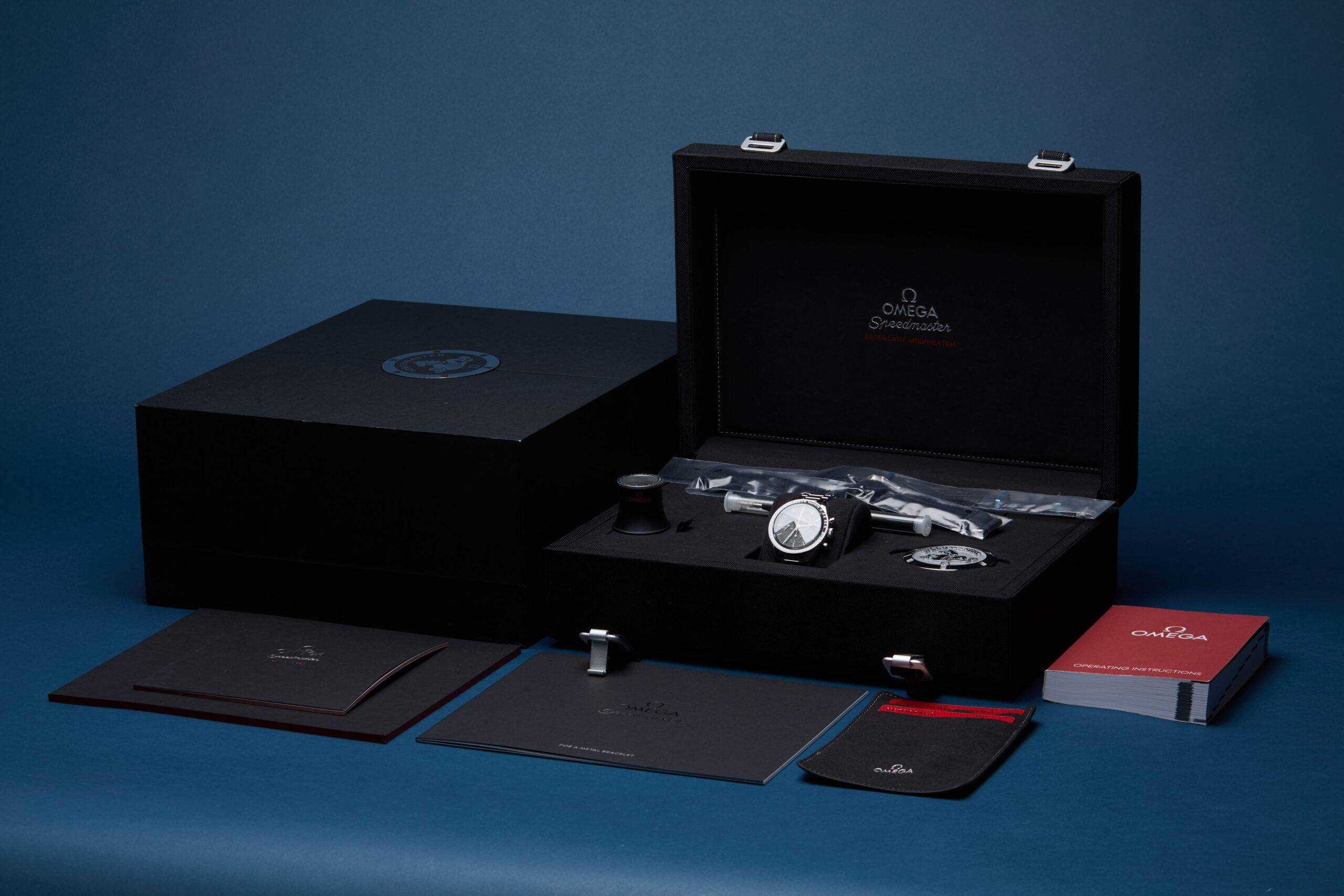 The watch is supplied with its original Omega box, manual booklet, magnifying loupe, spare straps, Speedmaster booklet, spring bar tool, grey wallet, pictograms and warranty card dated Q4 2023 (UK supplied).
