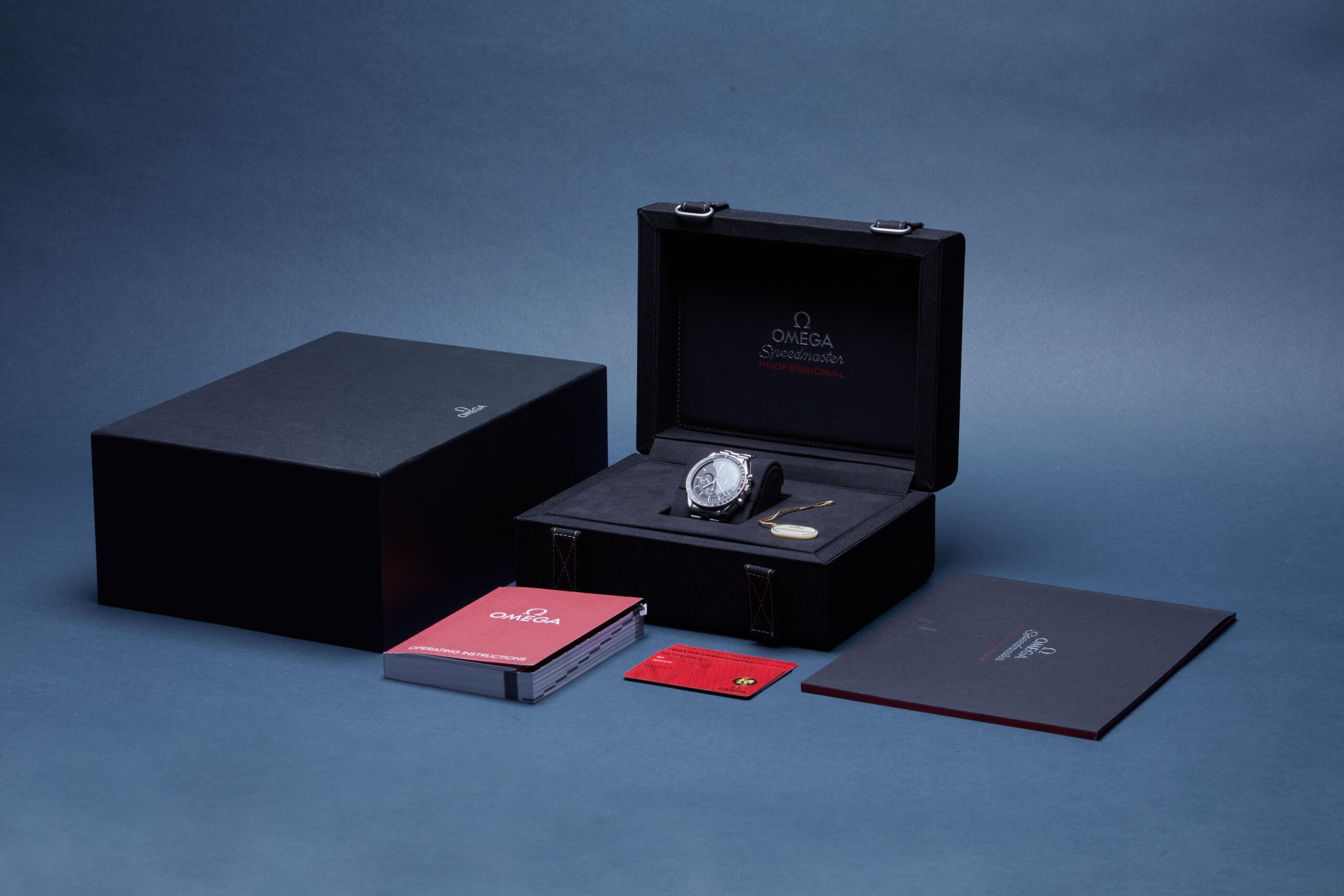 The watch is supplied with its original Omega box, manual booklet, swing tag, Speedmaster booklet, pictograms, master chronometer card and warranty card dated Q2 2021 (UK supplied).