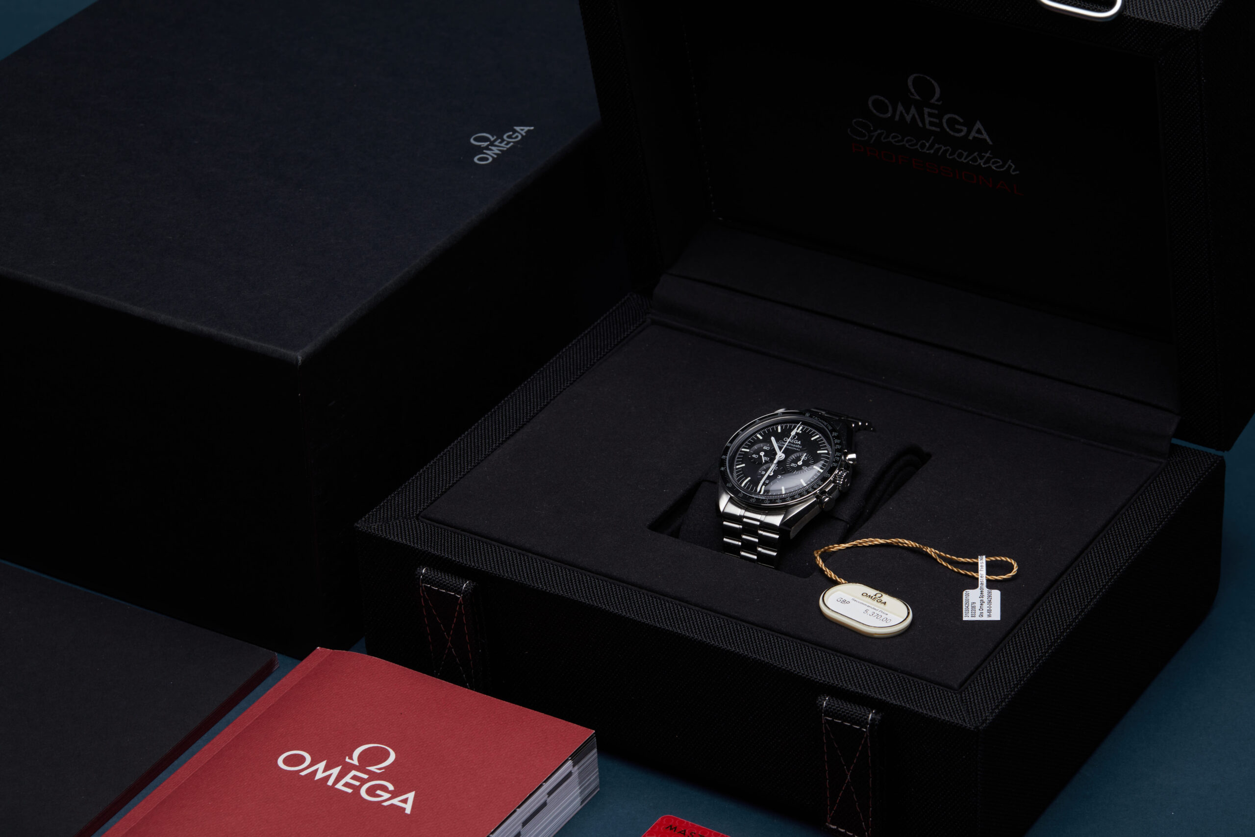 The watch is supplied with its original Omega box, manual booklet, swing tag, Speedmaster booklet, pictograms, master chronometer card and warranty card dated Q3 2021 (UK supplied).