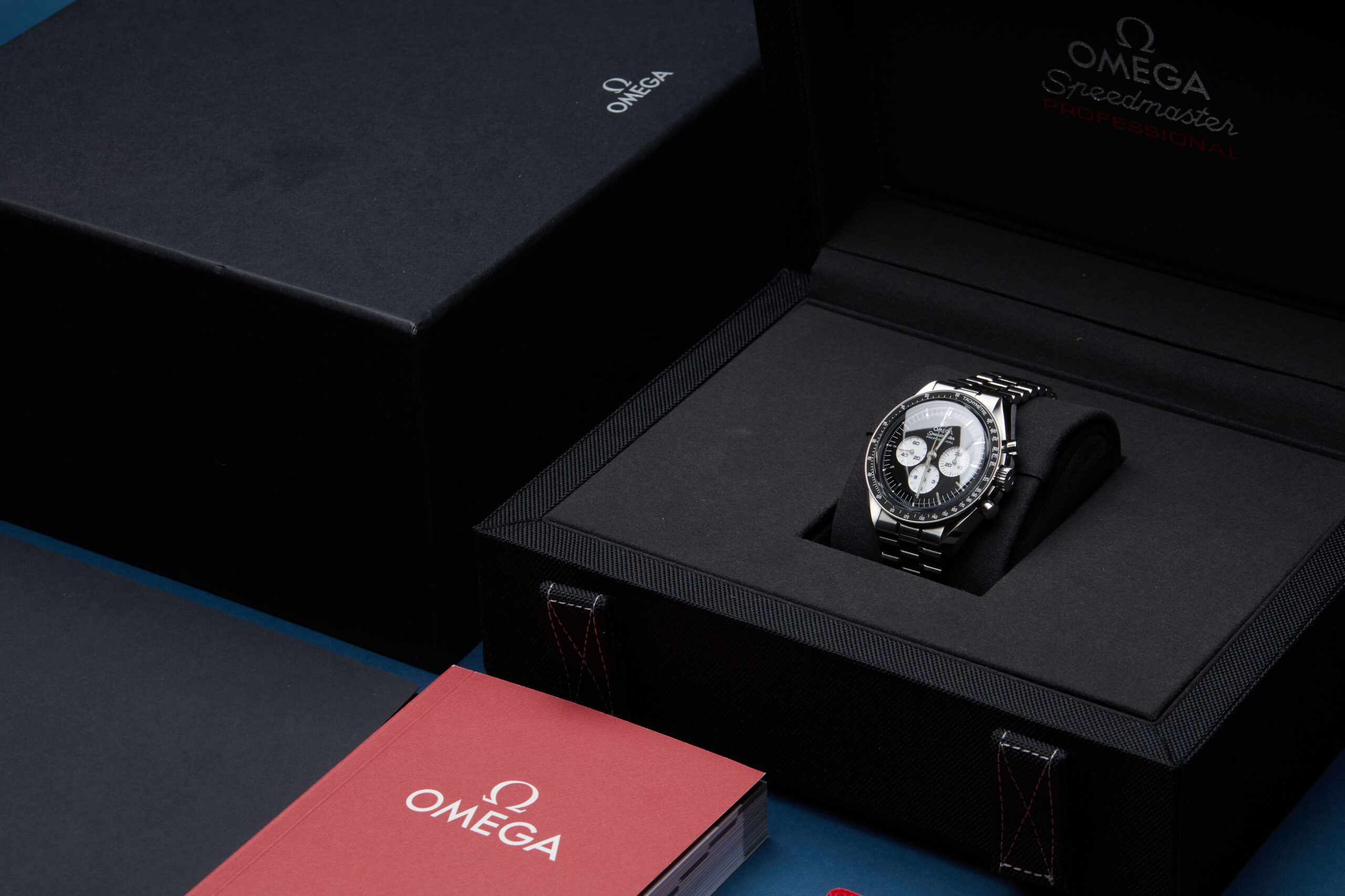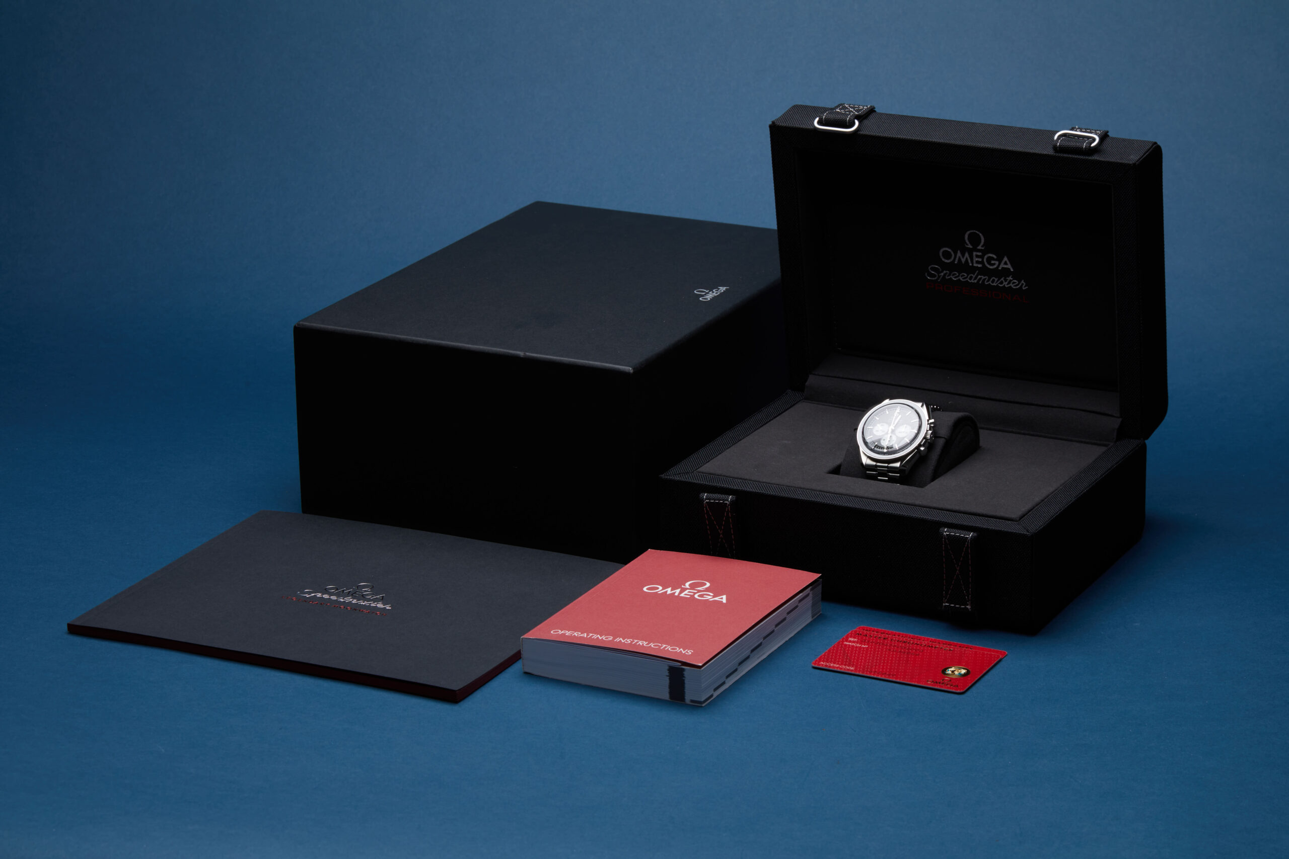 The watch is supplied with its outer box, inner presentation box, master chronometer card, Speedmaster booklet, manual booklet, and international warranty card dated Q1 2026.