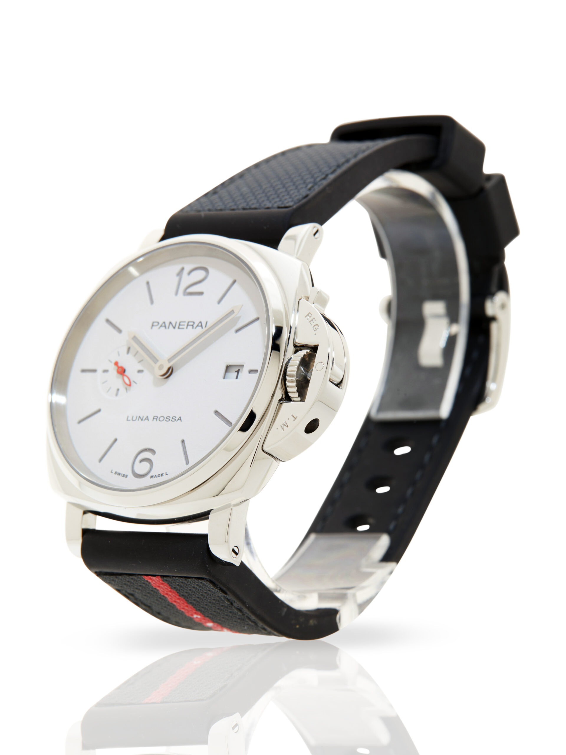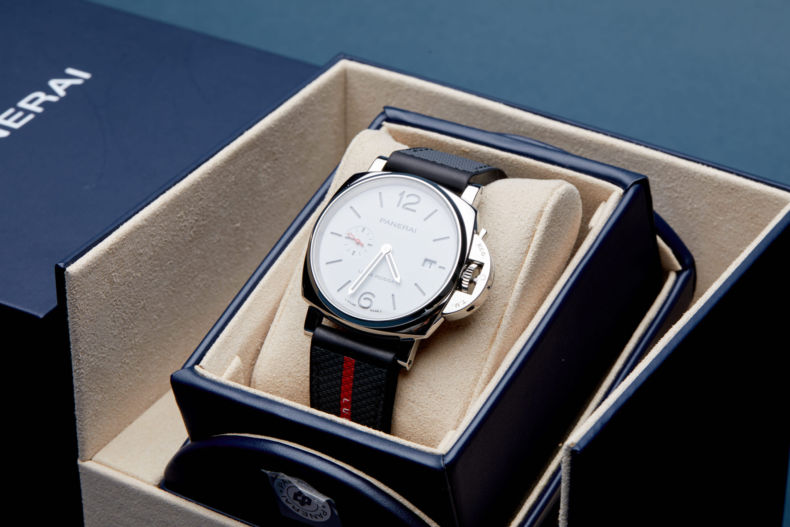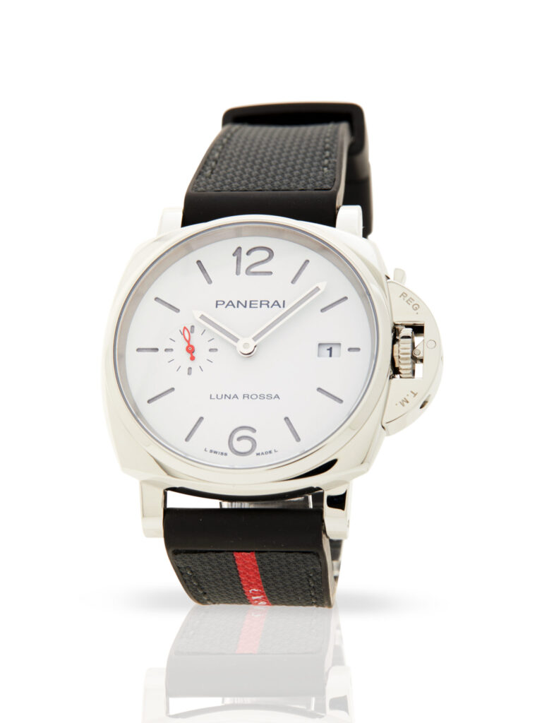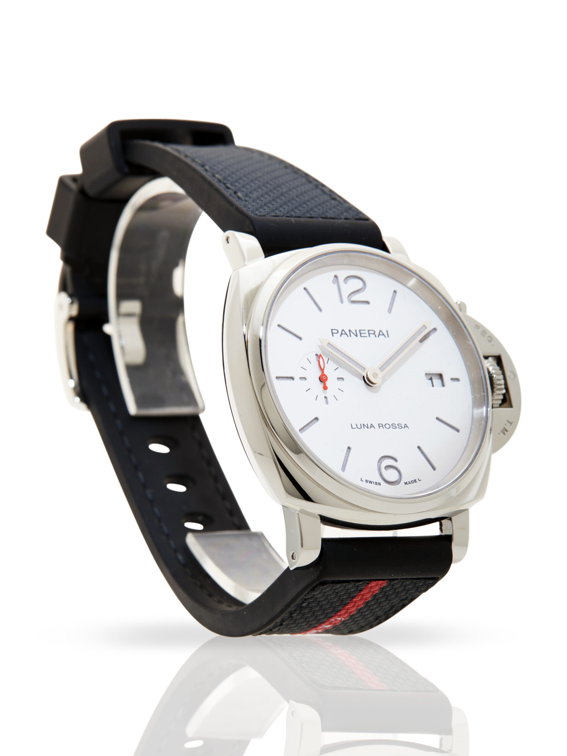 Presented in excellent condition is this great example of a 2024 Panerai Luminor Due Luna Rossa PAM01381. The watch features a 42mm stainless steel case, smooth stainless steel bezel, white dial with small seconds, date display, luminescent hour markers and is coupled to a rubber strap with a grey textile Luna Rossa outside layer. Having been professionally tested for condition and accuracy, it’s deemed to be running perfectly and is showing barely any signs of wear.