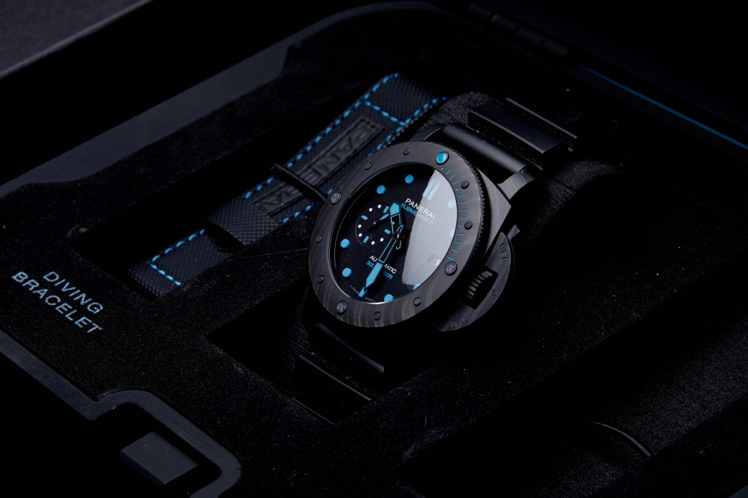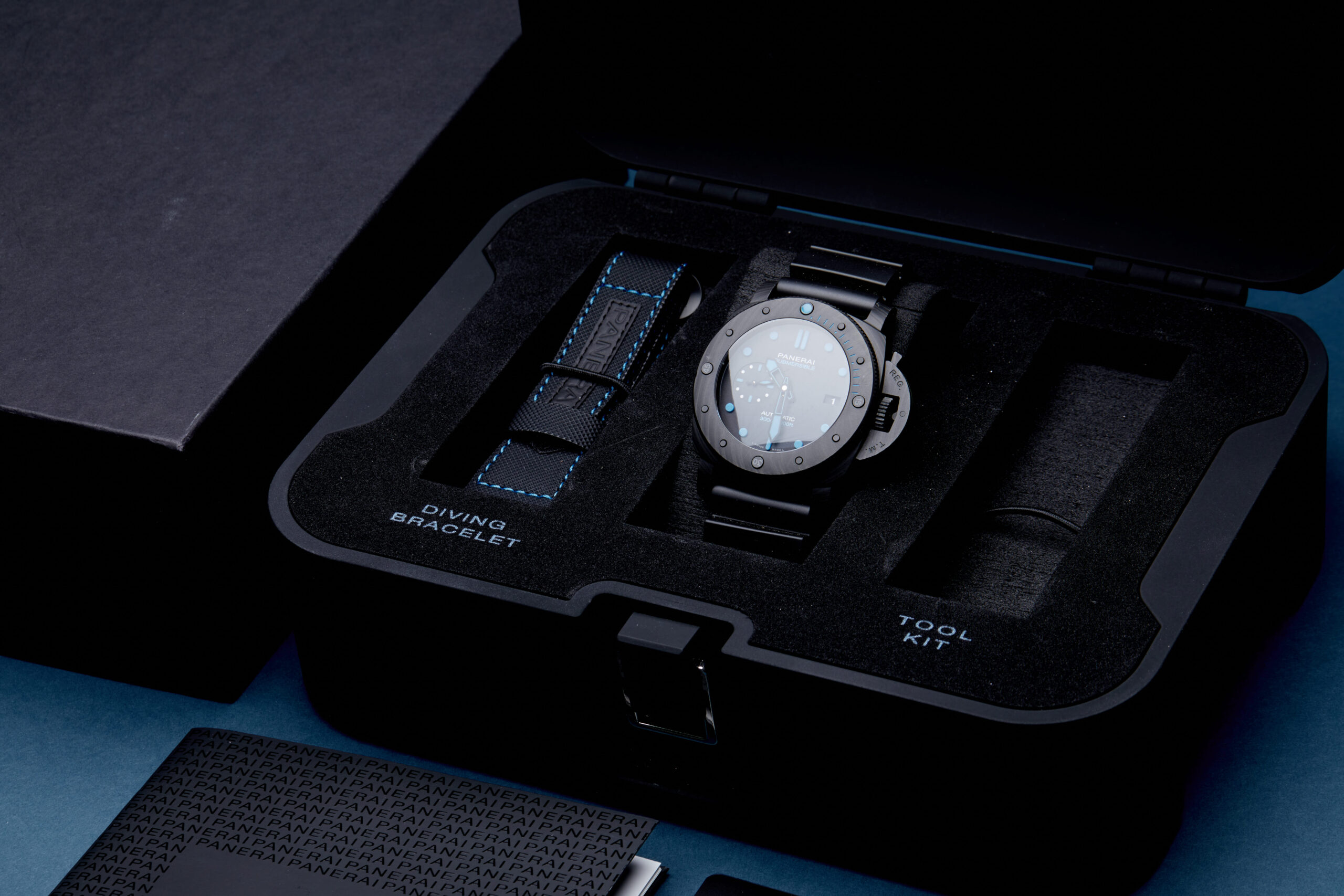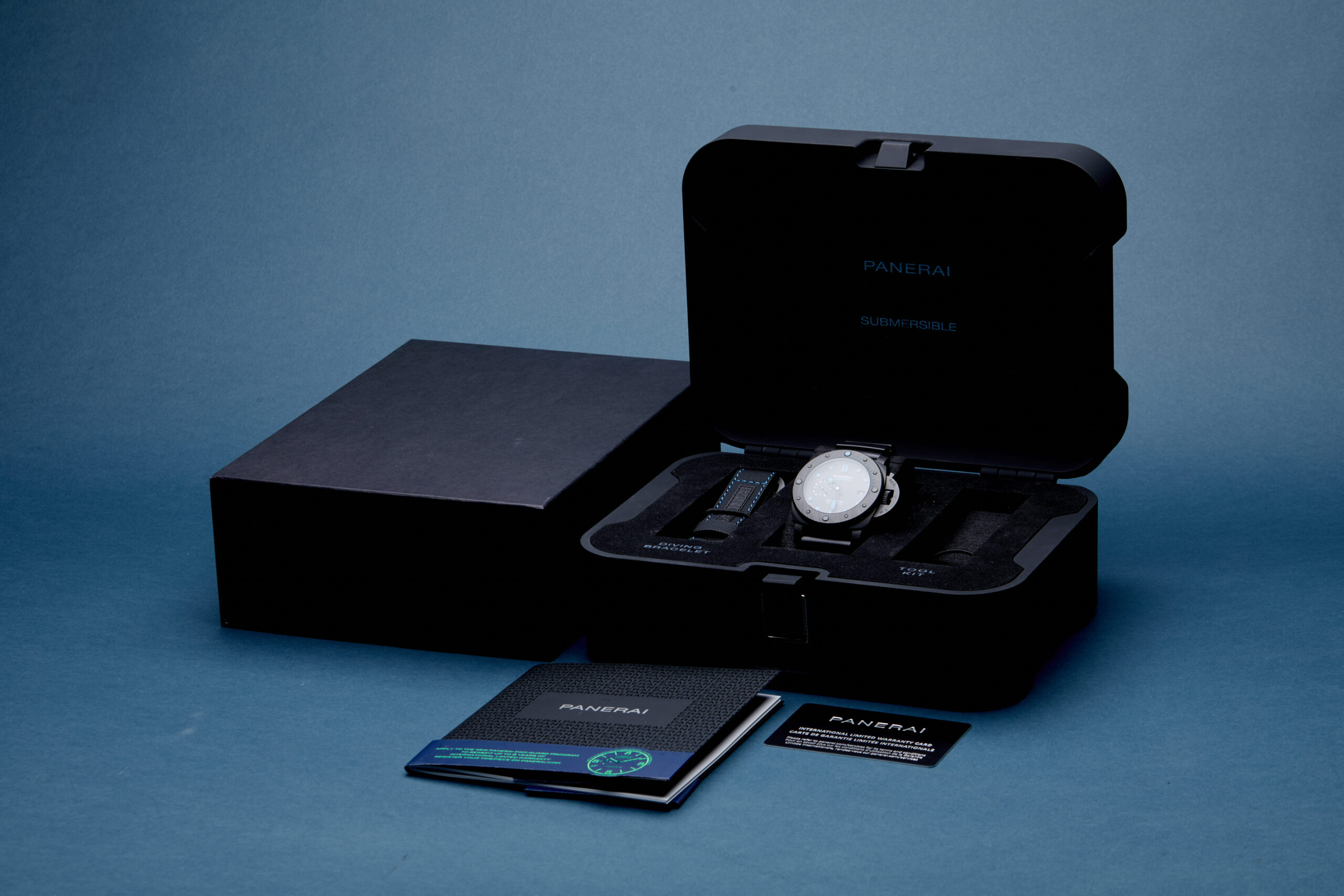 The watch is supplied with its original Panerai box, diving strap, manual booklet and warranty card dated Q3 2023.