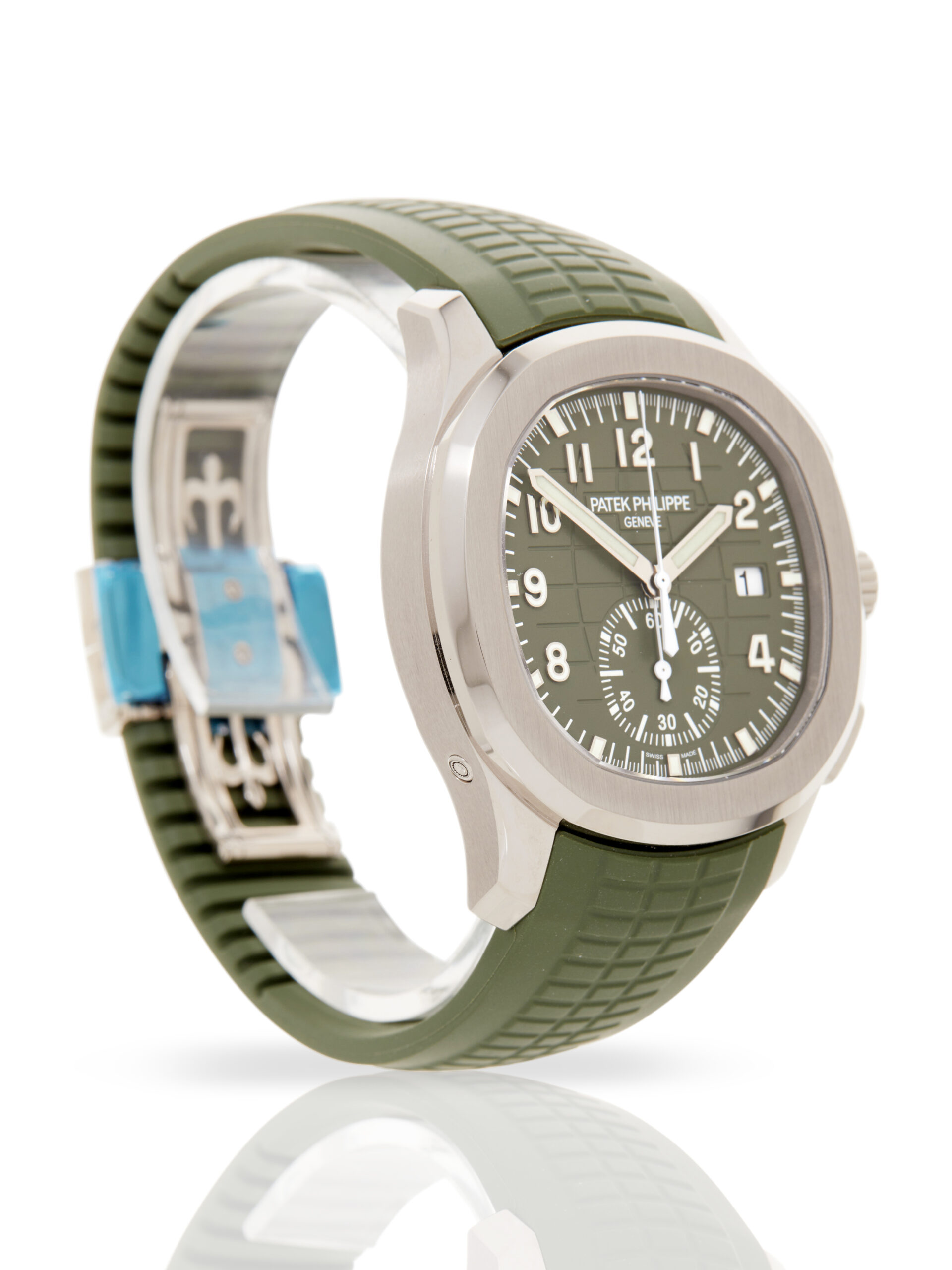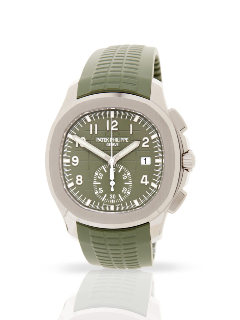 Presented in unworn (un-stickered) condition is this stunning example of a 2026 Patek Philippe Aquanaut 5968G-010. The watch features a 42mm 18K white gold case, green embossed dial with luminescent hour markers, brushed 18K white gold bezel and is coupled to a green rubber strap with a double folding clasp. Having been professionally tested for condition and accuracy, it’s deemed to be running perfectly, ready for its new, lucky owner.