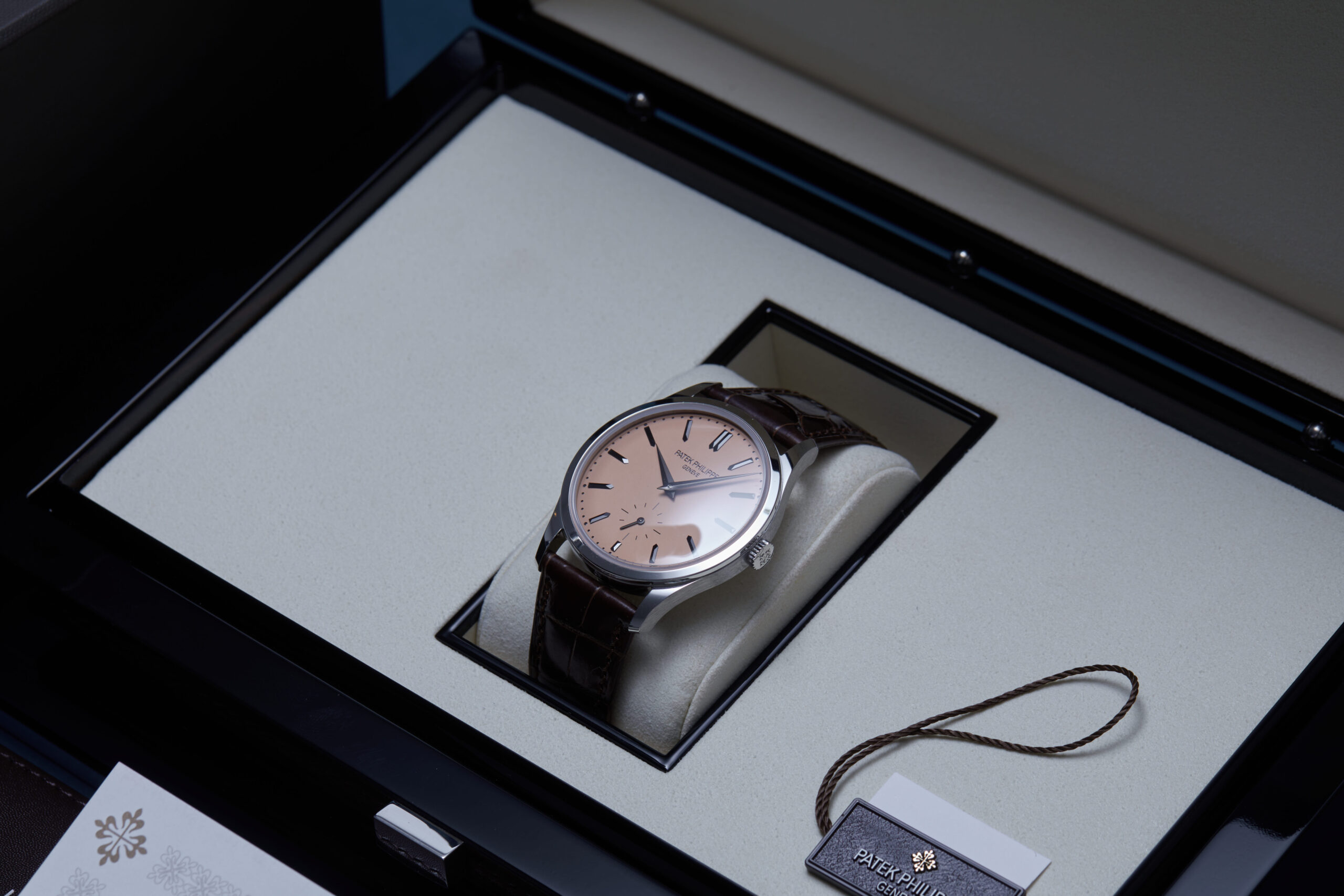 Presented in unworn condition is this elegant example of a 2025 Patek Philippe Calatrava 6196P-001. The watch features a 38mm platinum case, ‘salmon’ pink baton dial with small seconds at 6 o’clock and is coupled to a brown alligator strap with a platinum pin buckle. Having been professionally tested for condition and accuracy, it’s deemed to be running perfectly, ready for its new, lucky owner.
