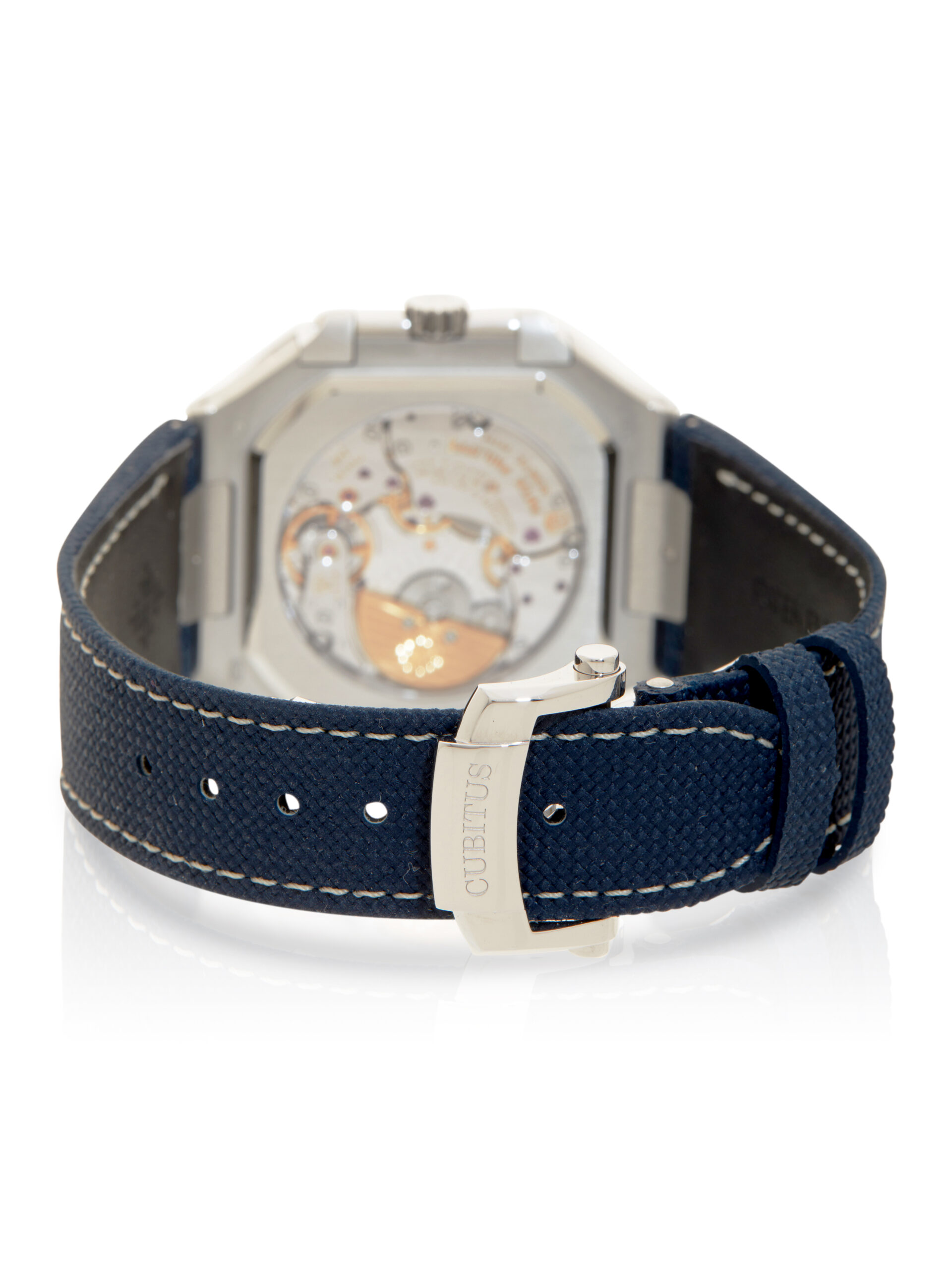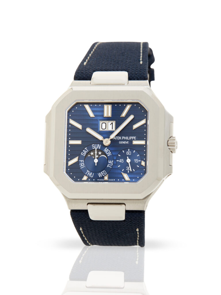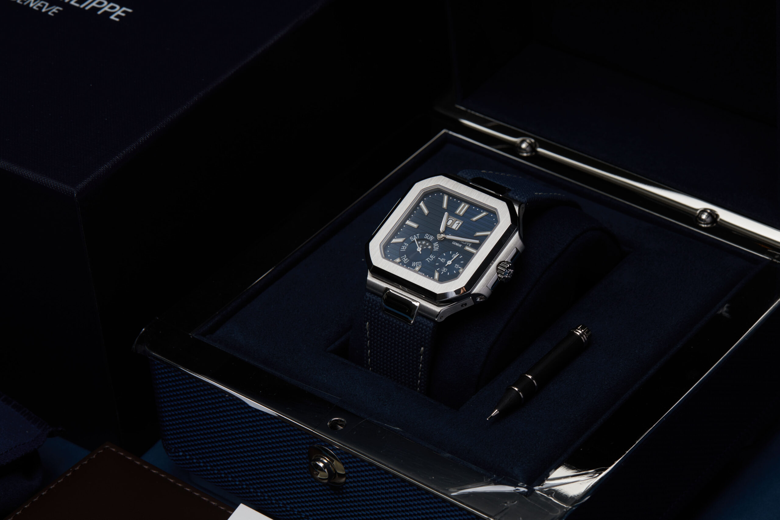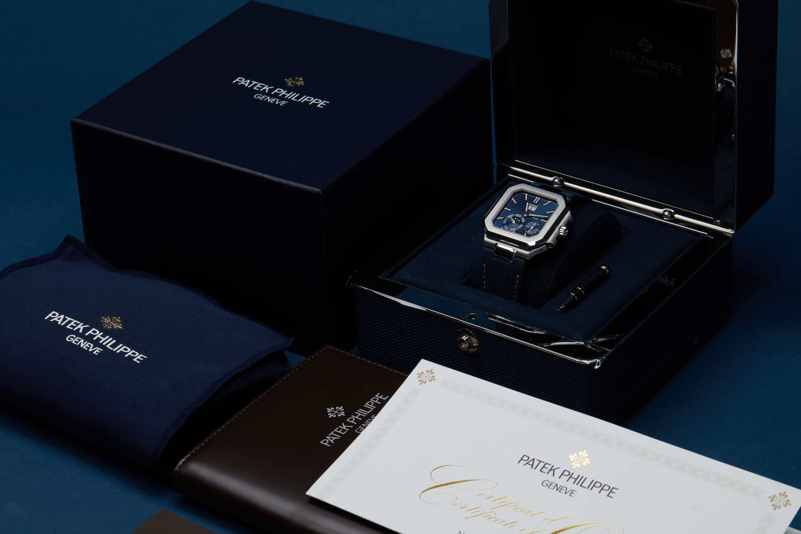 Presented in unworn condition is this elegant example of a 2026 Patek Philippe 5822P-001 Cubitus. Representing the first new collection from the brand in over 25 years, the watch features a 45mm platinum case, brushed and polished bezel, blue sunburst dial with luminous indices and numerals and is coupled to a navy blue composite strap. Having been professionally tested for condition and accuracy, it’s deemed to be running perfectly.