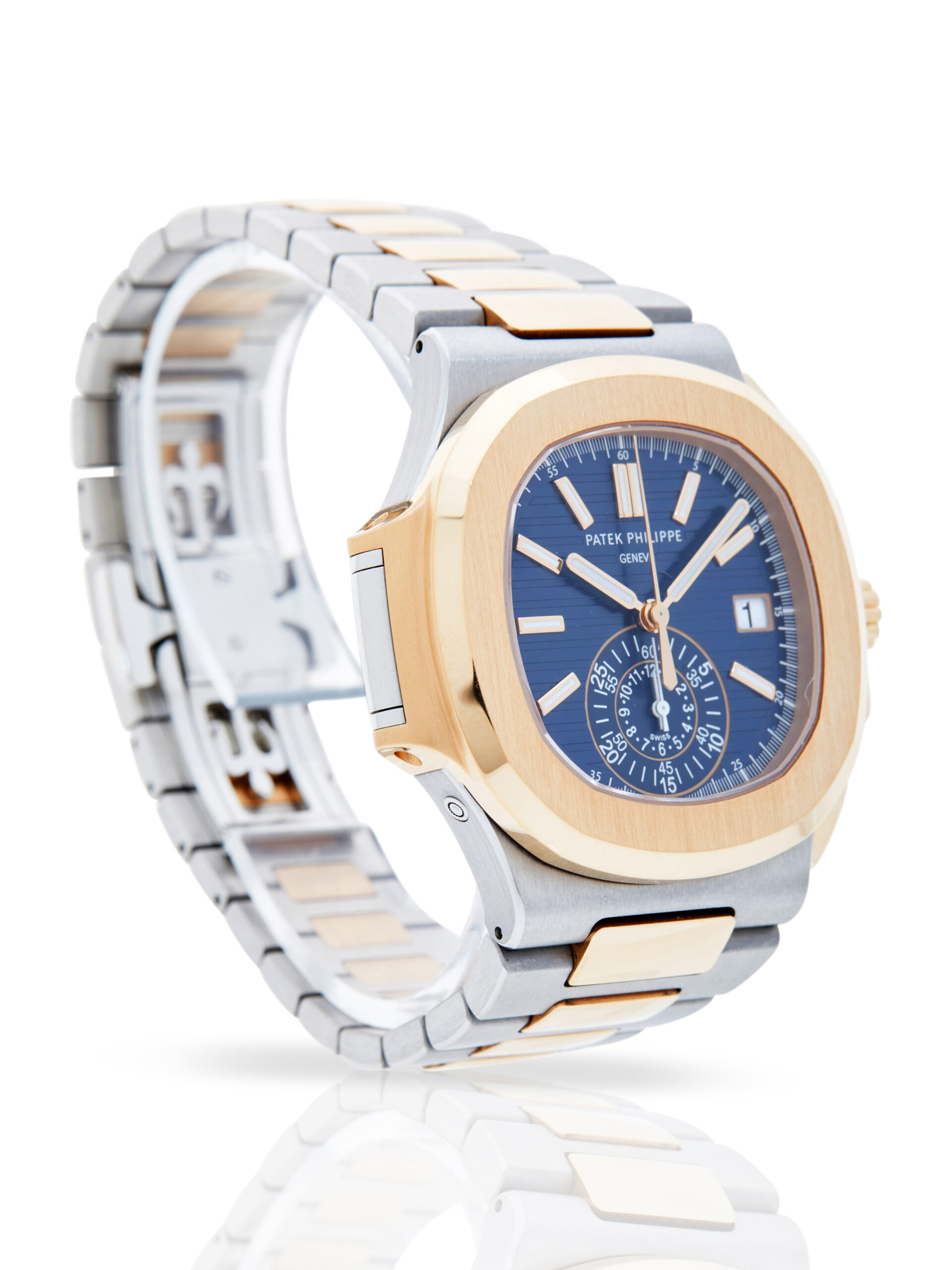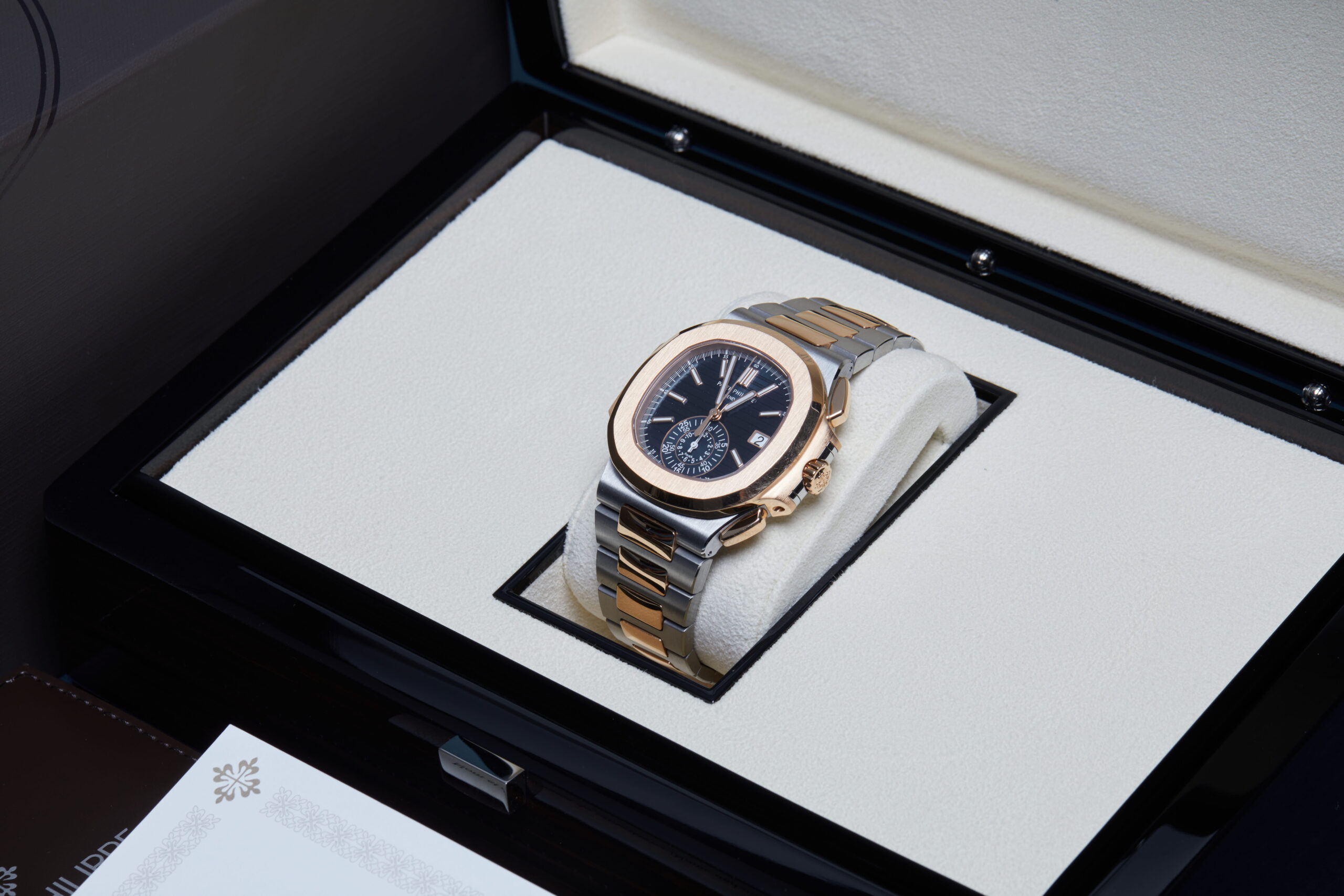 This eye-catching example of a 2024 Patek Philippe Nautilus 5980/1AR-001 features a 40.5mm stainless steel case, 18K rose gold brushed bezel, blue embossed chronograph dial with date function and is coupled to a bi-metal bracelet with a double folding clasp. Having been professionally tested for condition and accuracy, it’s deemed to be running very well and is showing only very minor signs of wear.
