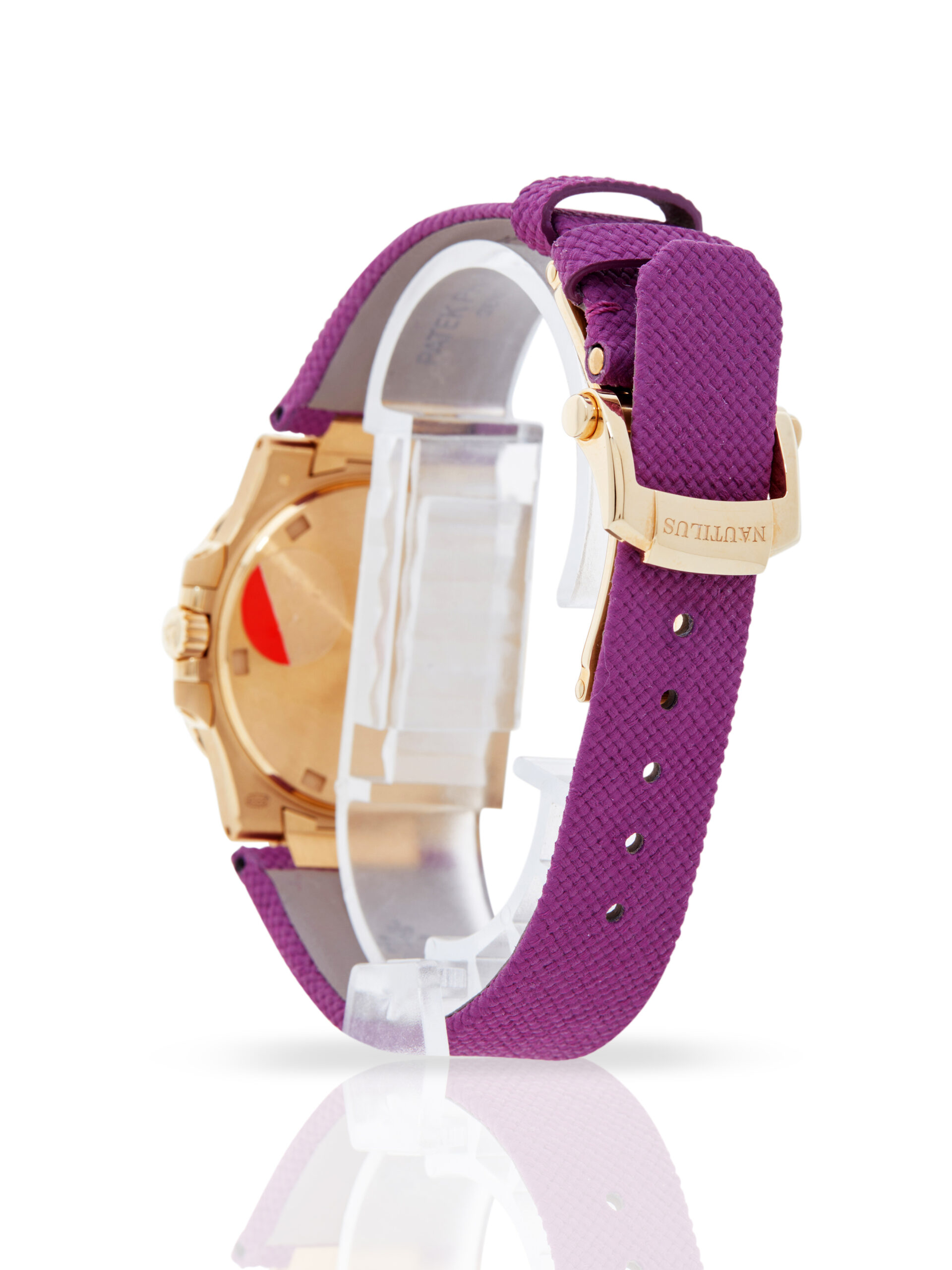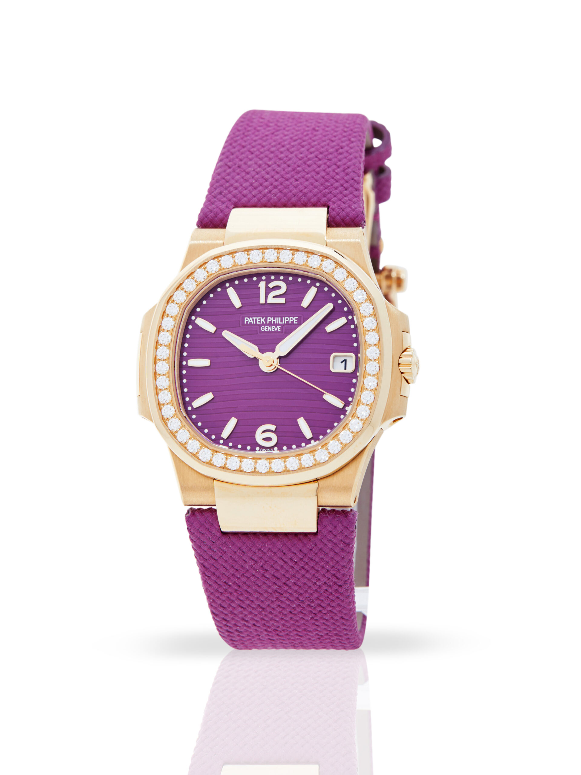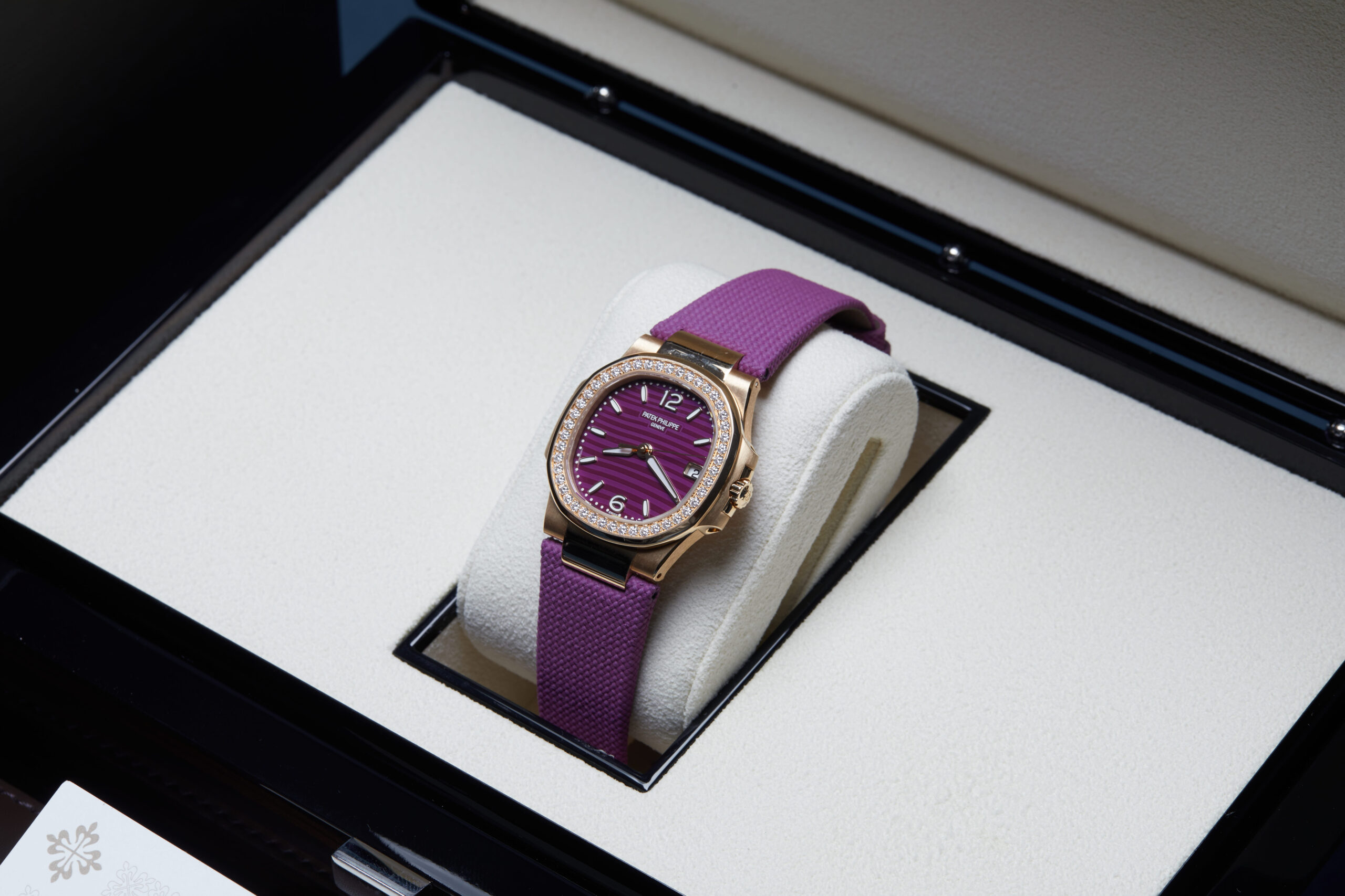 Presented in unworn condition is this lovely example of a 2023 Patek Philippe Nautilus 7010R-013. The watch features a 32mm 18K rose gold case, purple embossed dial with luminescent hour markers, 18K rose gold bezel with factory set diamonds and is coupled to a purple textile strap with an 18K rose gold folding clasp. Having been professionally tested for condition, it’s deemed to be running perfectly, ready for its new, lucky owner.