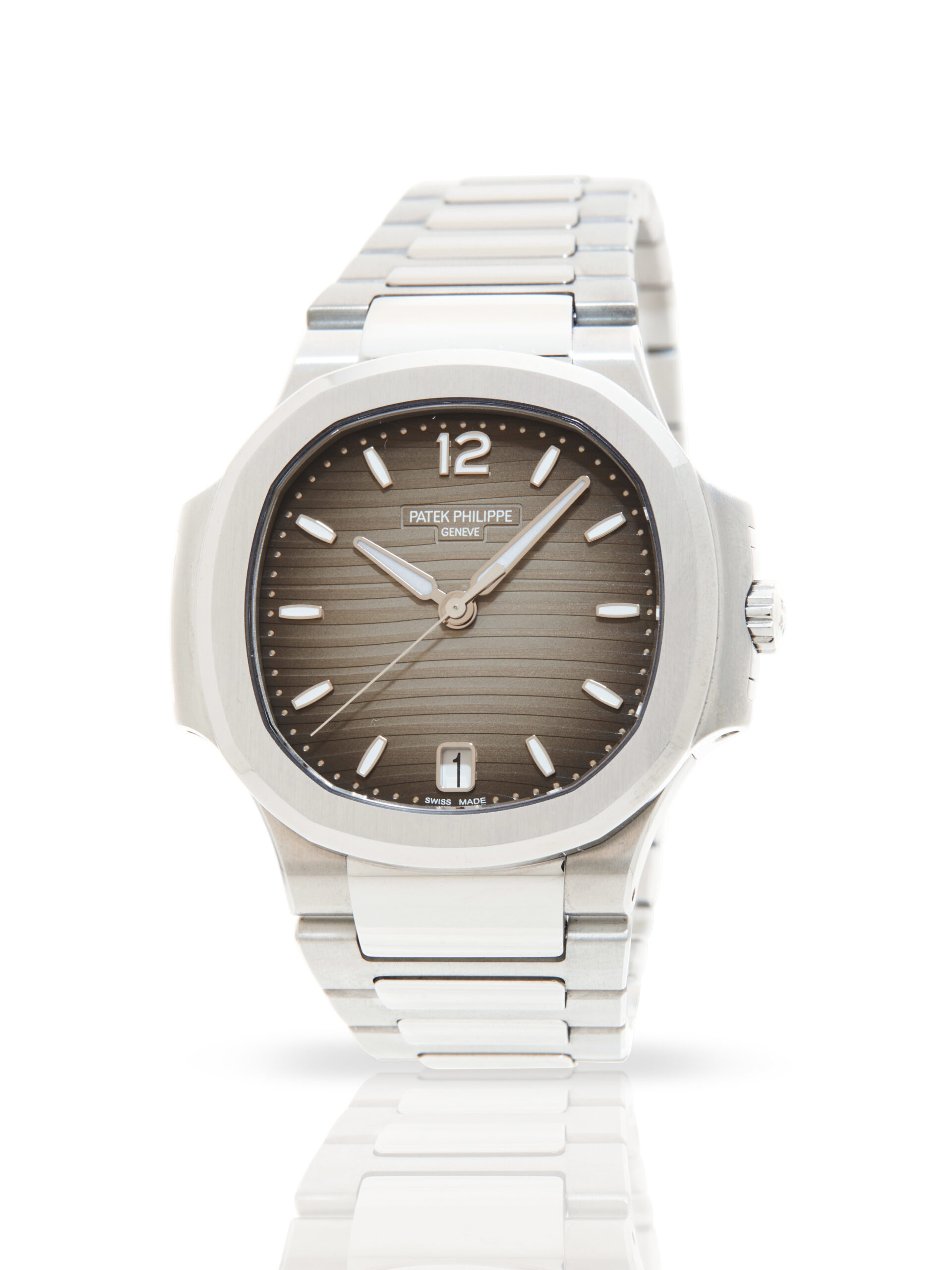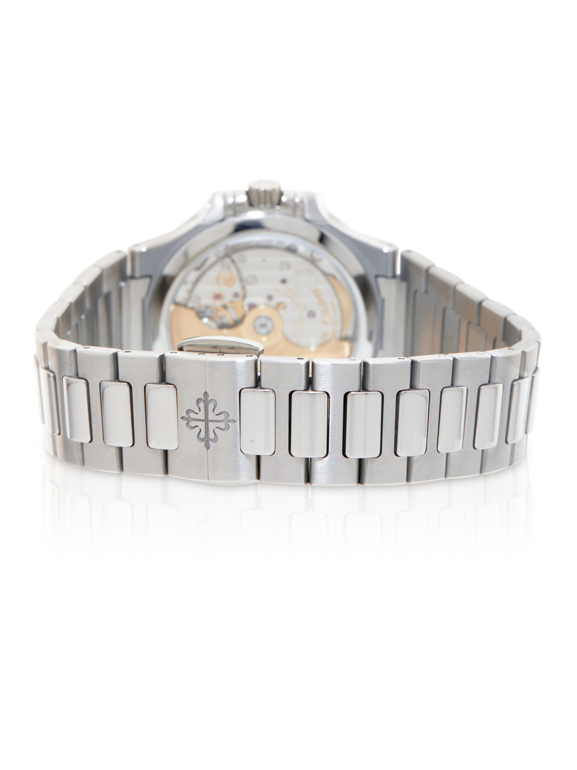 This Ladies’ automatic Nautilus reinterprets the iconic sports-elegant design with a refined 35.2mm diameter. The silvery white dial features applied gold numerals and markers with luminescent coating, ensuring legibility while maintaining the collection’s high-jewelry feel. The sapphire crystal case back reveals the automatic Caliber 26-330 S C movement, finished to the exacting standards of the Patek Philippe Seal.