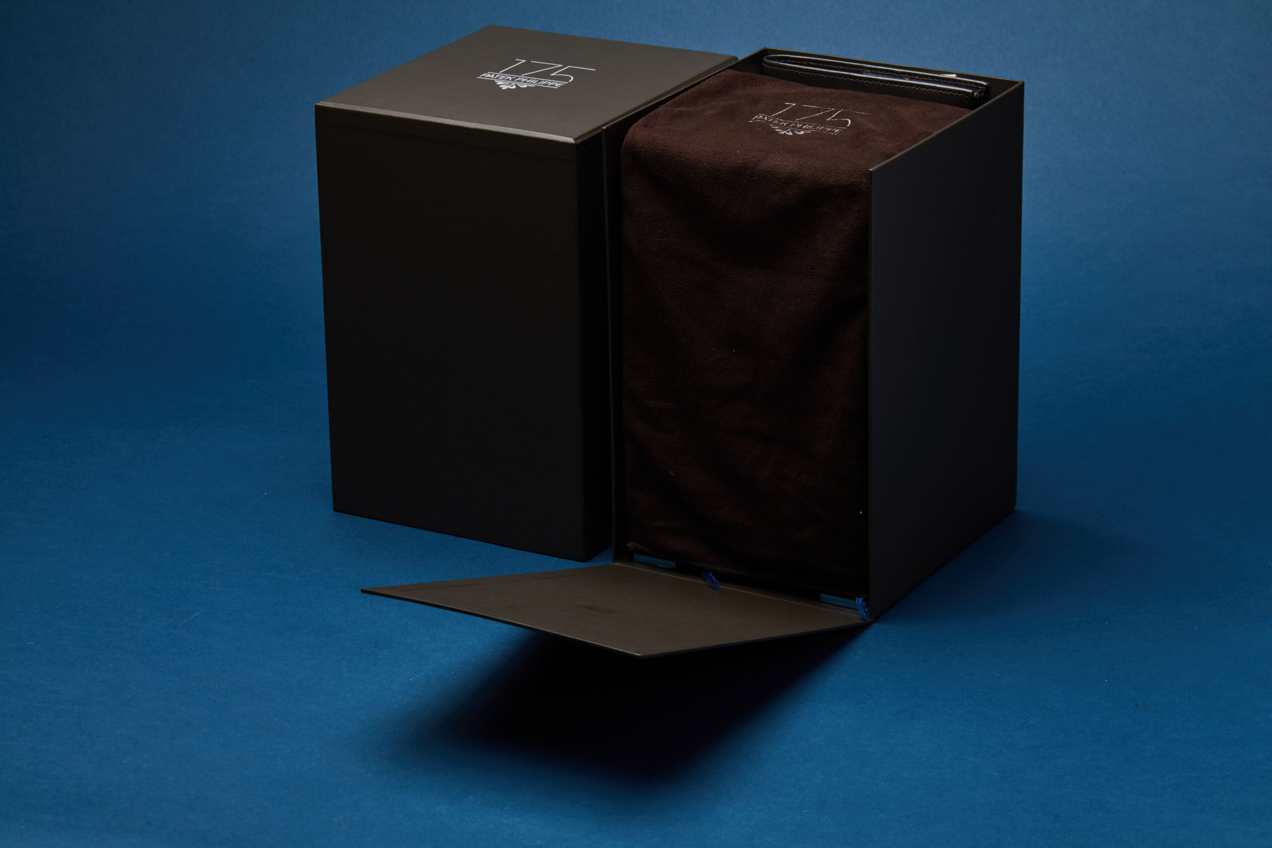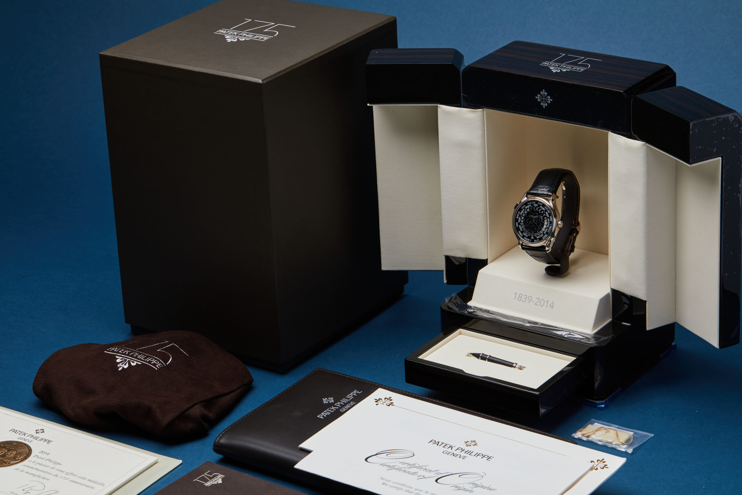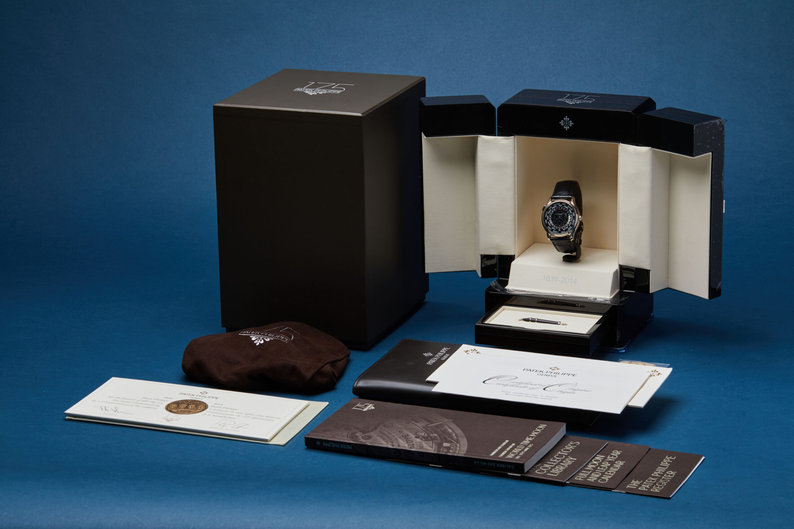 The watch is supplied with its outer box, unique 175th-anniversary presentation case, commemorative 175th-anniversary medal, warranty certificate, adjustment stylus, and various booklets including the World Time Moon manual.