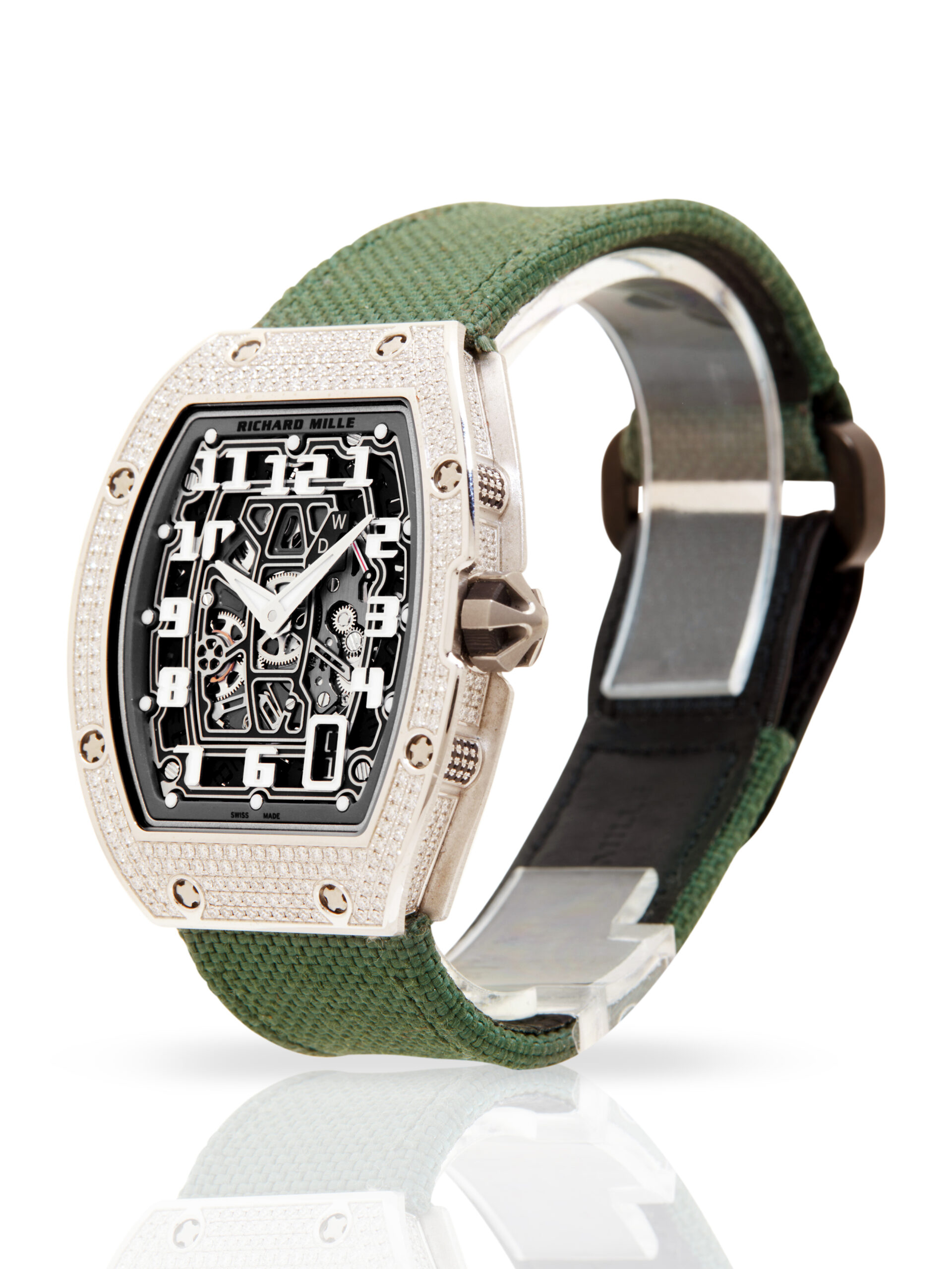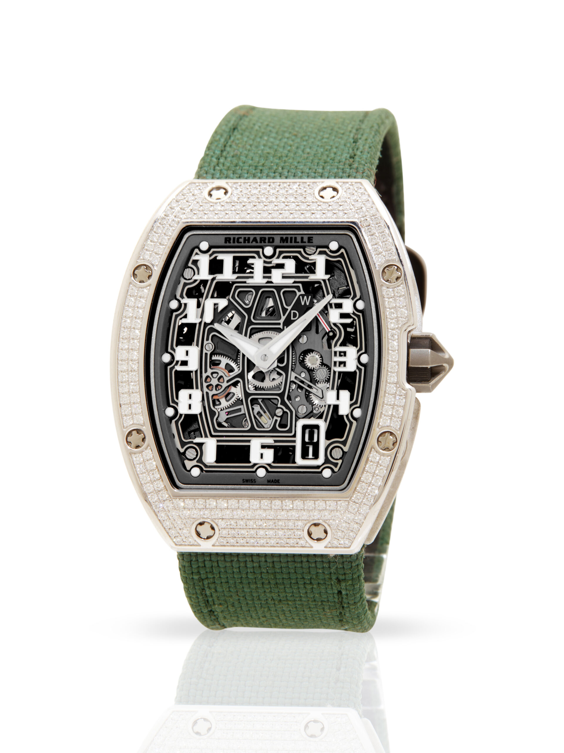 Presented in unworn condition is this outstanding example of a 2018 Richard Mille RM67-01 Extra Flat. The watch features a 38.7 x 47.5mm 18K White gold case with factory set diamonds, skeleton dial with luminescent Arabic numerals, date display and is coupled to a green textile strap with a velcro fastening. Having been professionally tested for condition and accuracy, it’s deemed to be running perfectly, ready for its new, lucky owner.