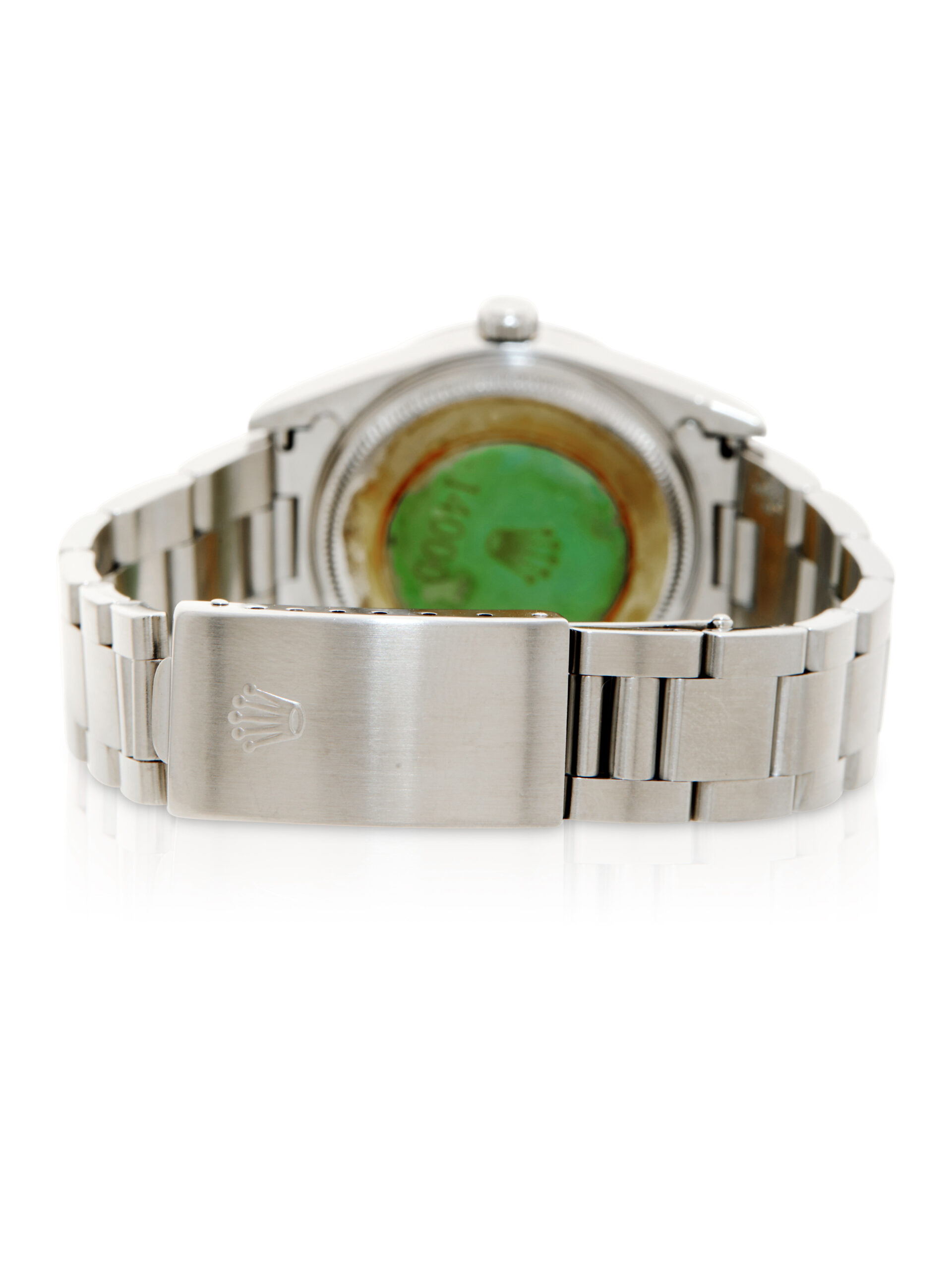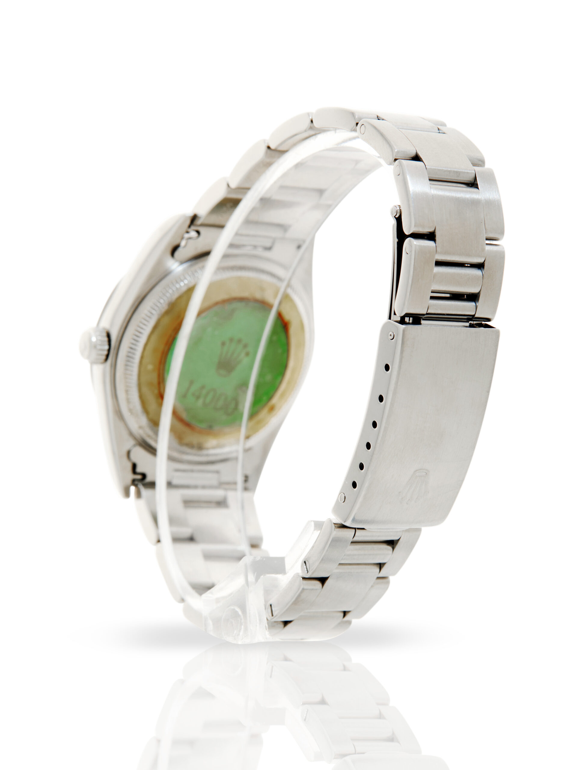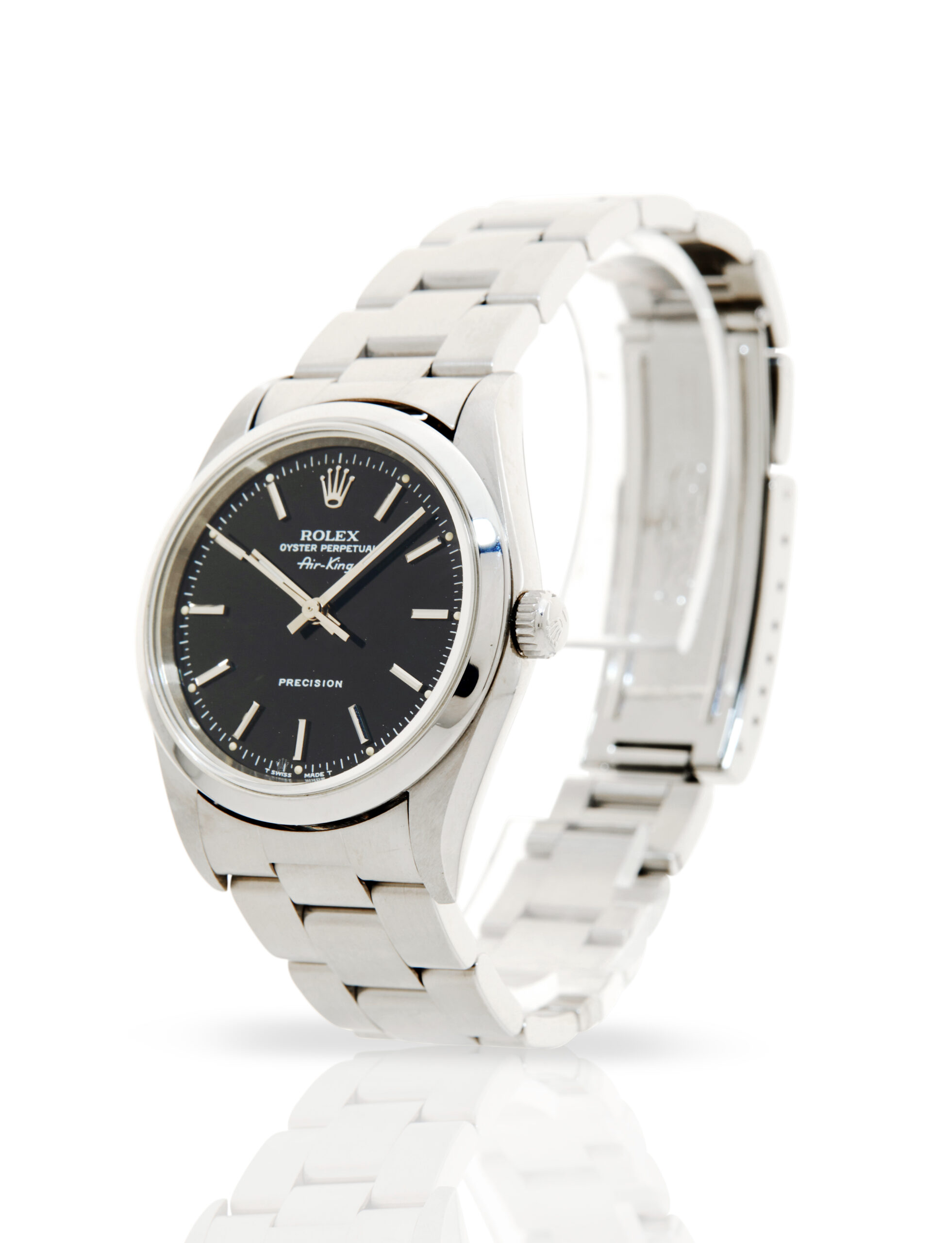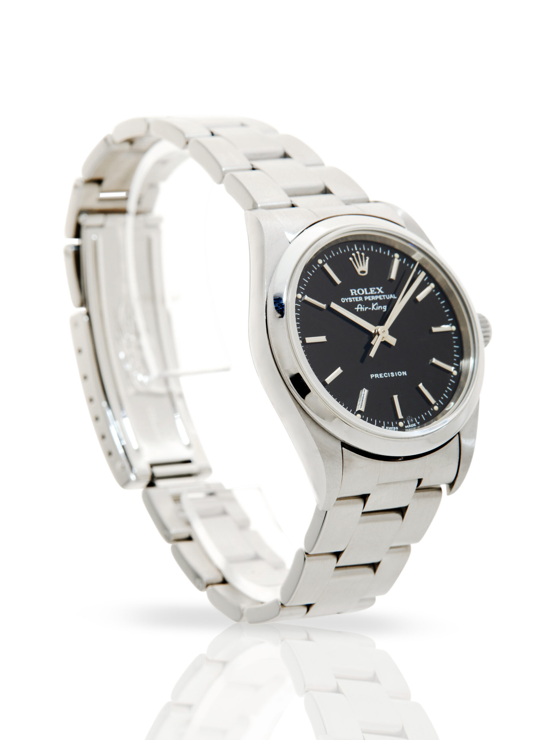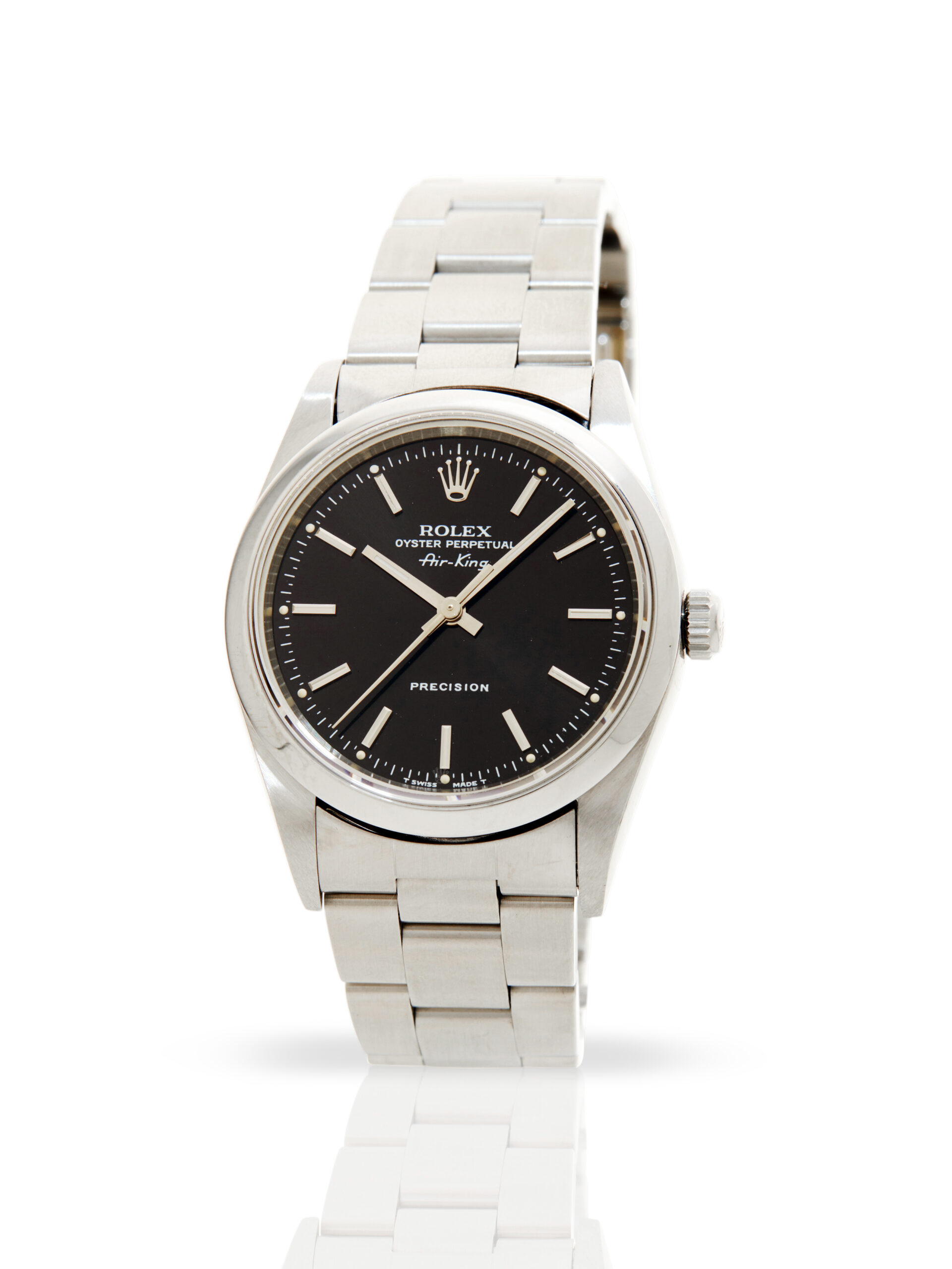 Presented in very good condition is this sophisticated example of a 1996 Rolex Air-King 14000. The watch features a 34mm stainless steel case, stainless steel bezel, black dial with baton indices and is coupled to a stainless steel Oyster bracelet. Having been professionally tested for condition and accuracy, it’s deemed to be running very well and is showing minor signs of wear.