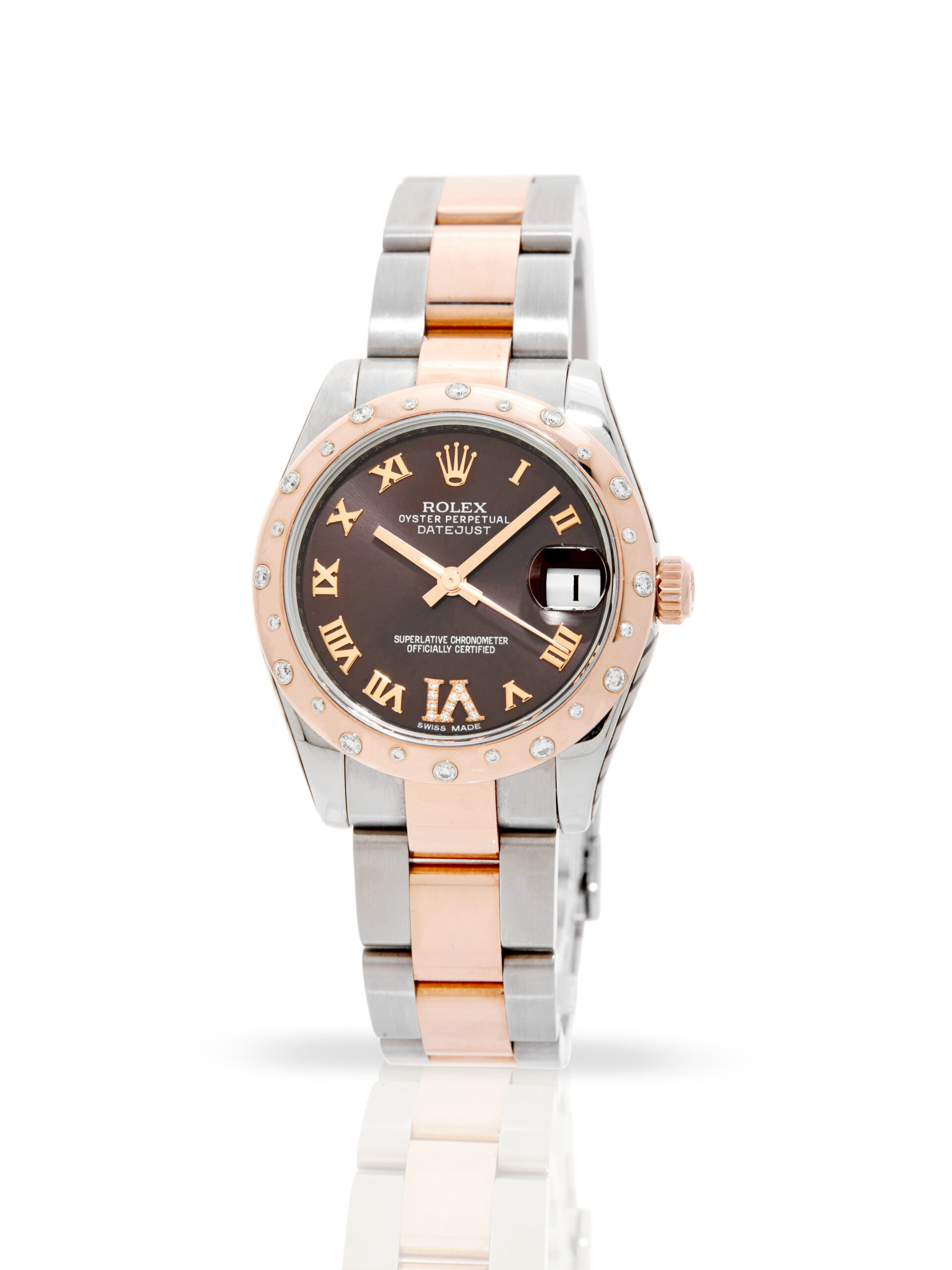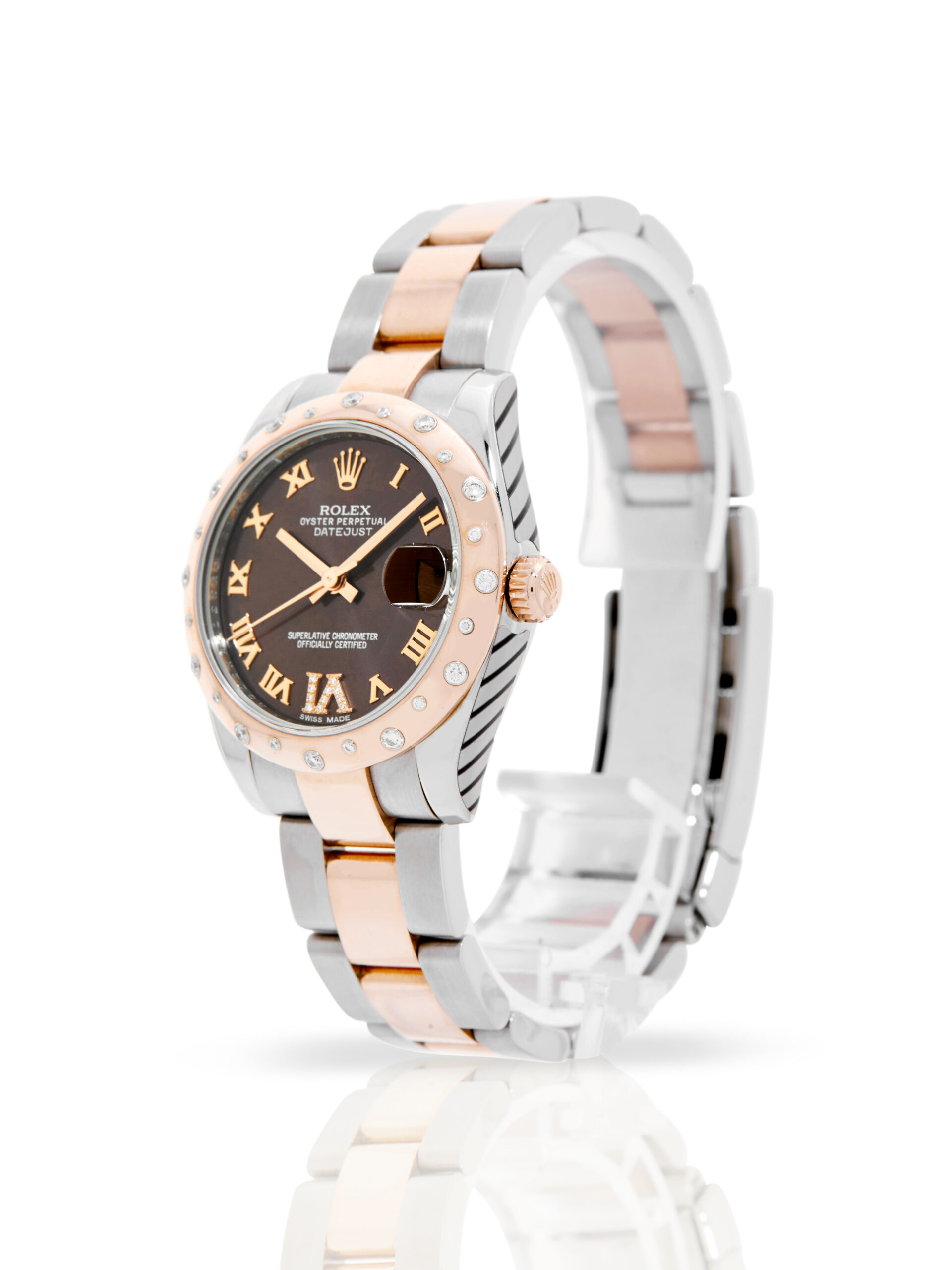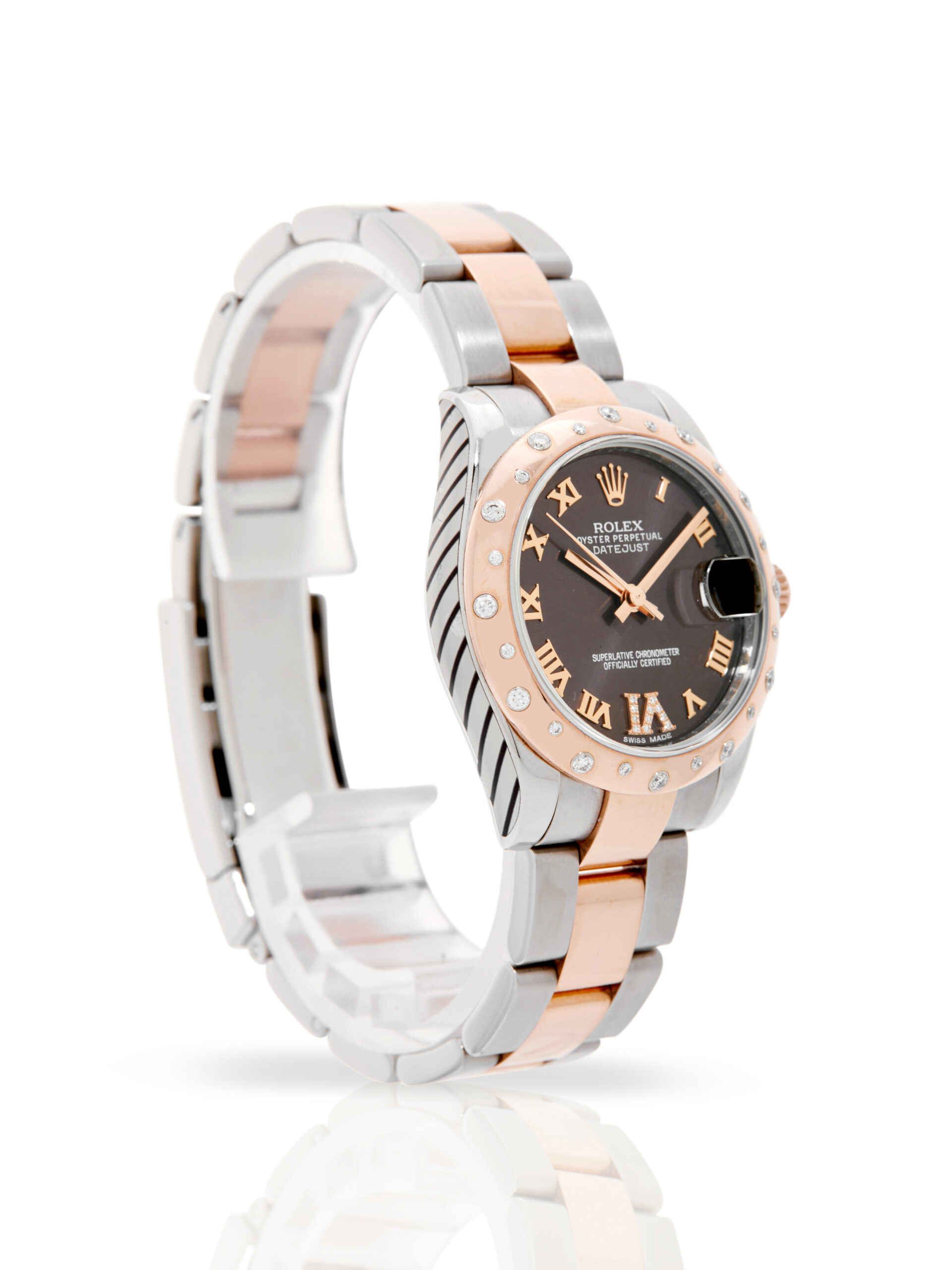 Presented in fantastic condition is this lovely example of a 2011 Rolex Datejust 31 178341. The watch features a 31mm stainless steel case, chocolate brown dial with Roman numerals (VI diamond set), 18K rose gold bezel with factory set diamonds and is coupled to a bi-metal Oyster bracelet with a folding clasp. Having been professionally tested for condition and accuracy, it’s deemed to be running very well and is showing only very minor signs of wear.