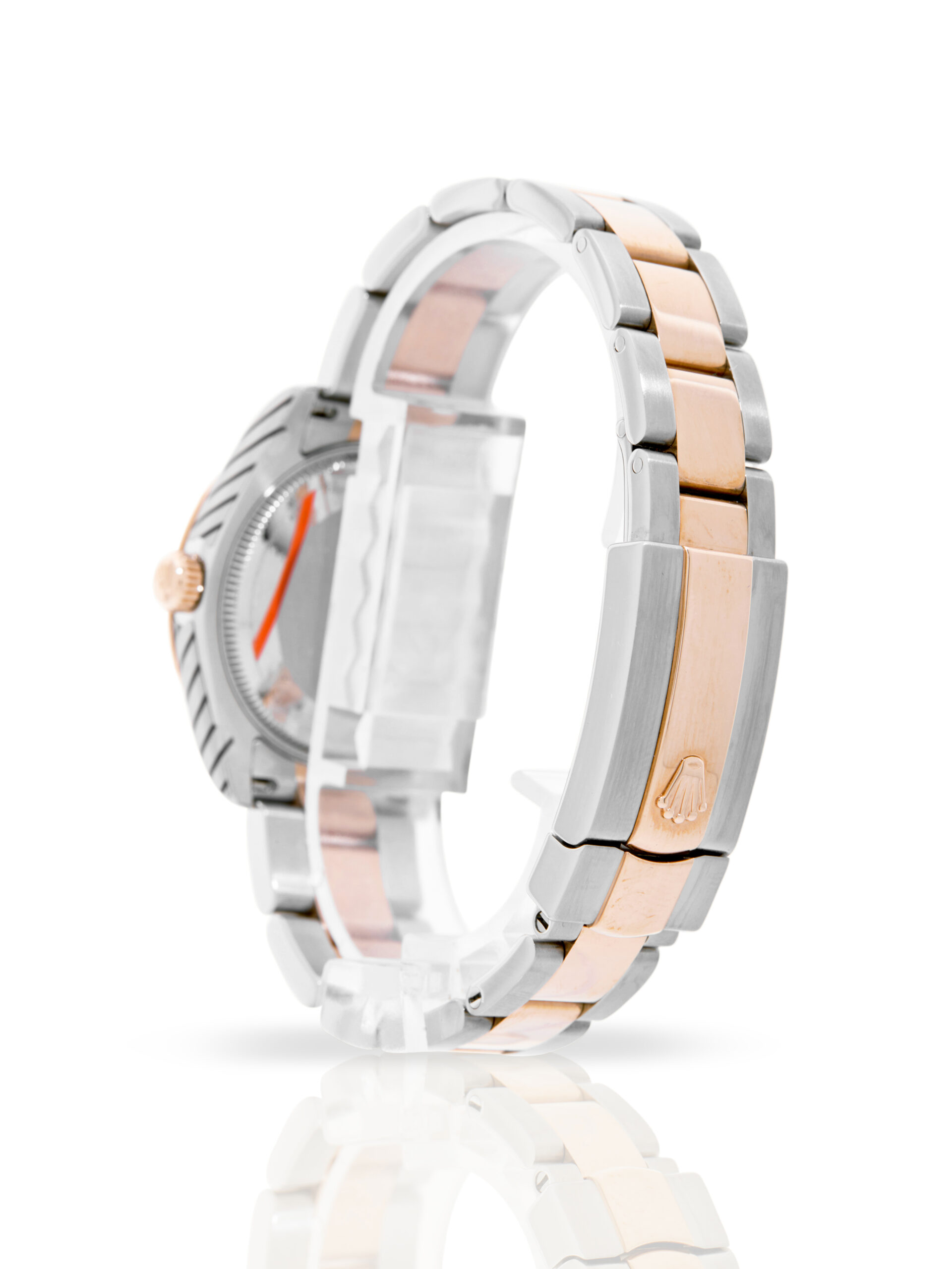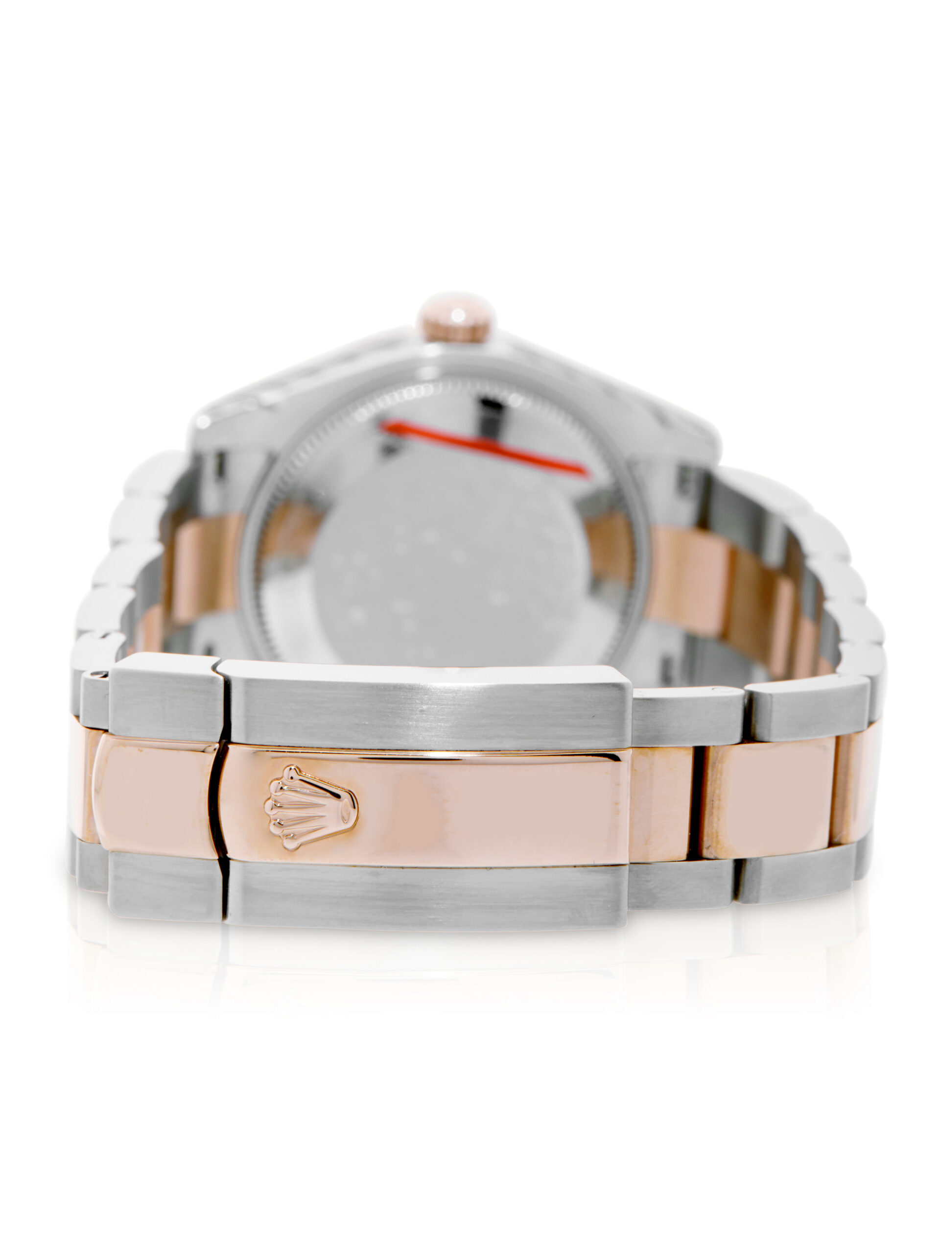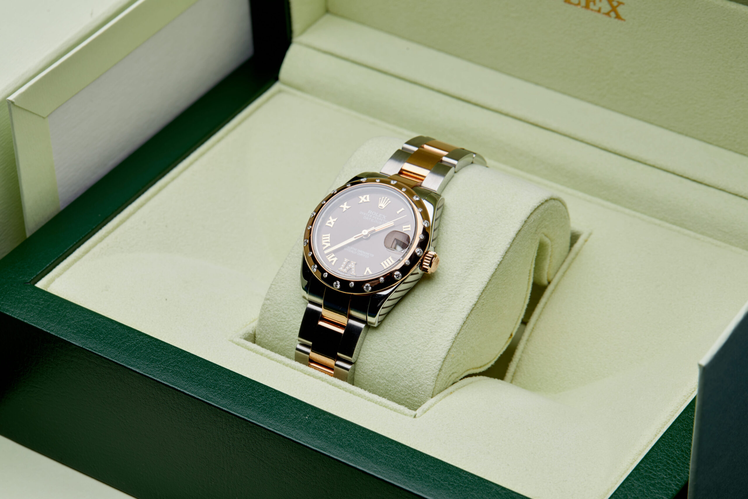 Presented in fantastic condition is this lovely example of a 2011 Rolex Datejust 31 178341. The watch features a 31mm stainless steel case, chocolate brown dial with Roman numerals (VI diamond set), 18K rose gold bezel with factory set diamonds and is coupled to a bi-metal Oyster bracelet with a folding clasp. Having been professionally tested for condition and accuracy, it’s deemed to be running very well and is showing only very minor signs of wear.