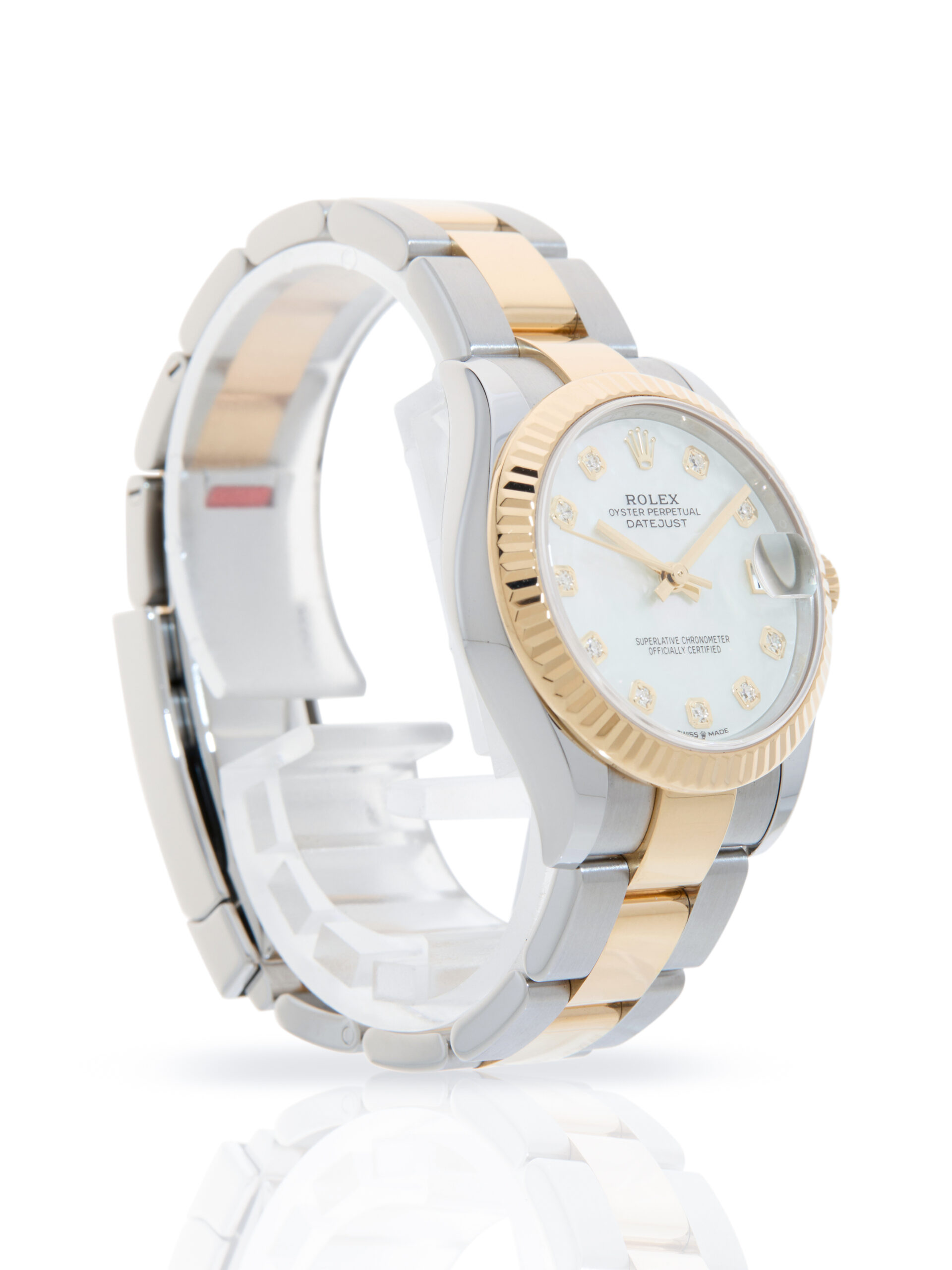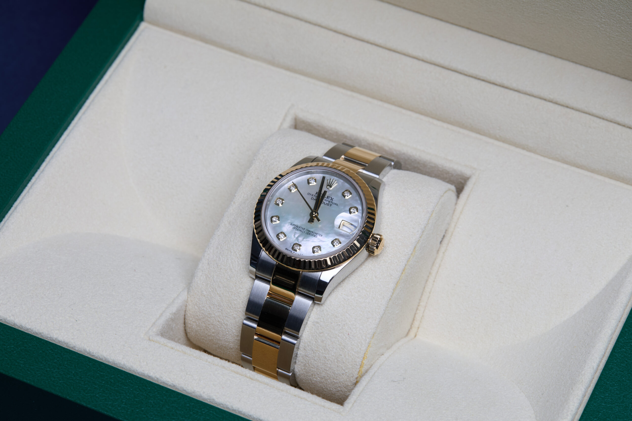 Presented in excellent condition is this lovely example of a 2021 Rolex Datejust 31 278273. The watch features a 31mm stainless steel case, mother-of-pearl dial with diamond hour markers, 18K yellow gold fluted bezel and is coupled to a bi-metal Oyster bracelet. Having been professionally tested for condition and accuracy, it’s deemed to be running perfectly and is showing only very limited signs of wear.