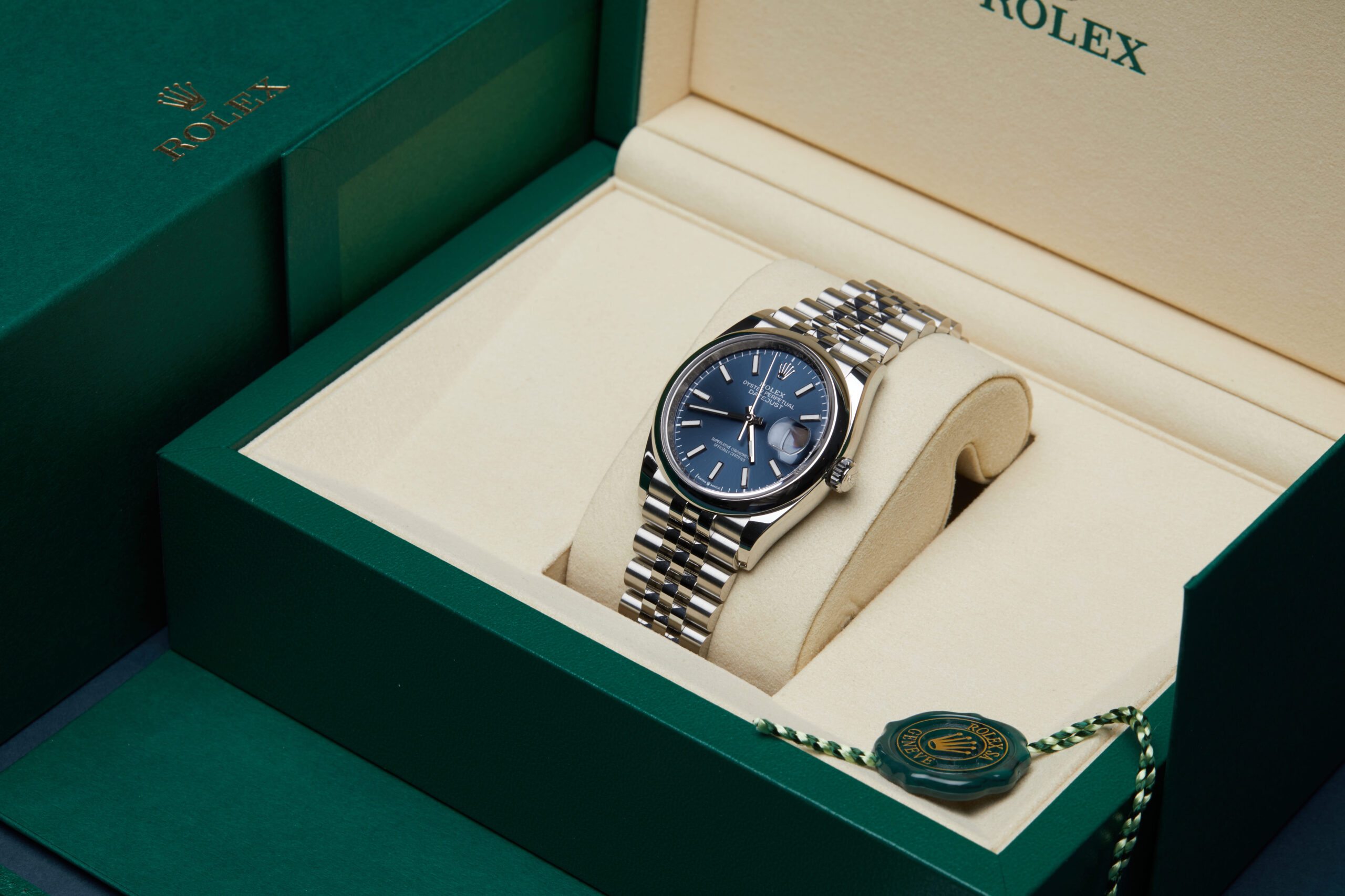 The watch is supplied with its original Rolex box, green leather wallet, manuals, 2x swing tags and warranty card dated Q2 2025.
