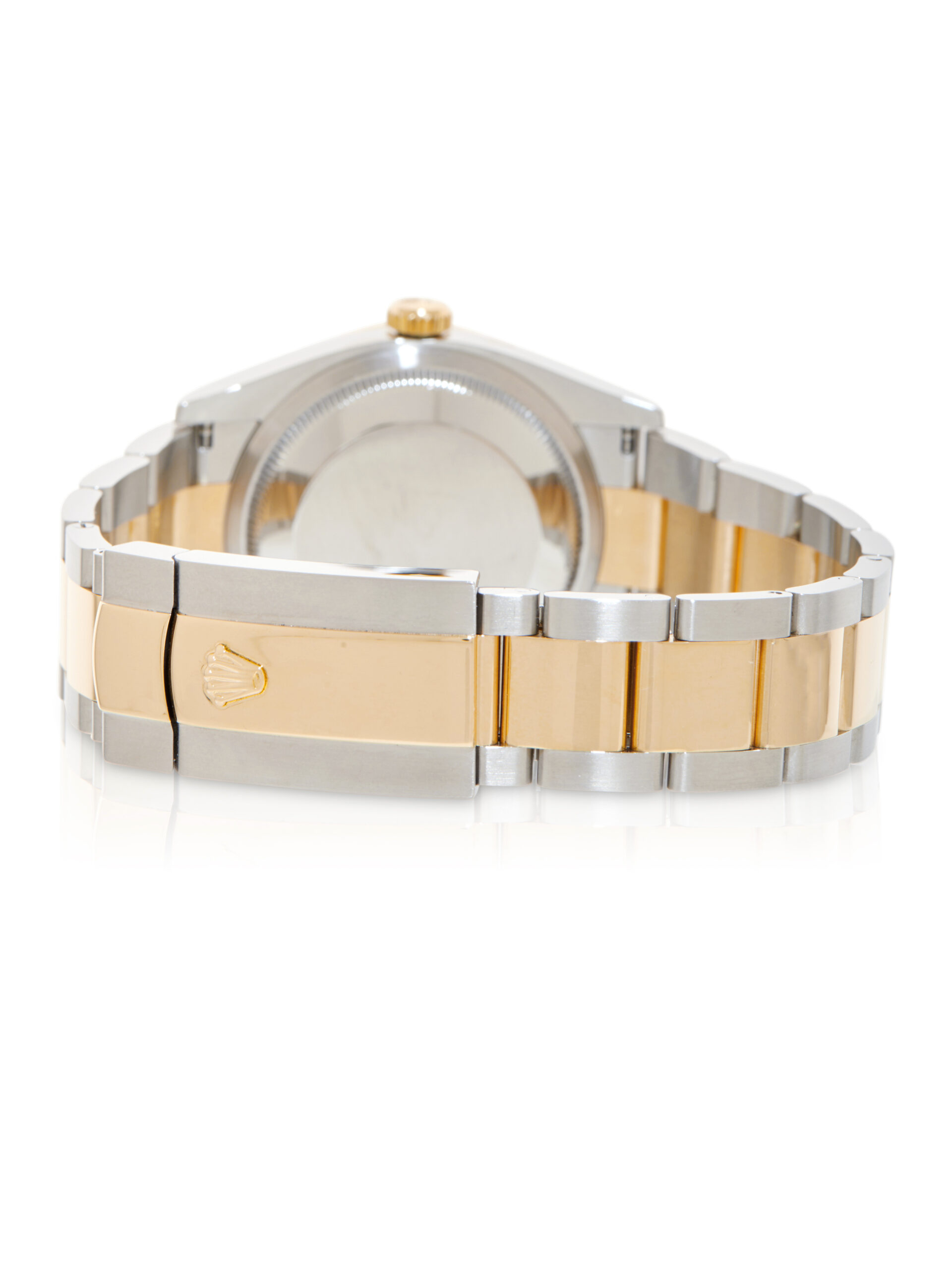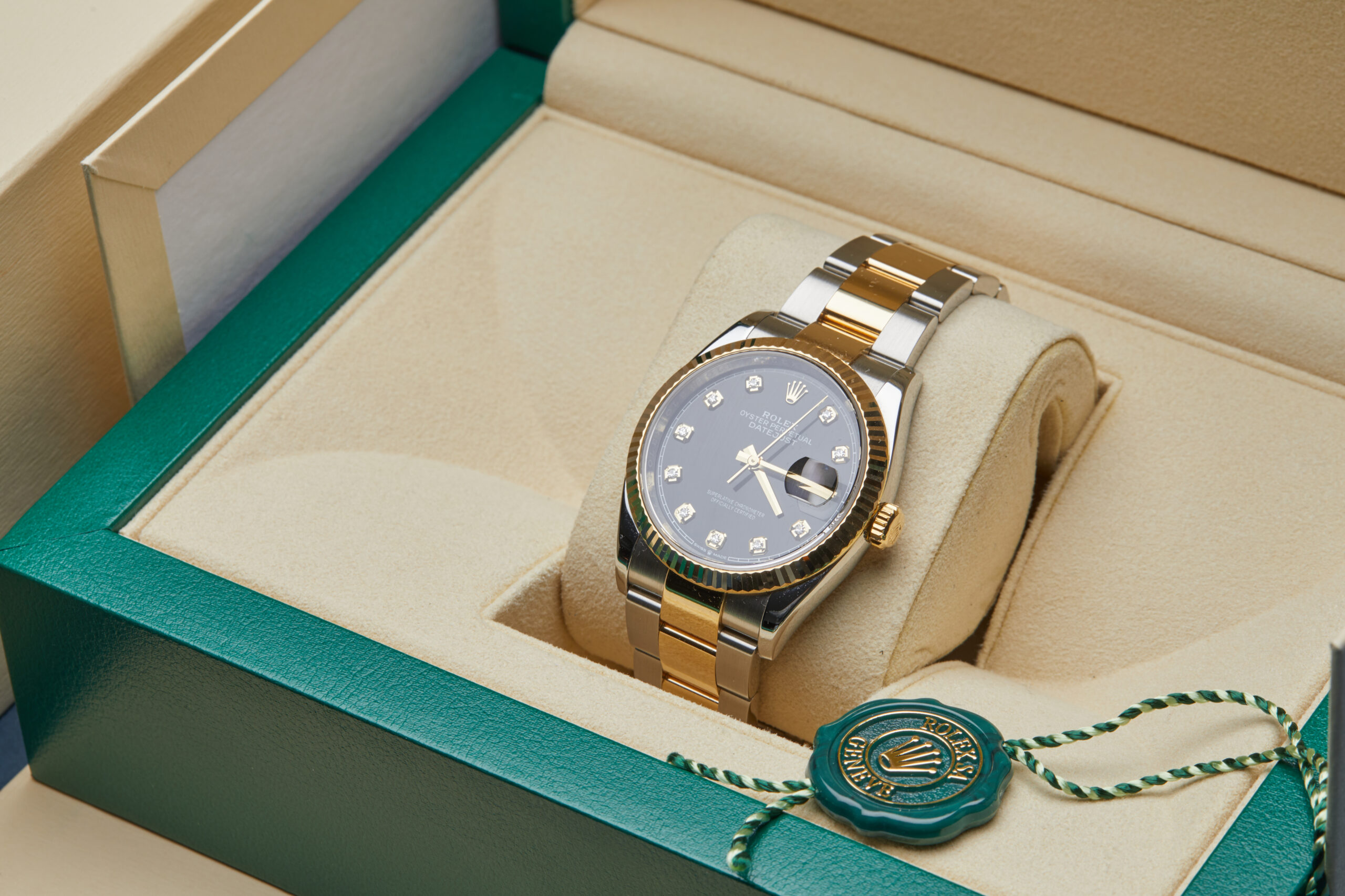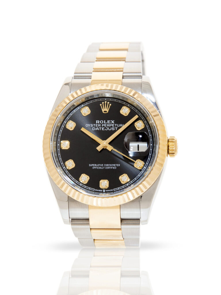 Presented in fantastic condition is this beautiful example of a 2019 Rolex Datejust 36 126233. The watch features a 36mm stainless steel case, 18K yellow gold fluted bezel, black dial with factory diamond hour markers and is coupled to a bi-metal Oyster bracelet with a folding clasp. Having been professionally tested for condition and accuracy, it’s deemed to be running perfectly and is showing only very minor signs of wear.