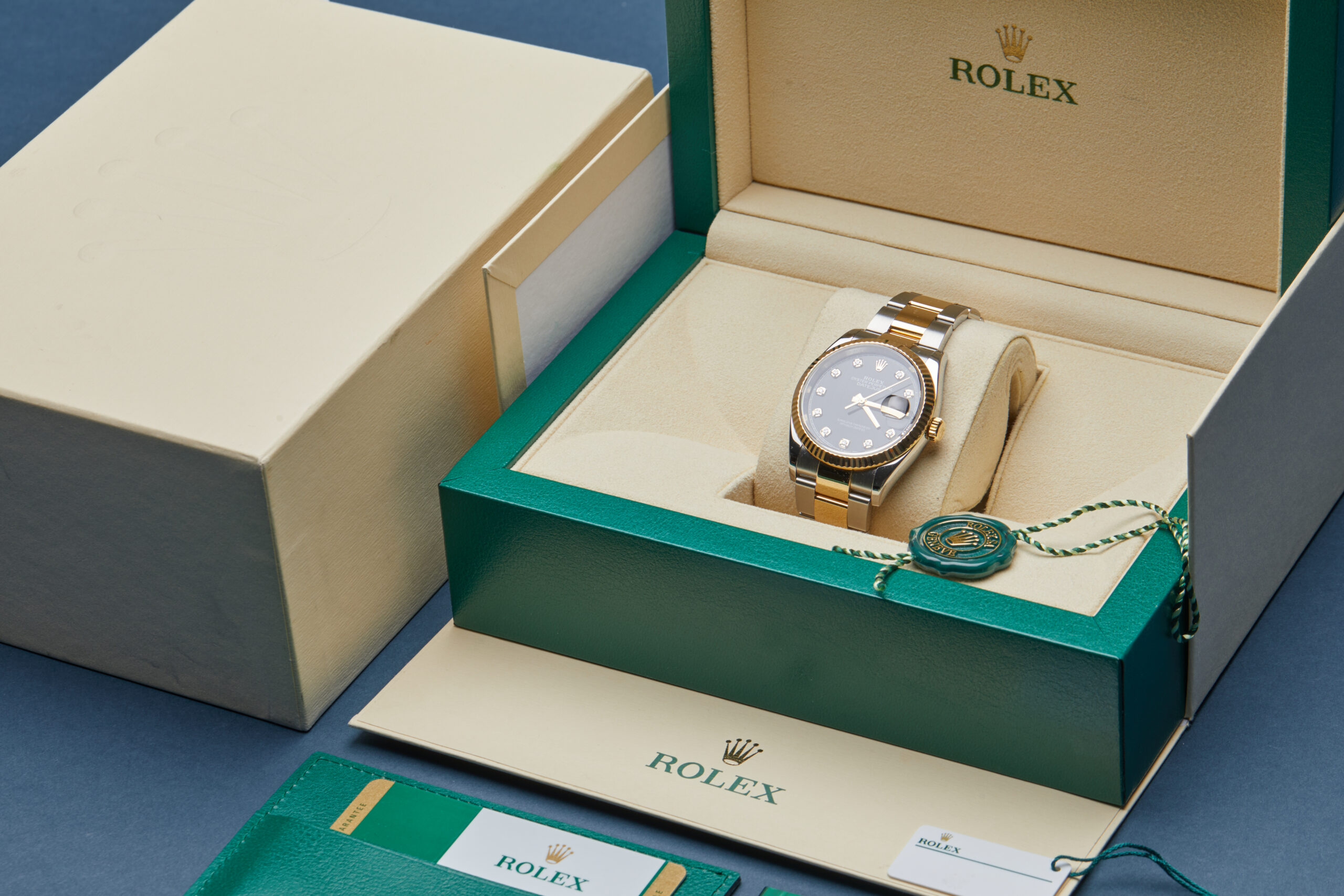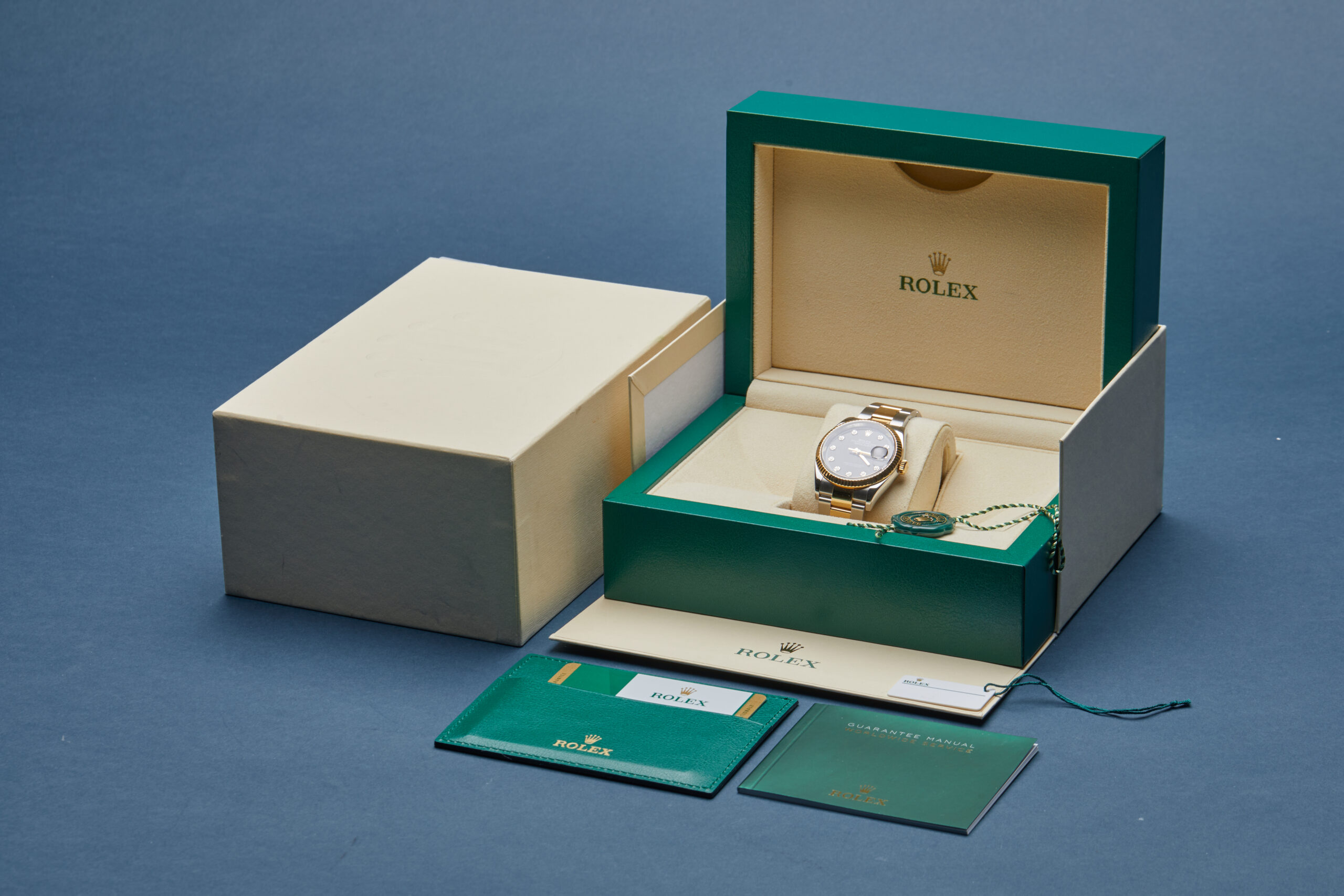 The watch is supplied with its original Rolex box, green leather wallet, 2x swing tags and warranty card dated Q2 2019 (UK supplied).