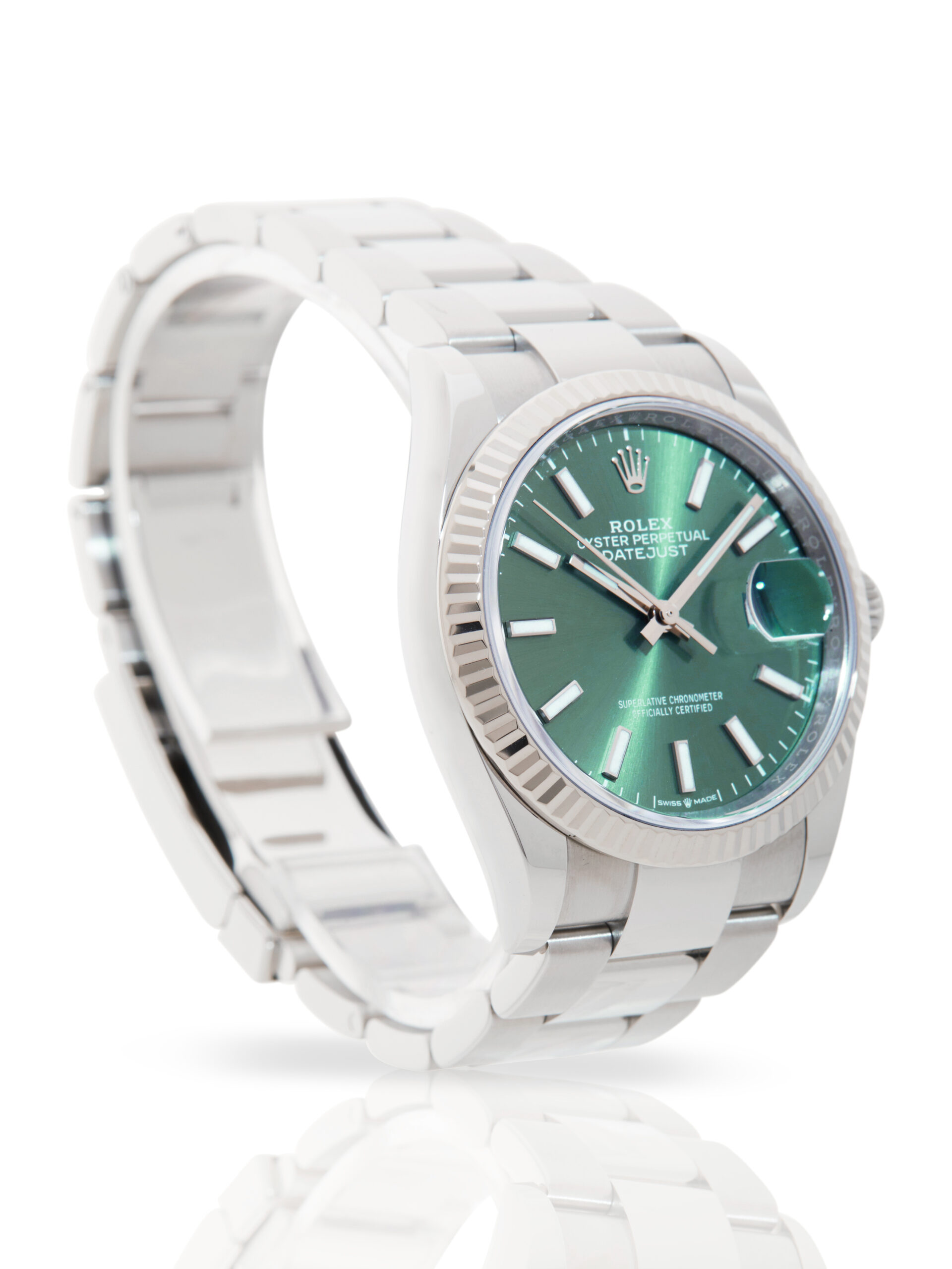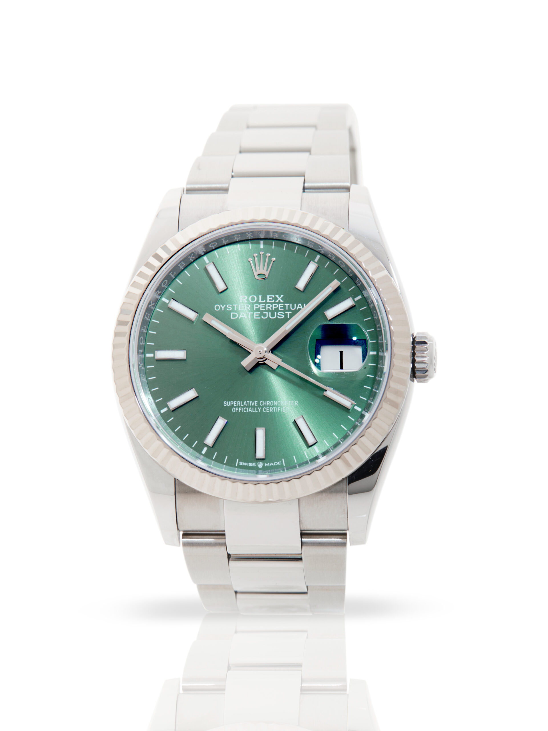 Presented in excellent condition is this beautiful example of a 2022 Rolex Datejust 36 126234. The watch features a 36mm stainless steel case, green palm motif with white hour markers, 18K white gold fluted bezel and is coupled to a stainless steel Oyster bracelet. Having been professionally tested for condition and accuracy, it’s deemed to be running perfectly and is showing only very limited signs of wear.