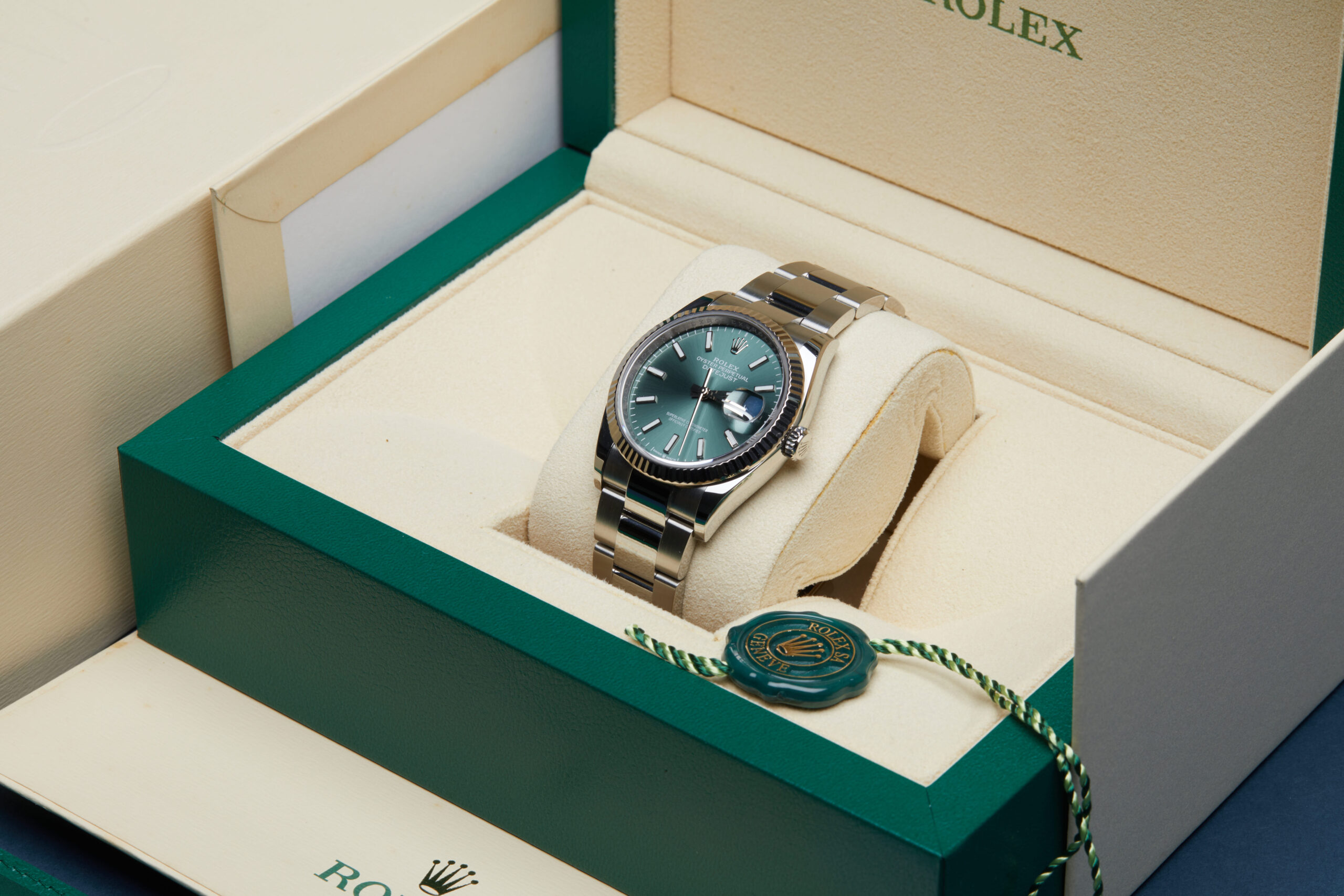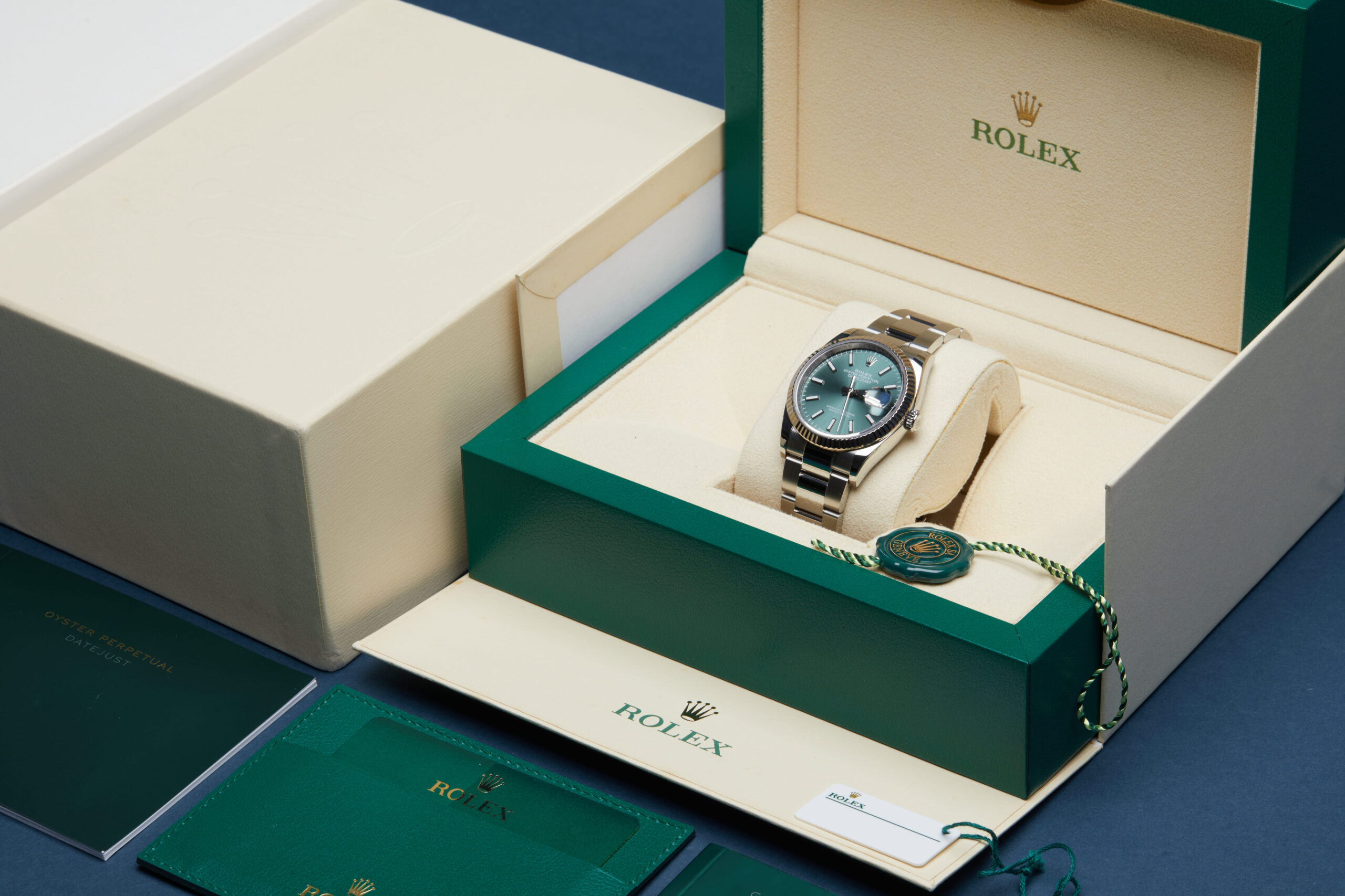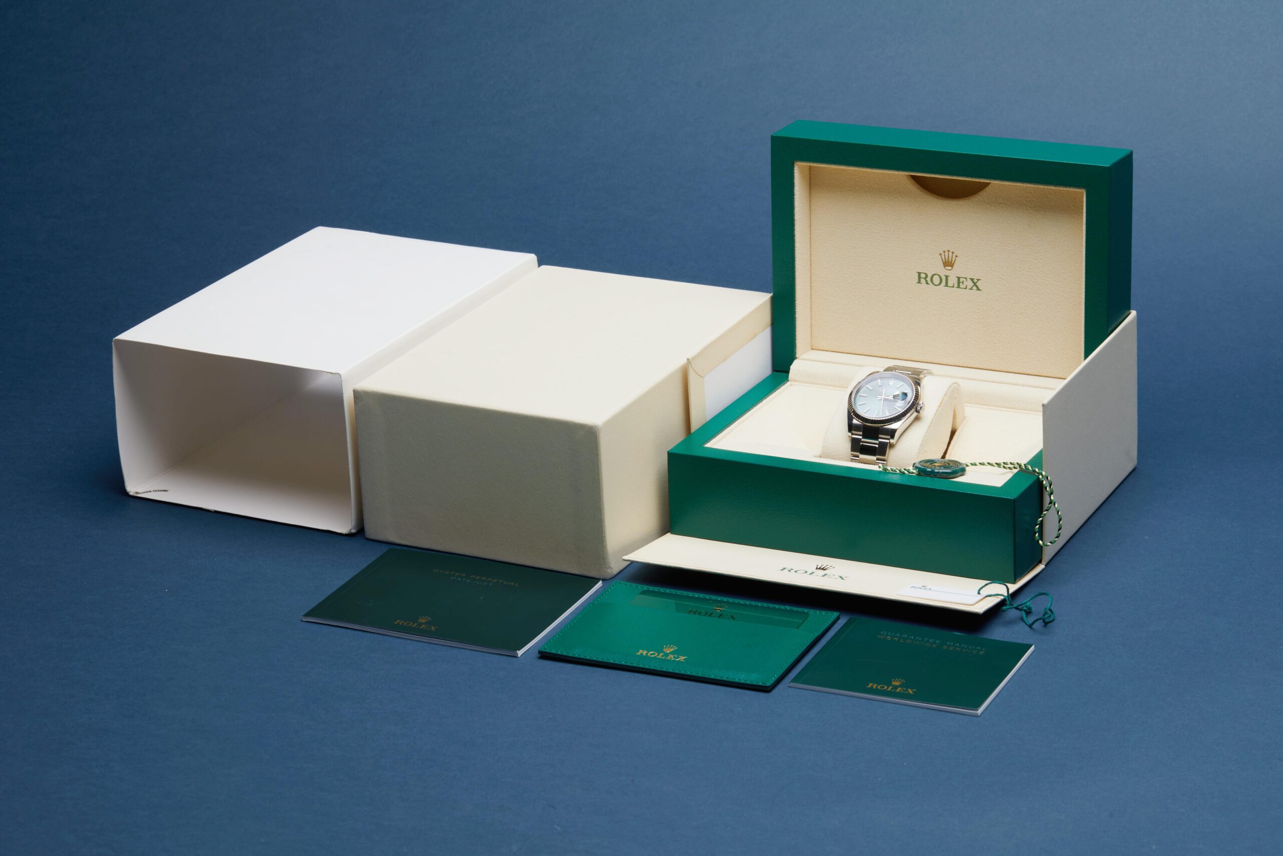 The watch is supplied with its original Rolex box, green leather wallet, manuals, 2x swing tags and warranty card dated Q3 2022