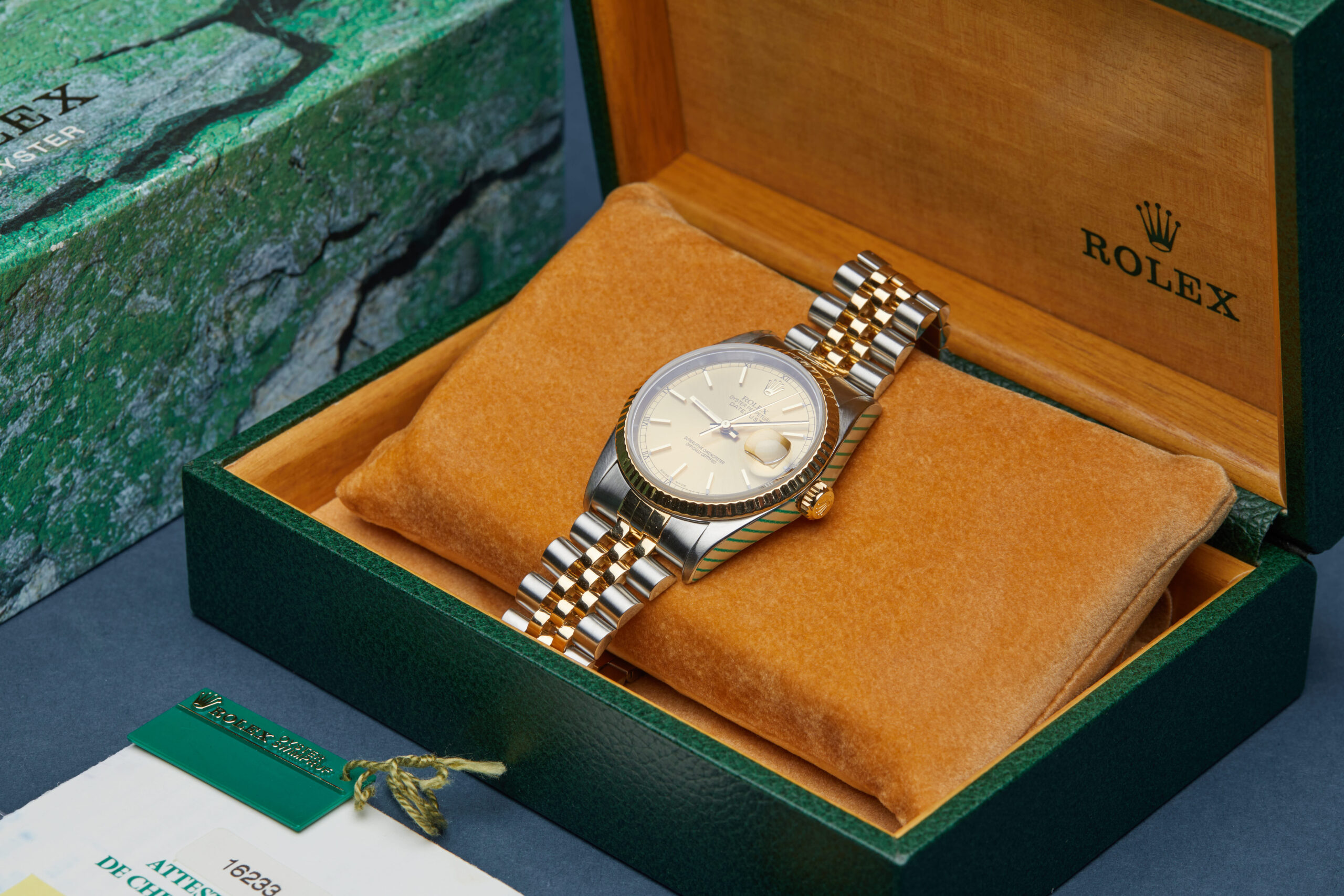 The watch is supplied with its original Rolex box, 2x swing tags, 2x service certificates and warranty certificate dated Q4 1999.