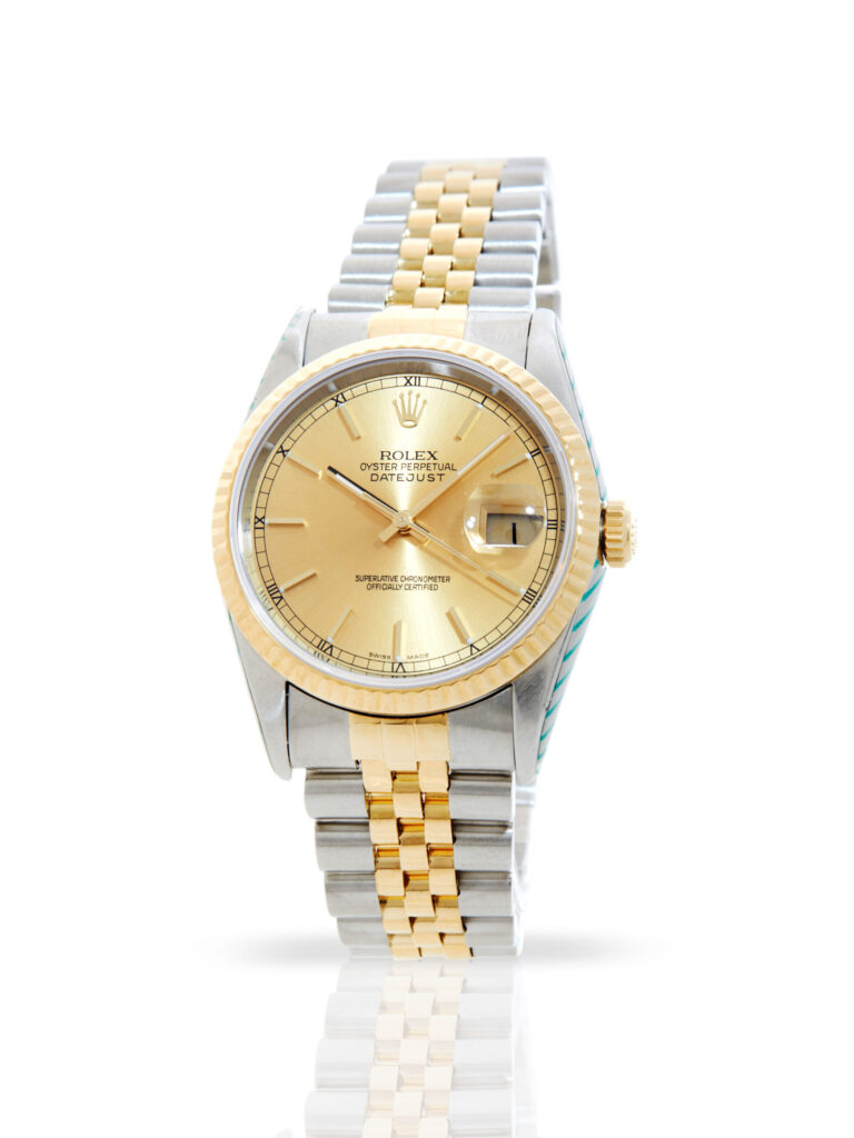 Presented in fantastic condition is this stunning example of a 1999 Rolex Datejust 36 16233. The watch features a 36mm stainless steel case, champagne dial with a date display, 18K yellow gold fluted bezel and is coupled to a bi-metal Jubilee bracelet with a folding clasp. Having been professionally tested for condition and accuracy, it’s deemed to be running very well and is showing only minor signs of wear.