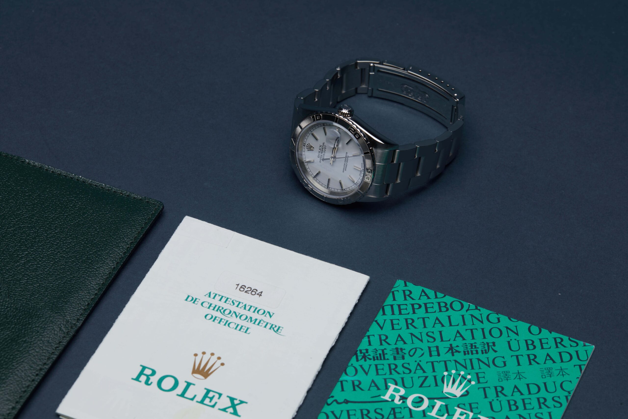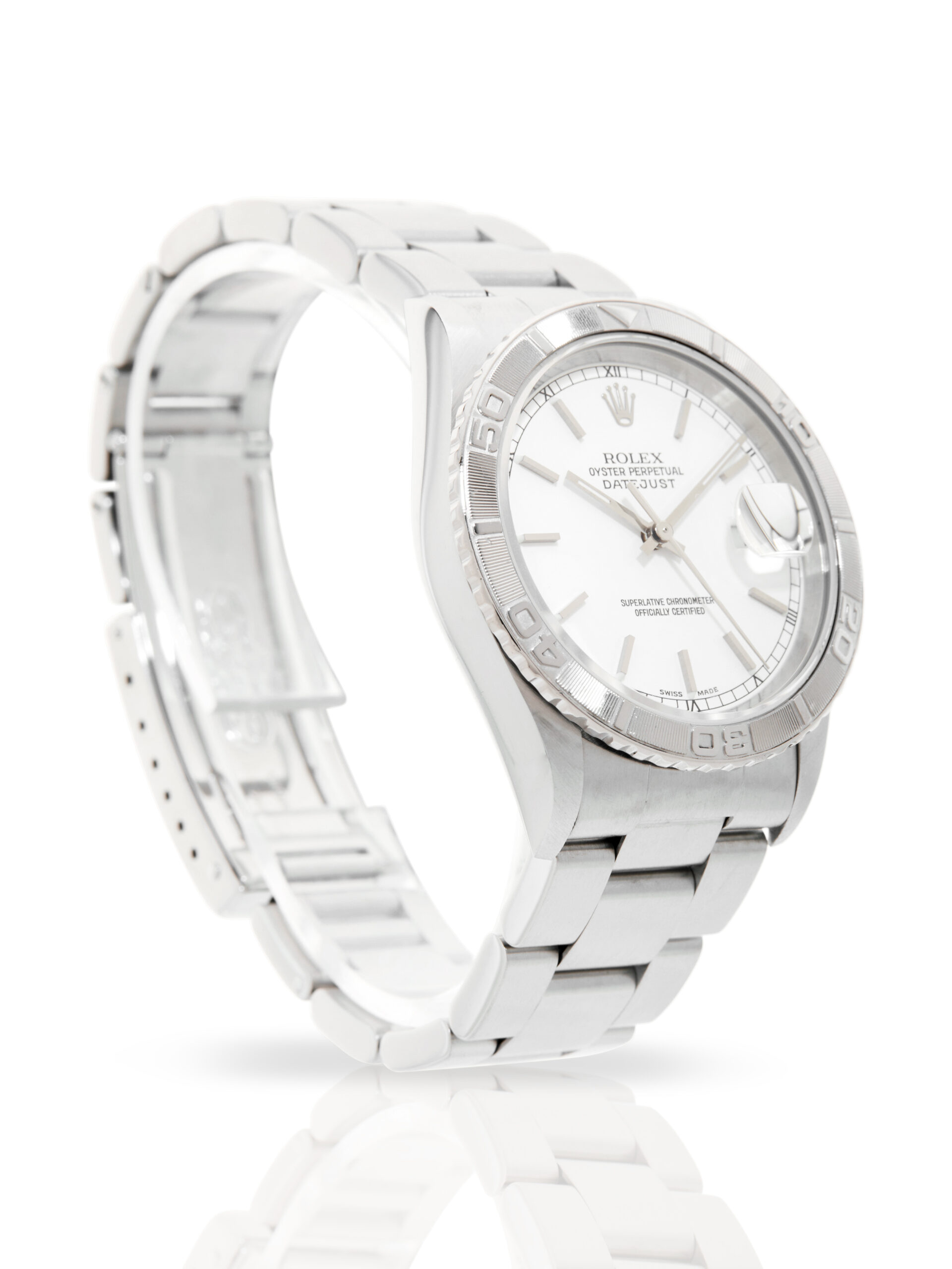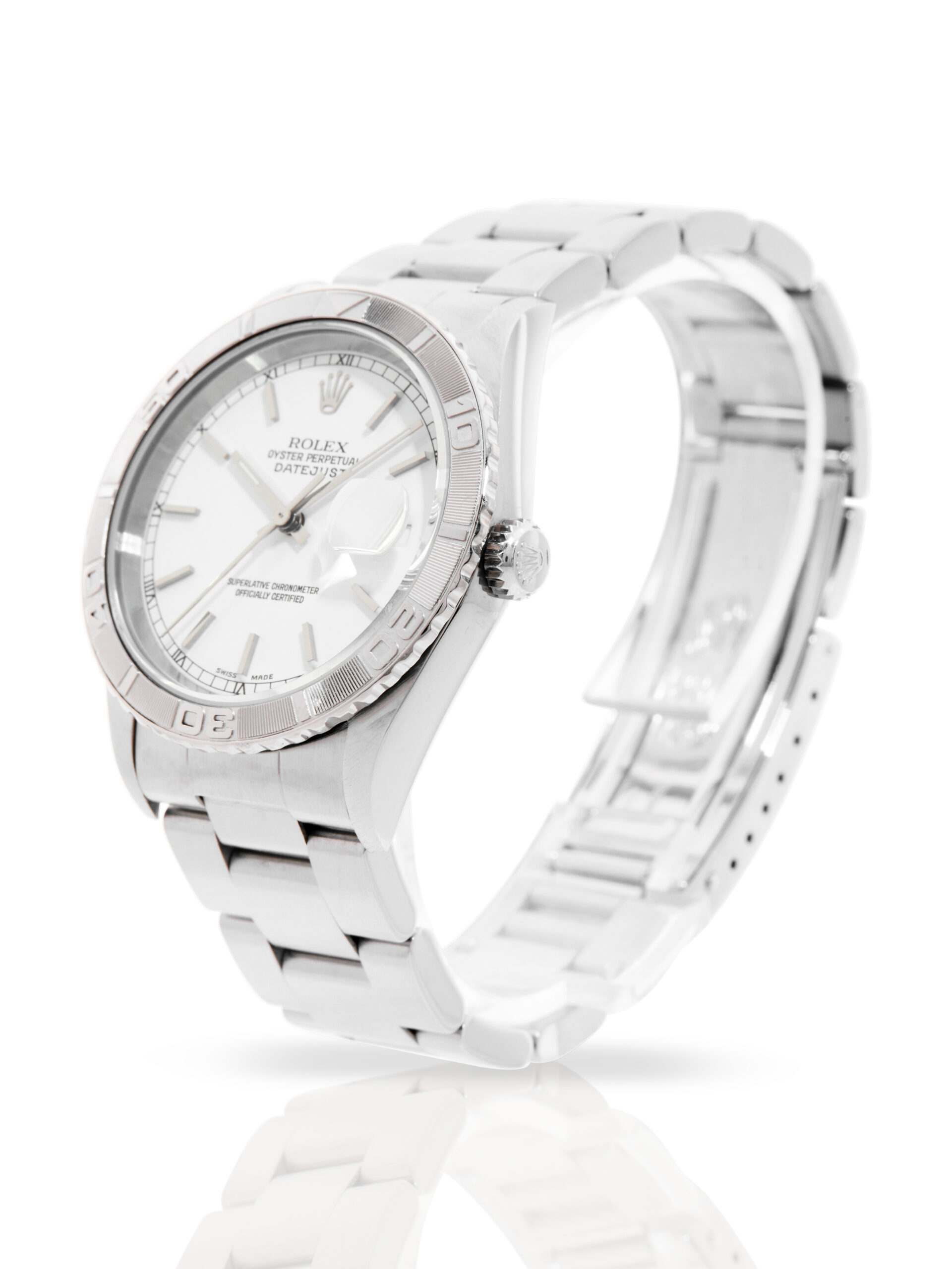 Presented in fantastic condition is this stunning example of a 2002 Rolex Datejust 36 16264 ‘Turn-O-Graph’. The watch features a 36mm stainless steel case, white baton dial with date display, engine turned bezel and is coupled to a stainless steel Oyster bracelet. Having been professionally tested for condition and accuracy, it’s deemed to be running very well and is showing only minor signs of wear.