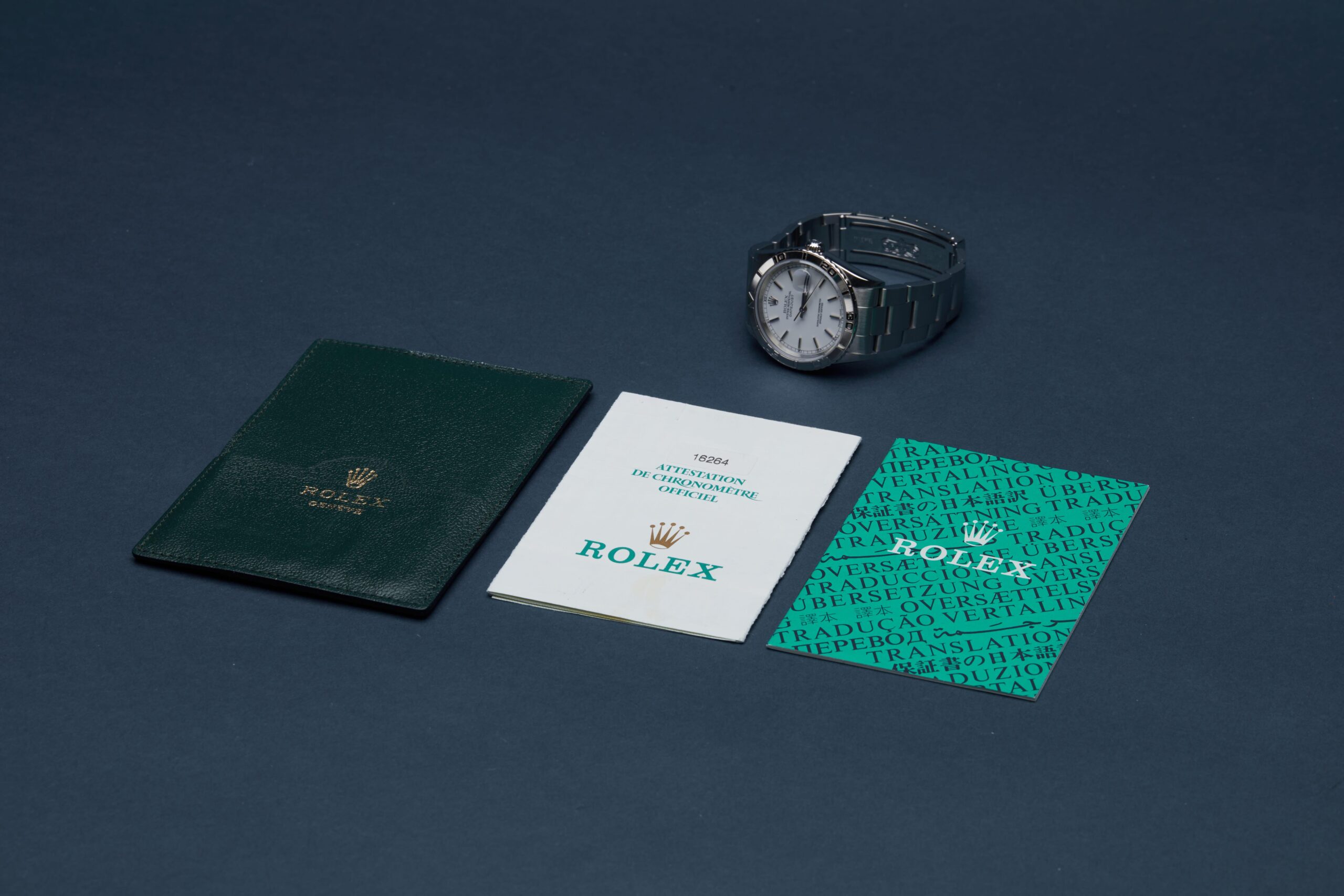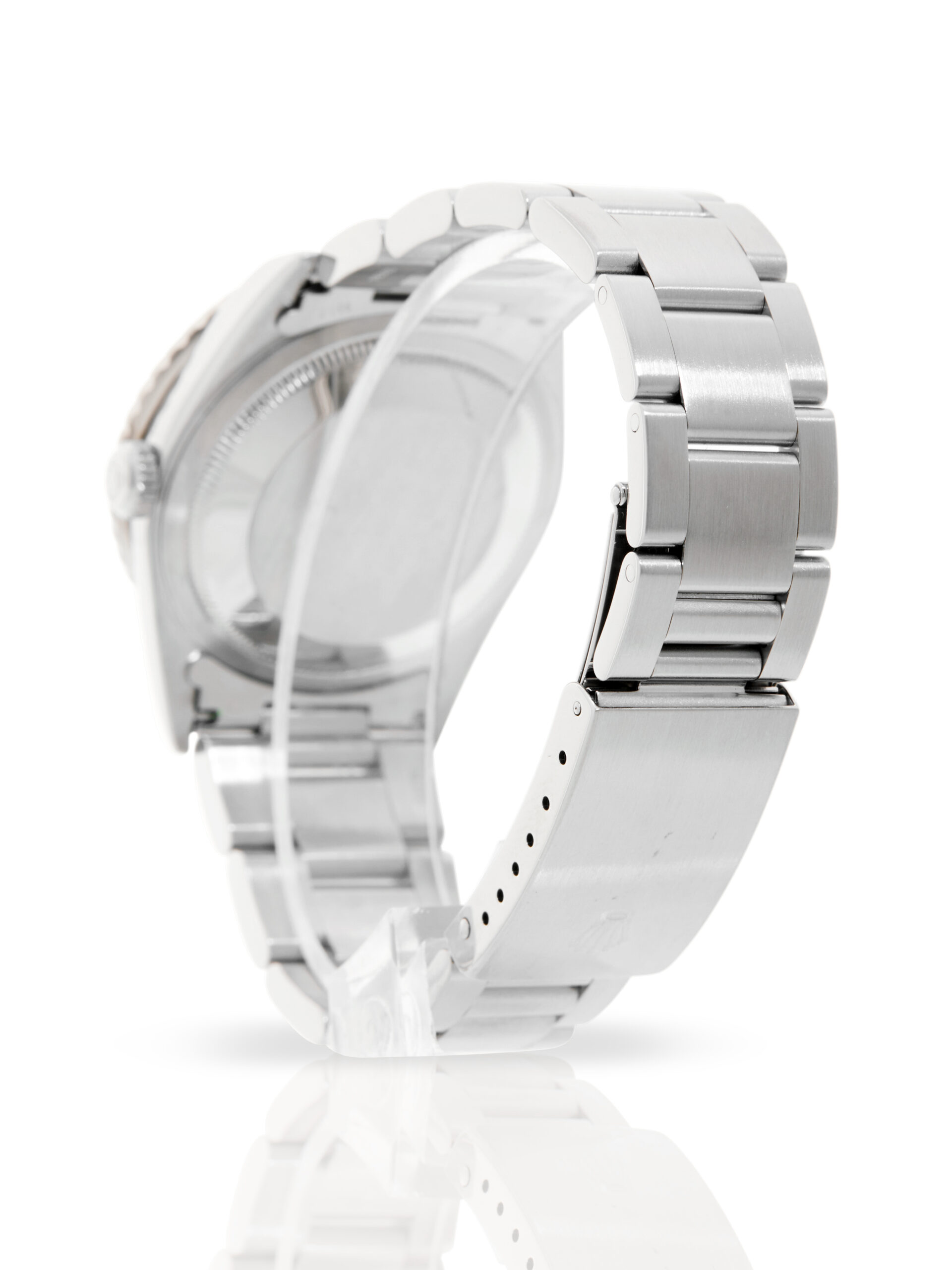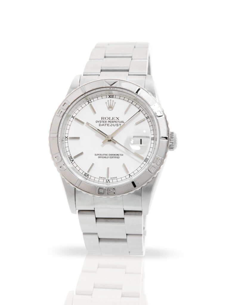 Presented in fantastic condition is this stunning example of a 2002 Rolex Datejust 36 16264 ‘Turn-O-Graph’. The watch features a 36mm stainless steel case, white baton dial with date display, engine turned bezel and is coupled to a stainless steel Oyster bracelet. Having been professionally tested for condition and accuracy, it’s deemed to be running very well and is showing only minor signs of wear.