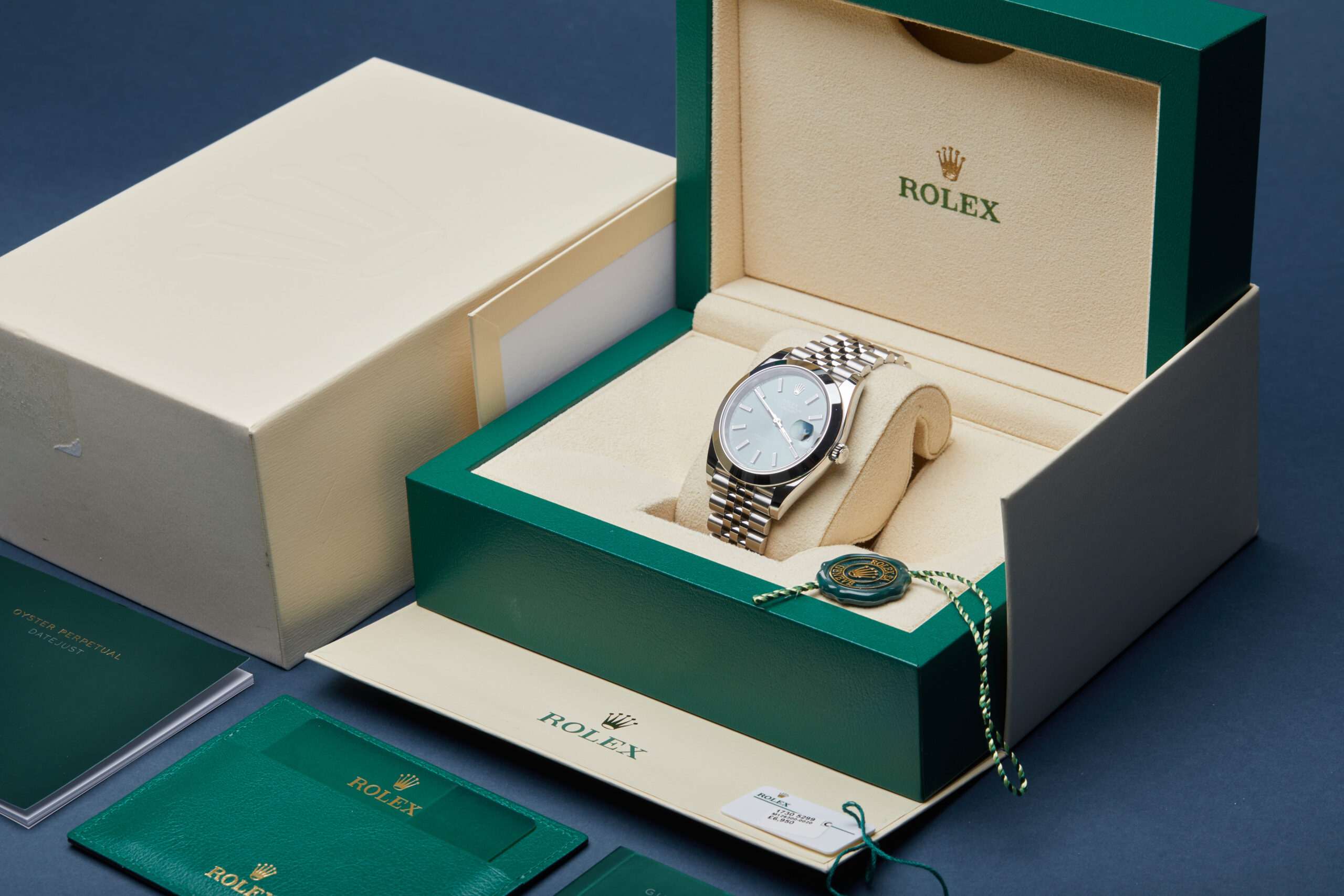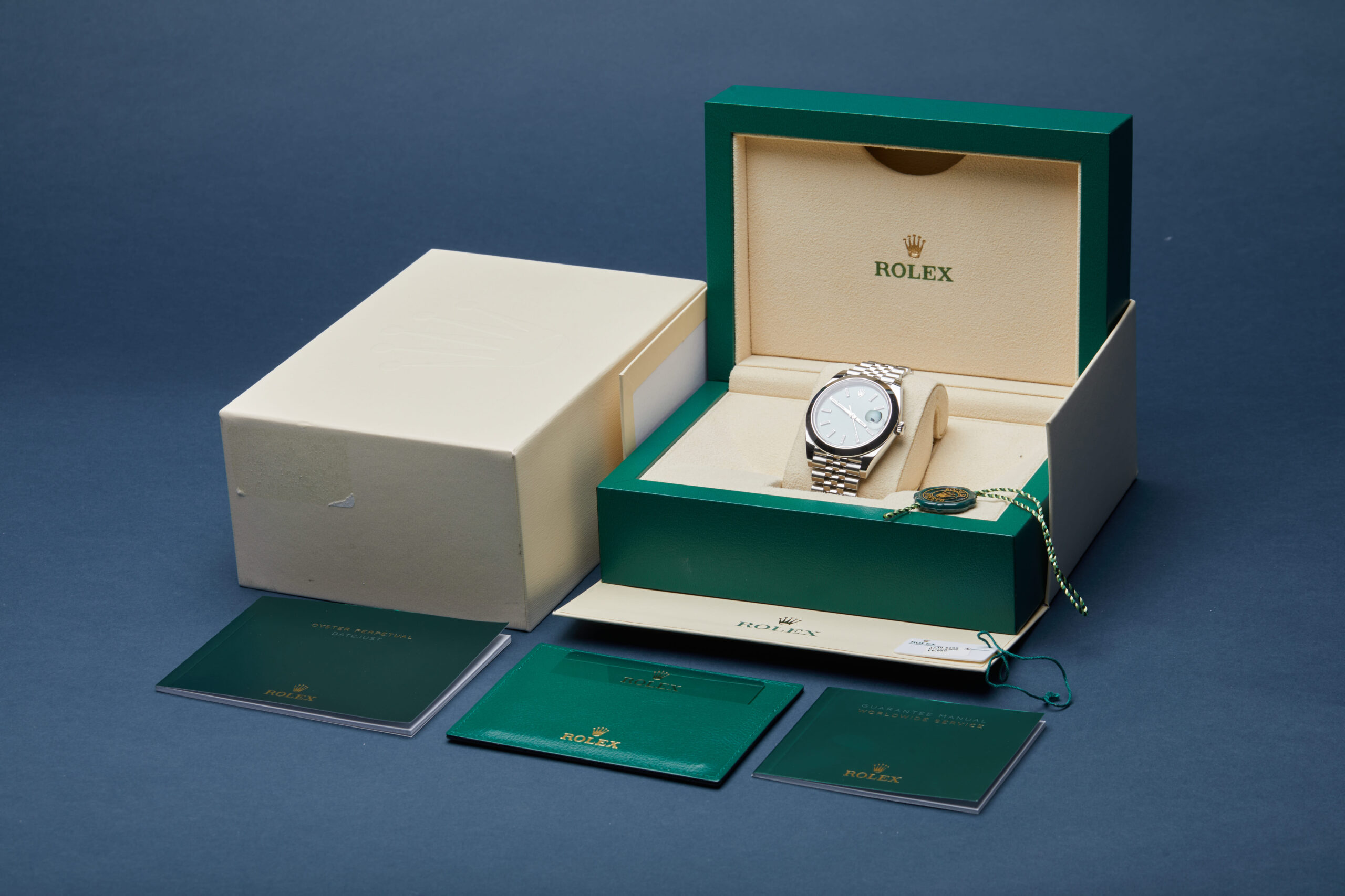 The watch is supplied with its original Rolex box, green leather wallet, manuals, 2x swing tags and warranty card dated Q2 2023.