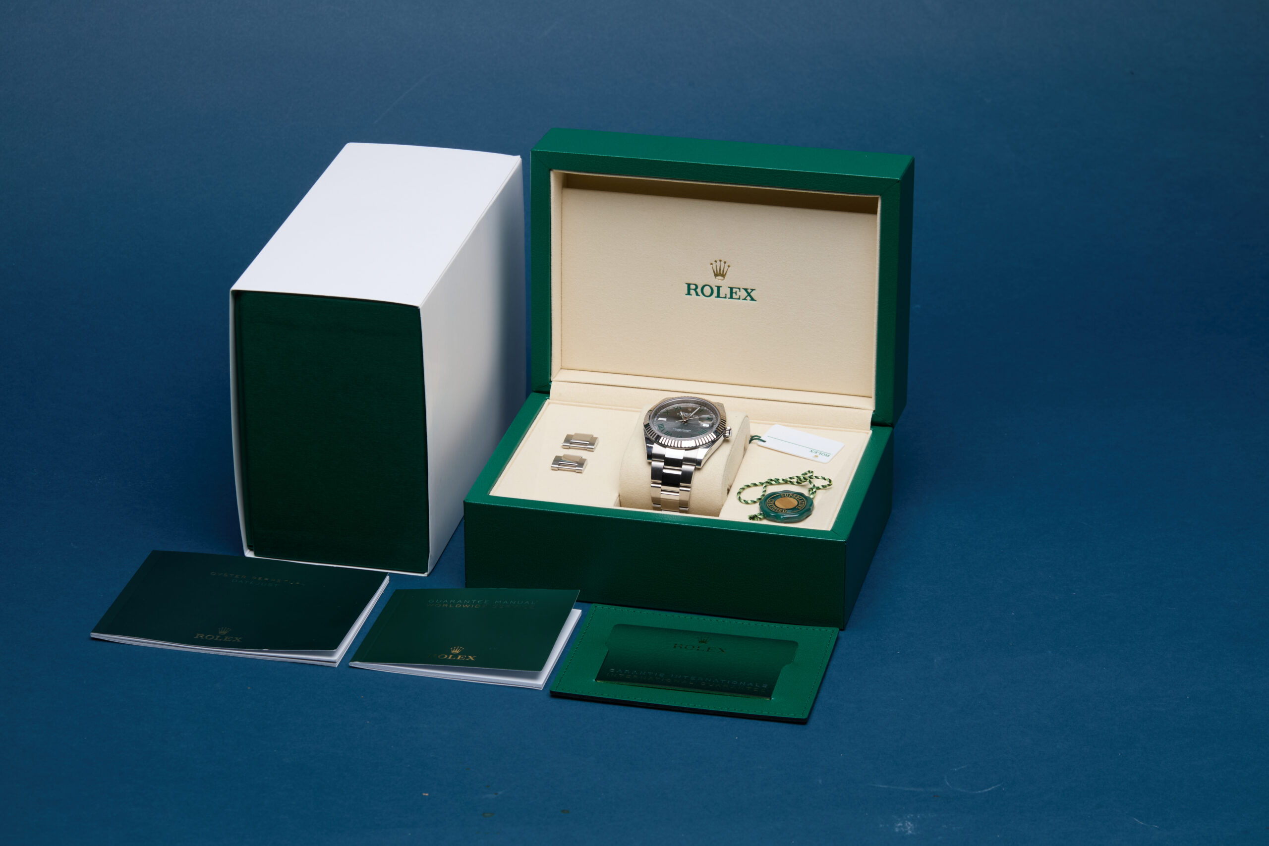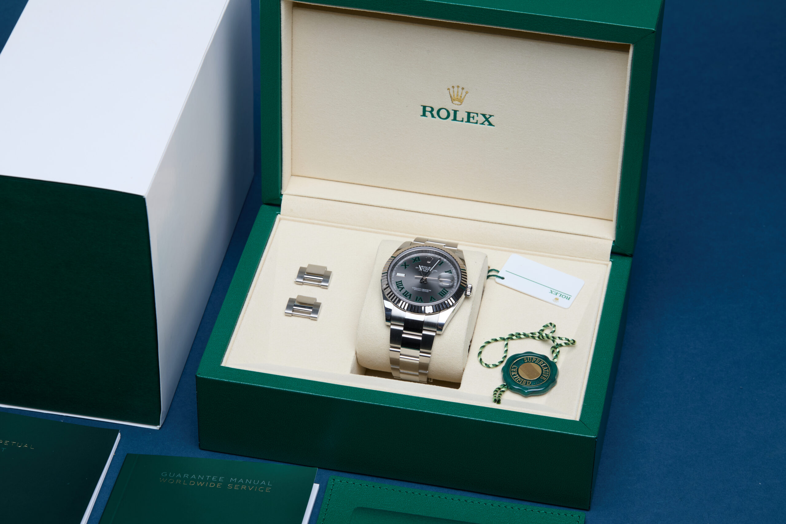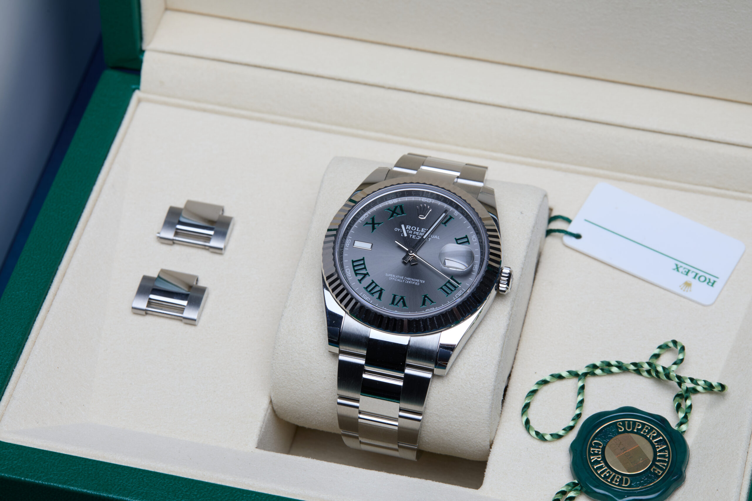 The watch is supplied with its original Rolex box, green leather wallet, manuals, 2x swing tags and warranty card dated Q3 2025.