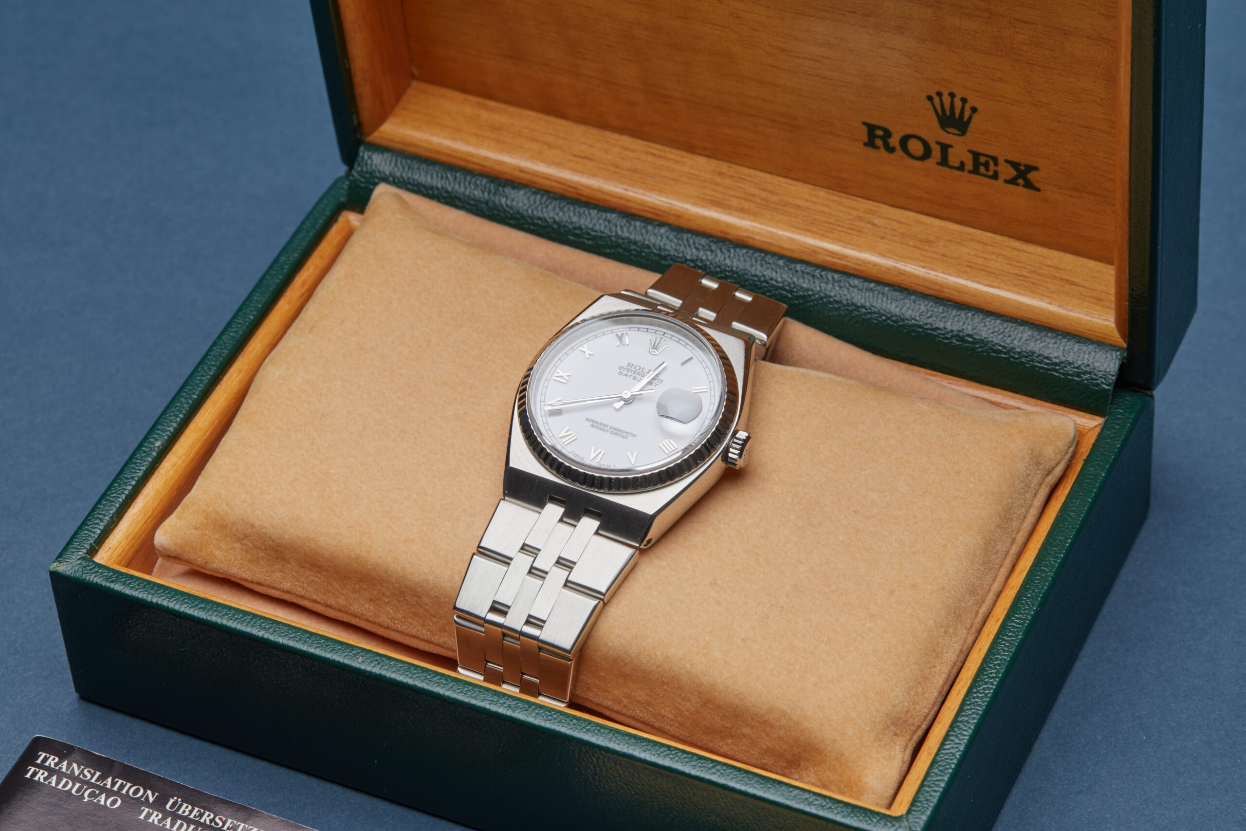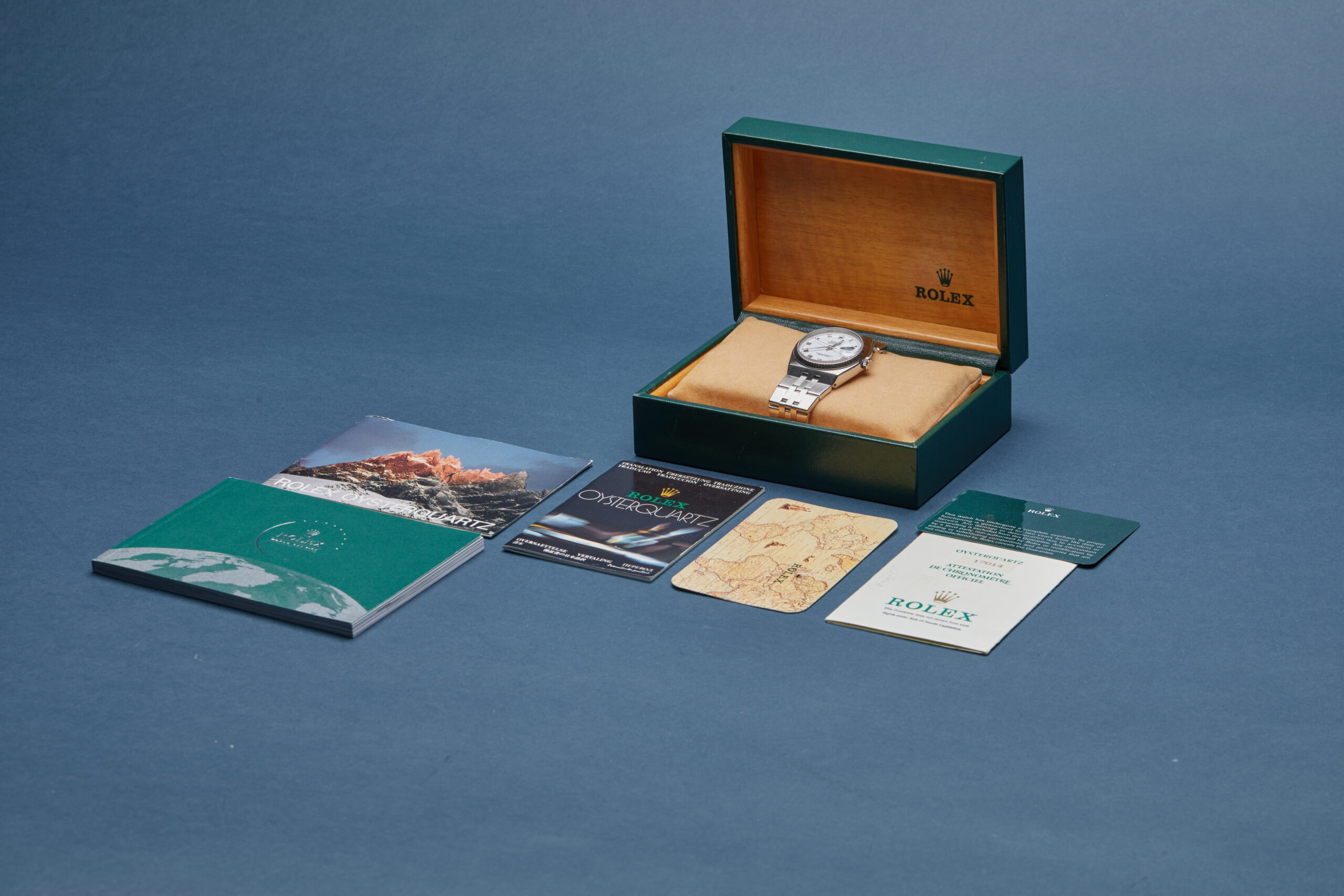 The watch is supplied with its original Rolex box (no outer box), manuals, Rolex calendar service card dated 2023 and warranty certificate dated Q3 1990 (UK supplied).